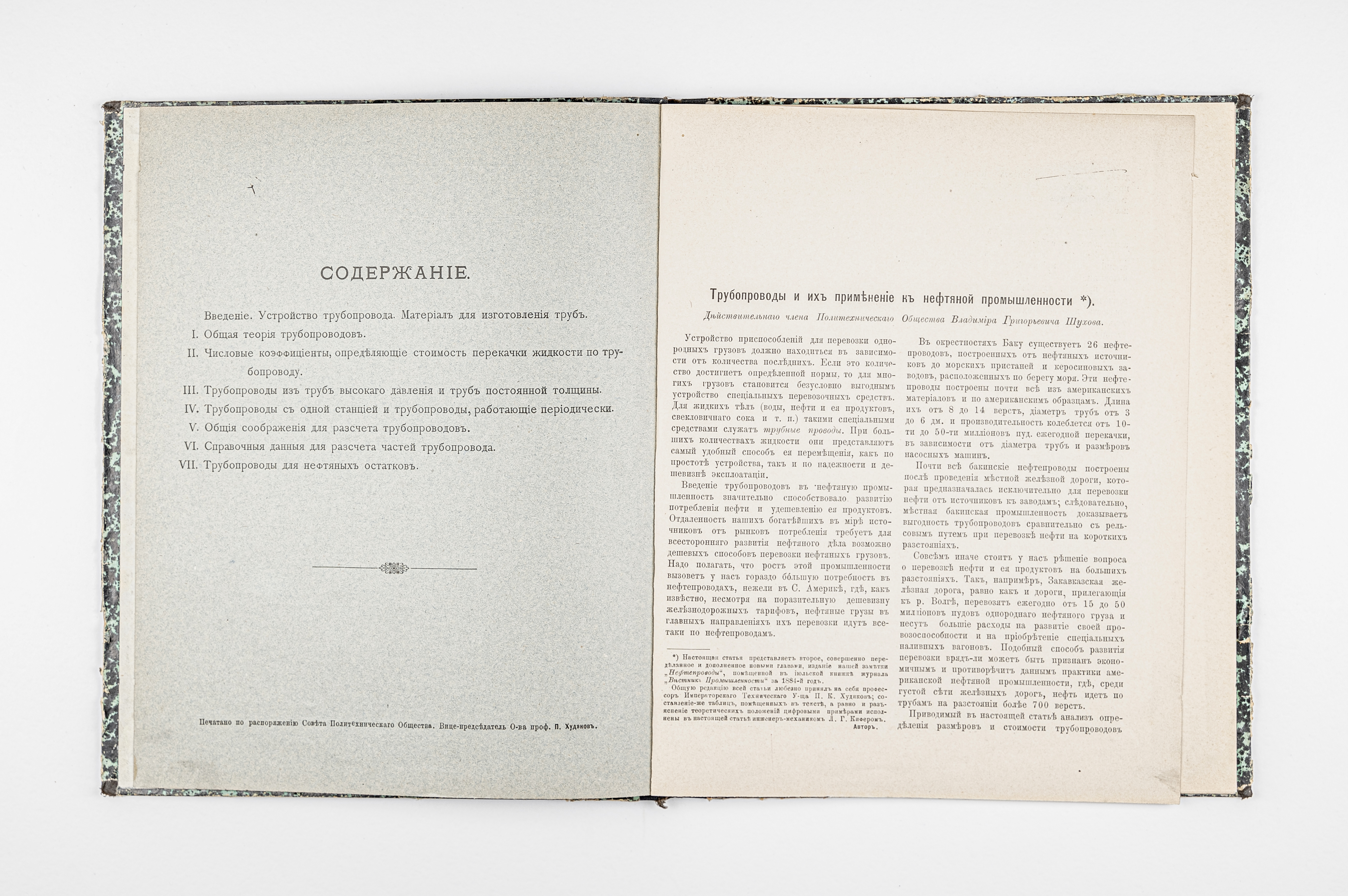 Шухов, В. Г. (1853-1939). Трубопроводы и их применение к нефтяной промышленности / [Соч.] Инж.-мех. В. Г. Шухова, д. чл. Политехн. о-ва; Политехн. о-во, сост. при Техн. уч-ще. – Москва : типо-лит. «Рус. т-ва печ. и изд. дела», 1895. – 37 с. : ил., 1 л. граф. ; 28х23 см.