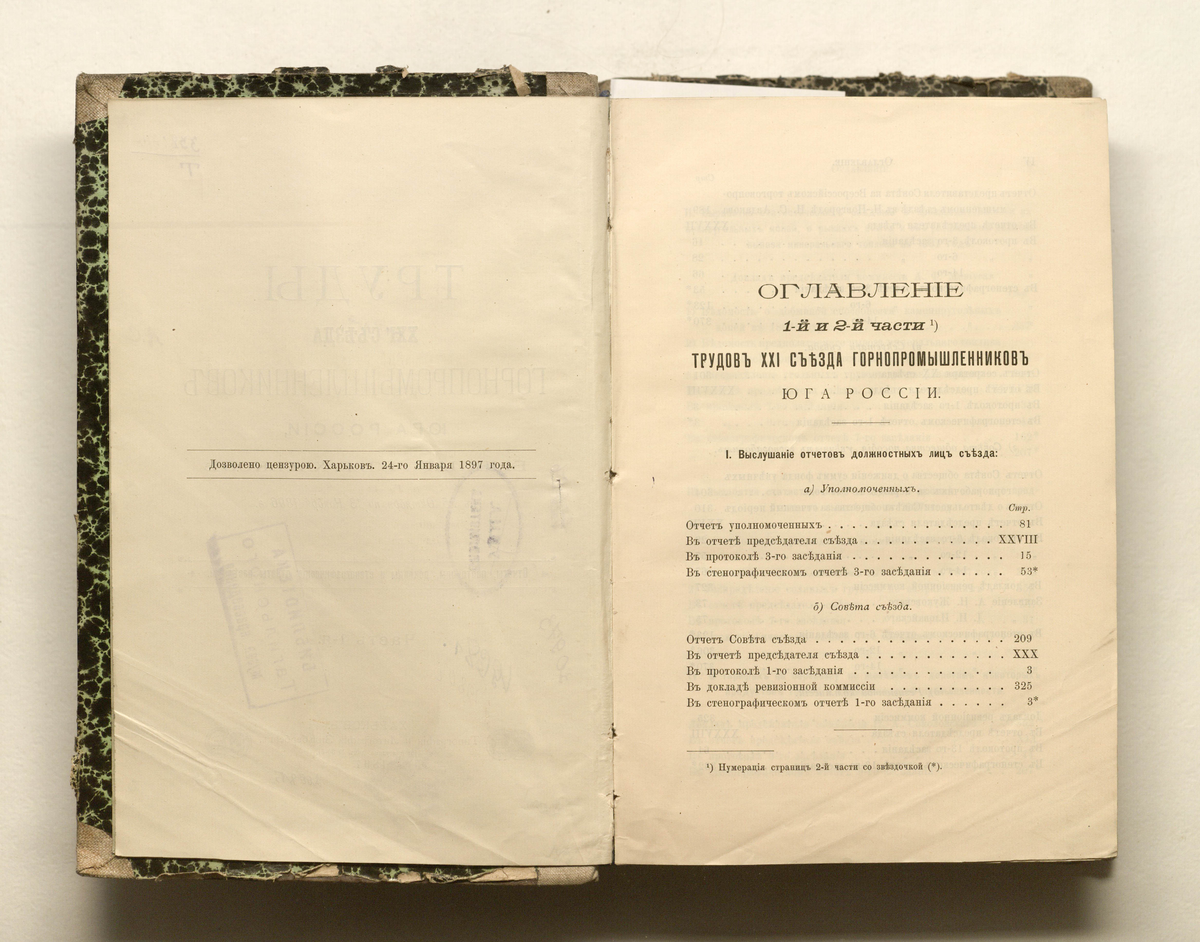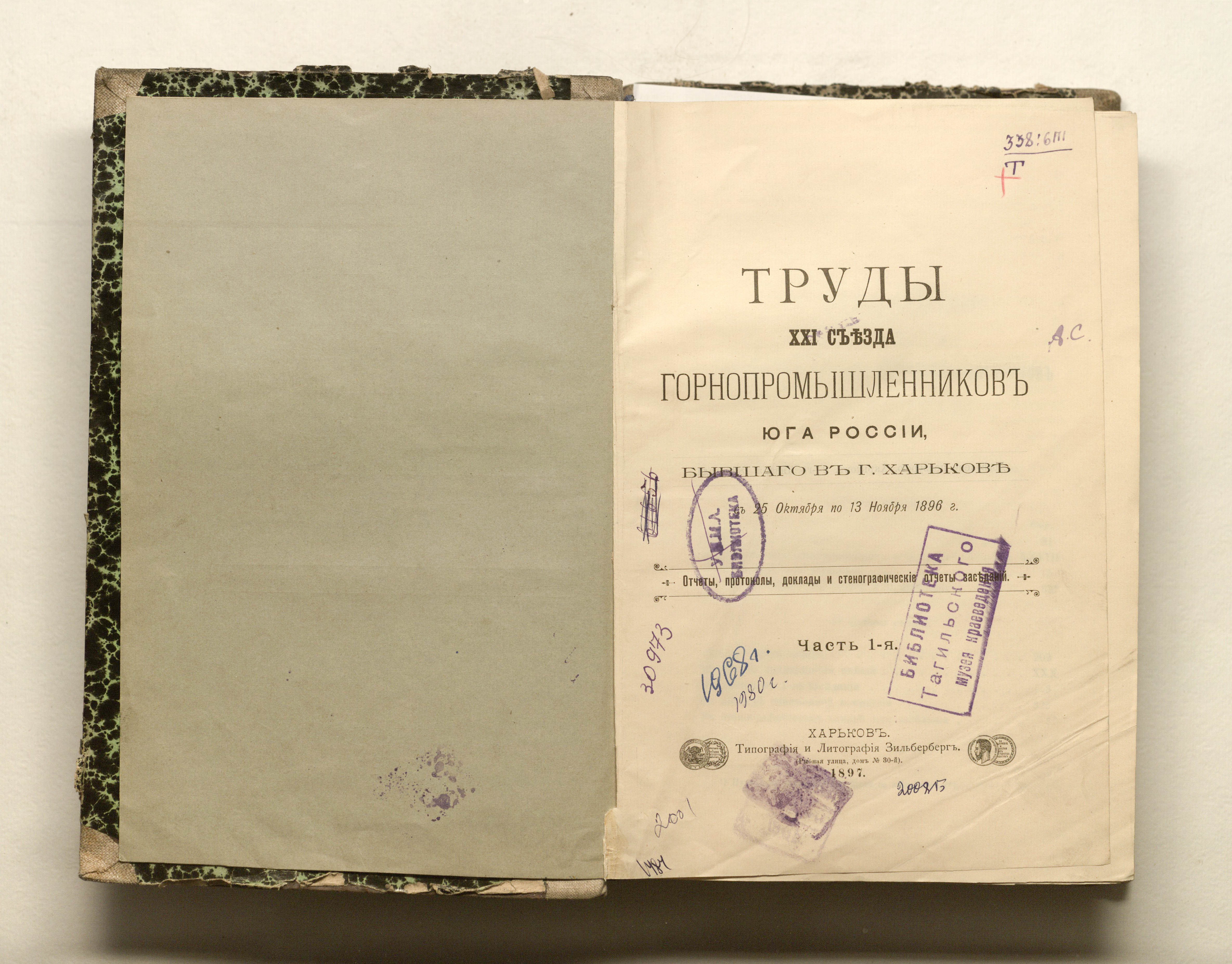 Труды XXI Съезда горнопромышленников Юга России, бывшего в г. Харькове с 25 октября по 13 ноября 1896 г. : ч. 1. — Отчеты, протоколы, доклады и стенографические отчеты заседаний. — [Б. м.] : тип. и лит. Зильберберг, 1897. — LXXIX, 566 с. : 5 л. табл. ; 25х16,5 см.