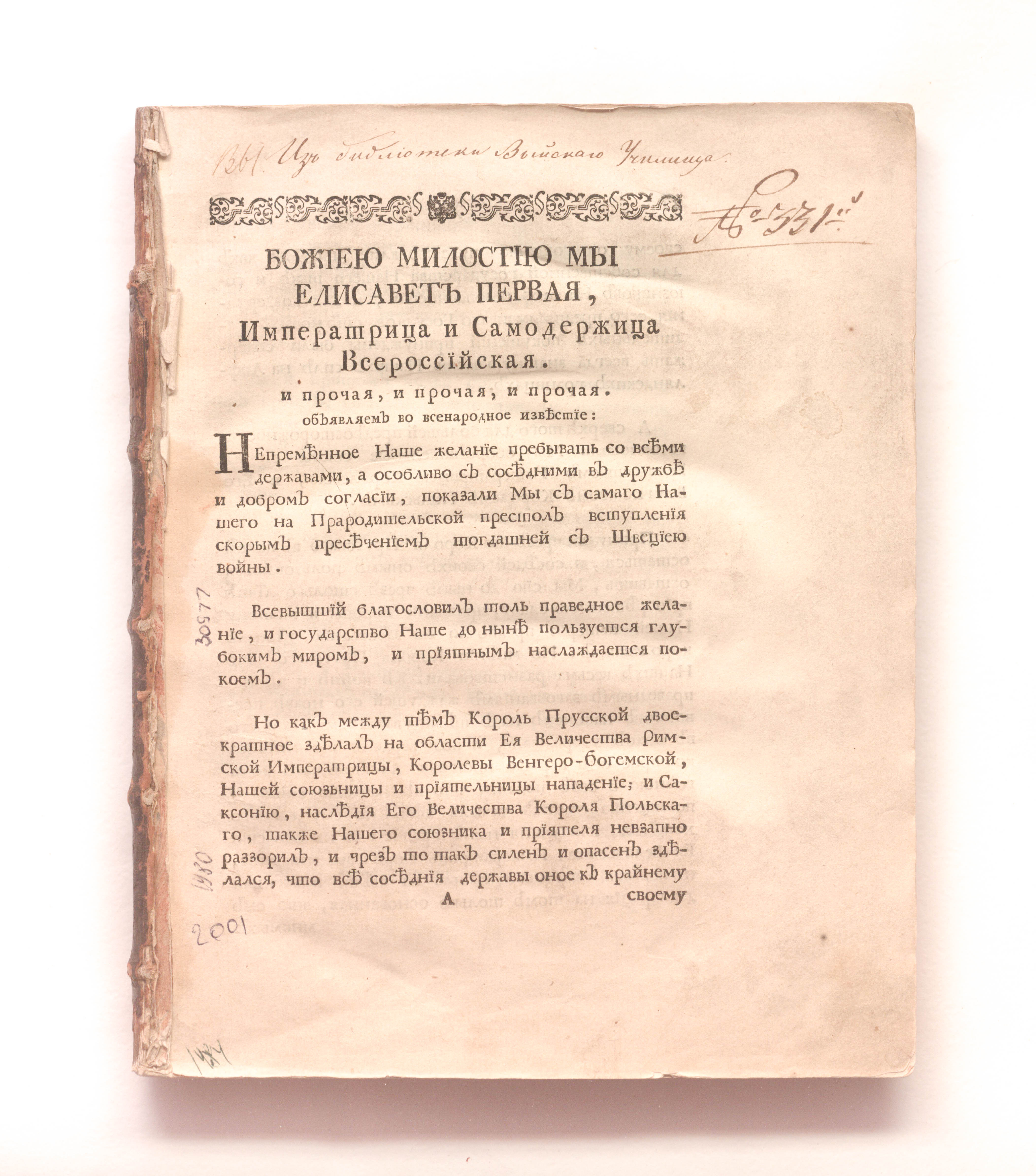 Запись: «Из библиотеки Выйскаго училища № 331" (с. 1).