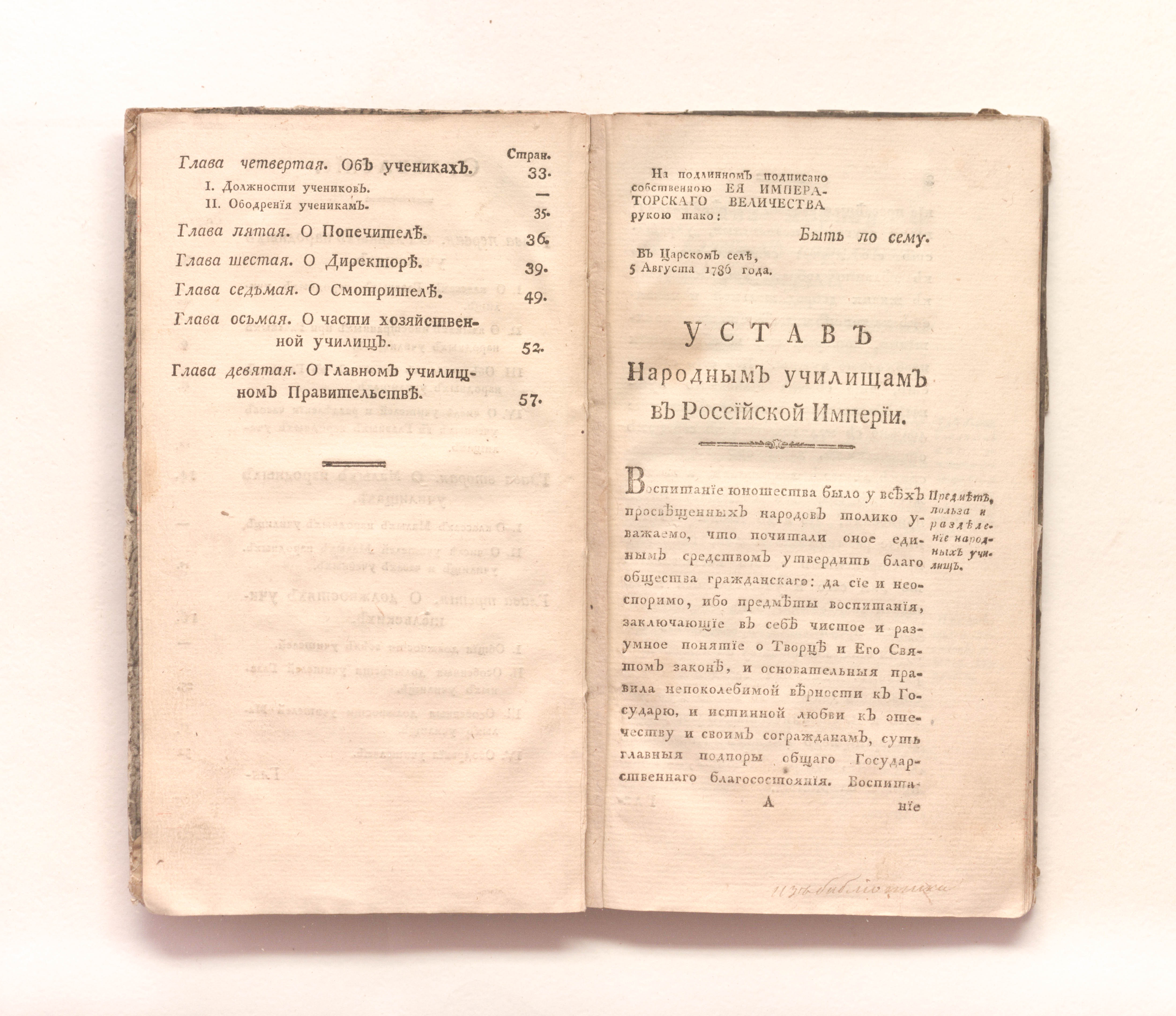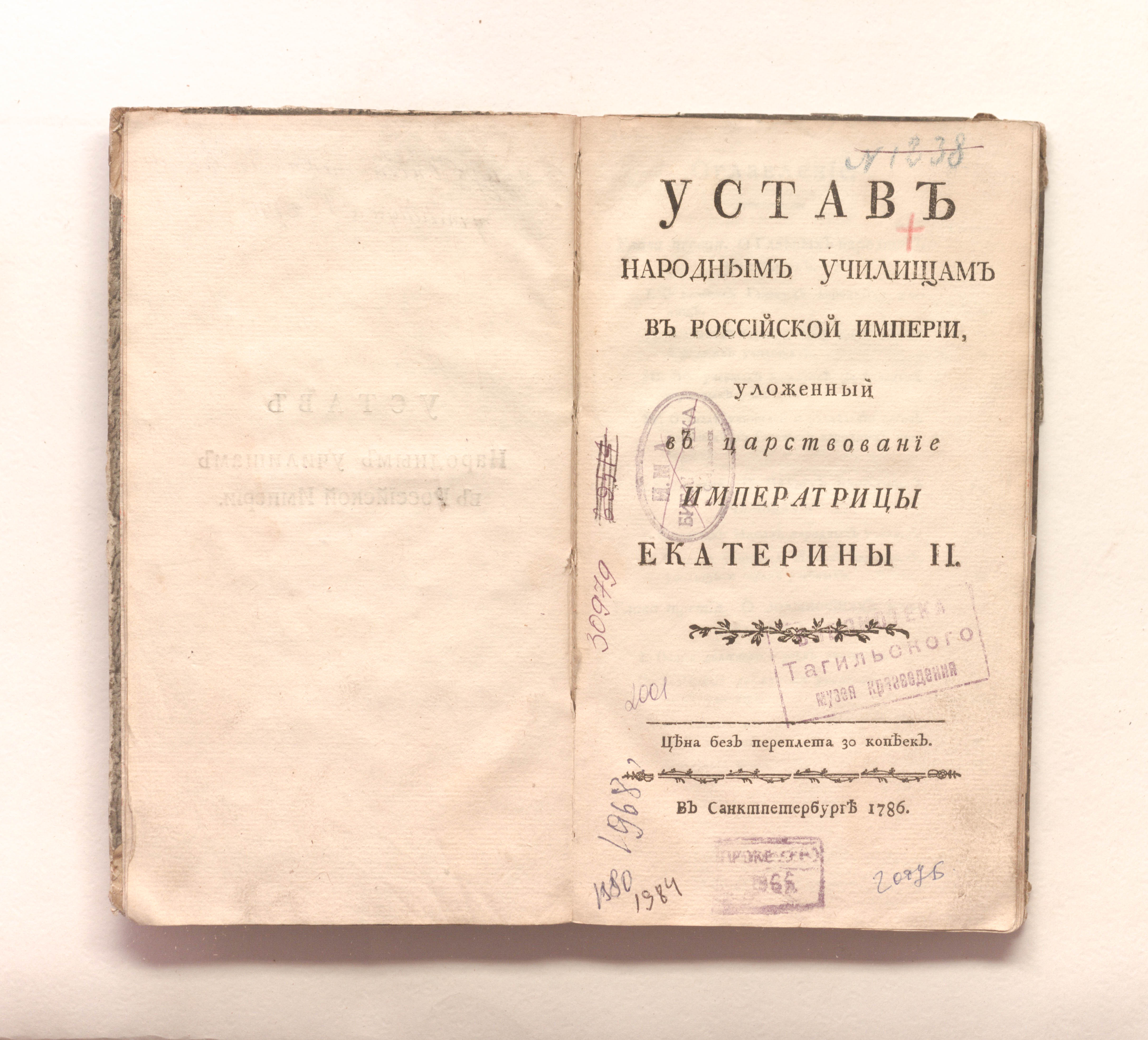 Янкович де Мириево, Федор Иванович (1741-1814). Устав народным училищам в Российской империи : Уложенный в царствование имп. Екатерины II : [В Царском Селе 5 августа 1786 года] / Ф. И. Янкович де Мириево. — Санкт-Петербург : [Типография Брейткопфа], 1786. — 122 с. : табл. ; 21х11,5 см.