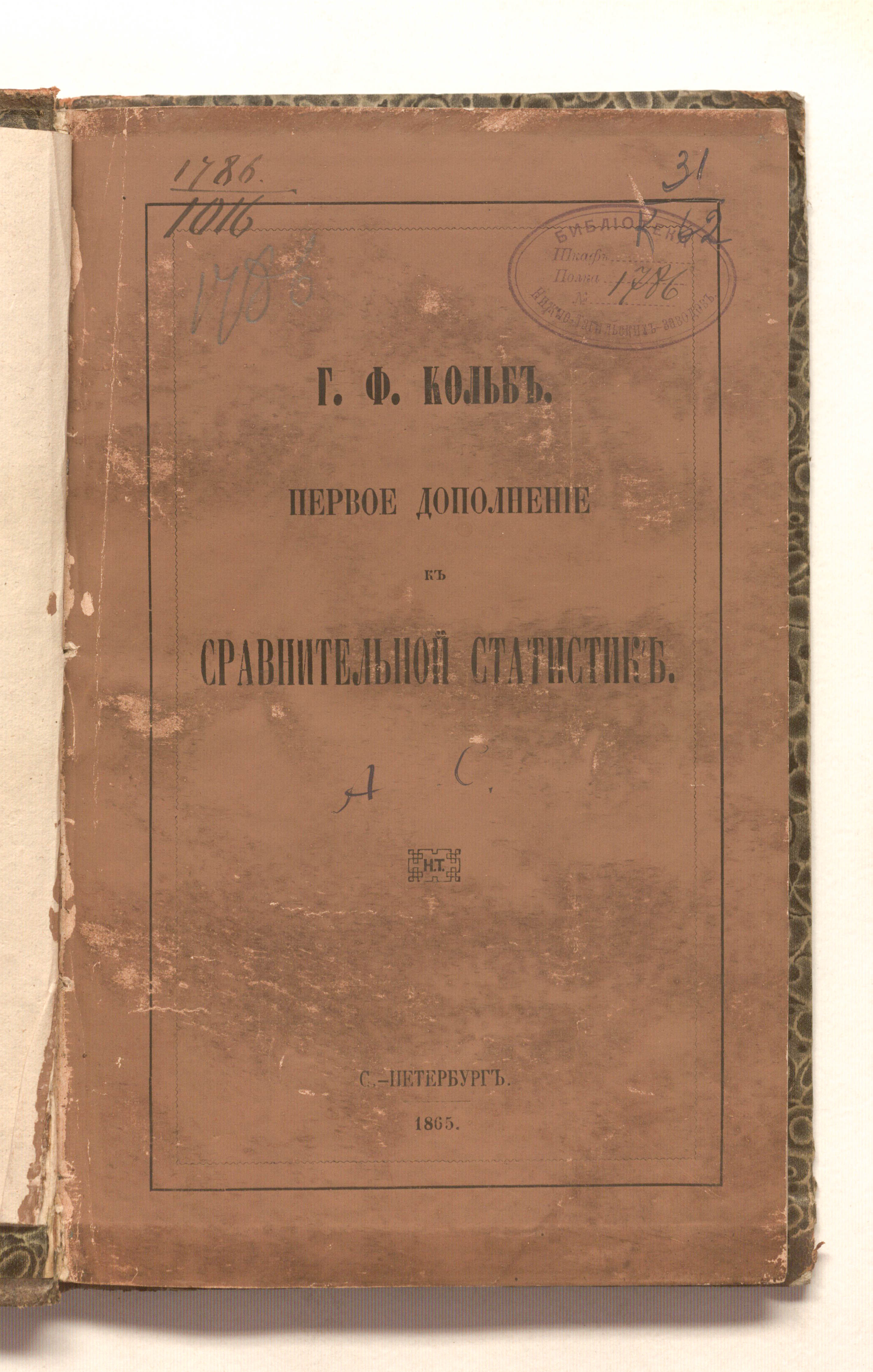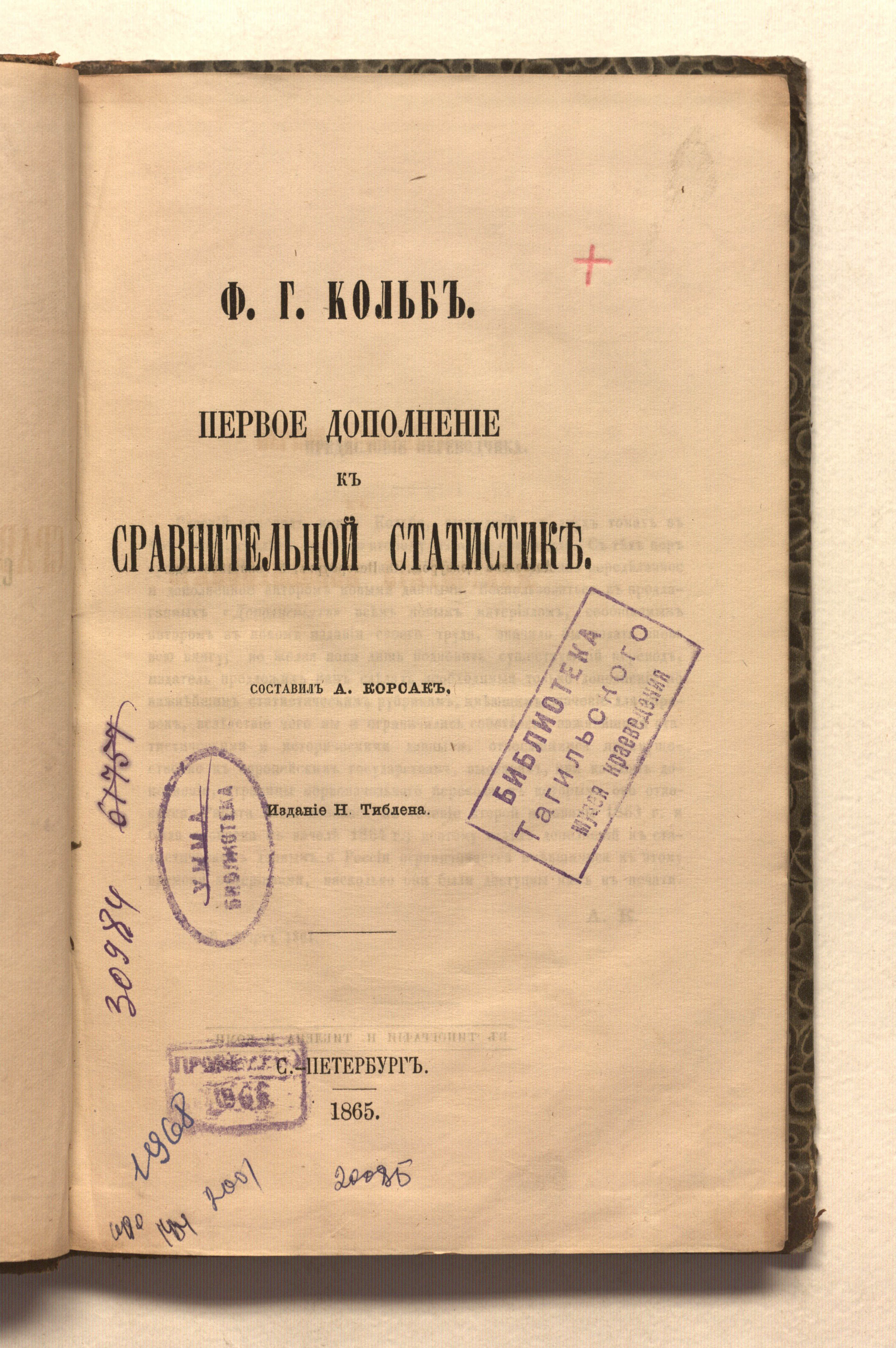 Первое дополнение к сравнительной статистике / Ф. Г. Кольб. — Санкт-Петербург : издание Н. Тиблена, 1865. — 263 с. 24,5х15 см.