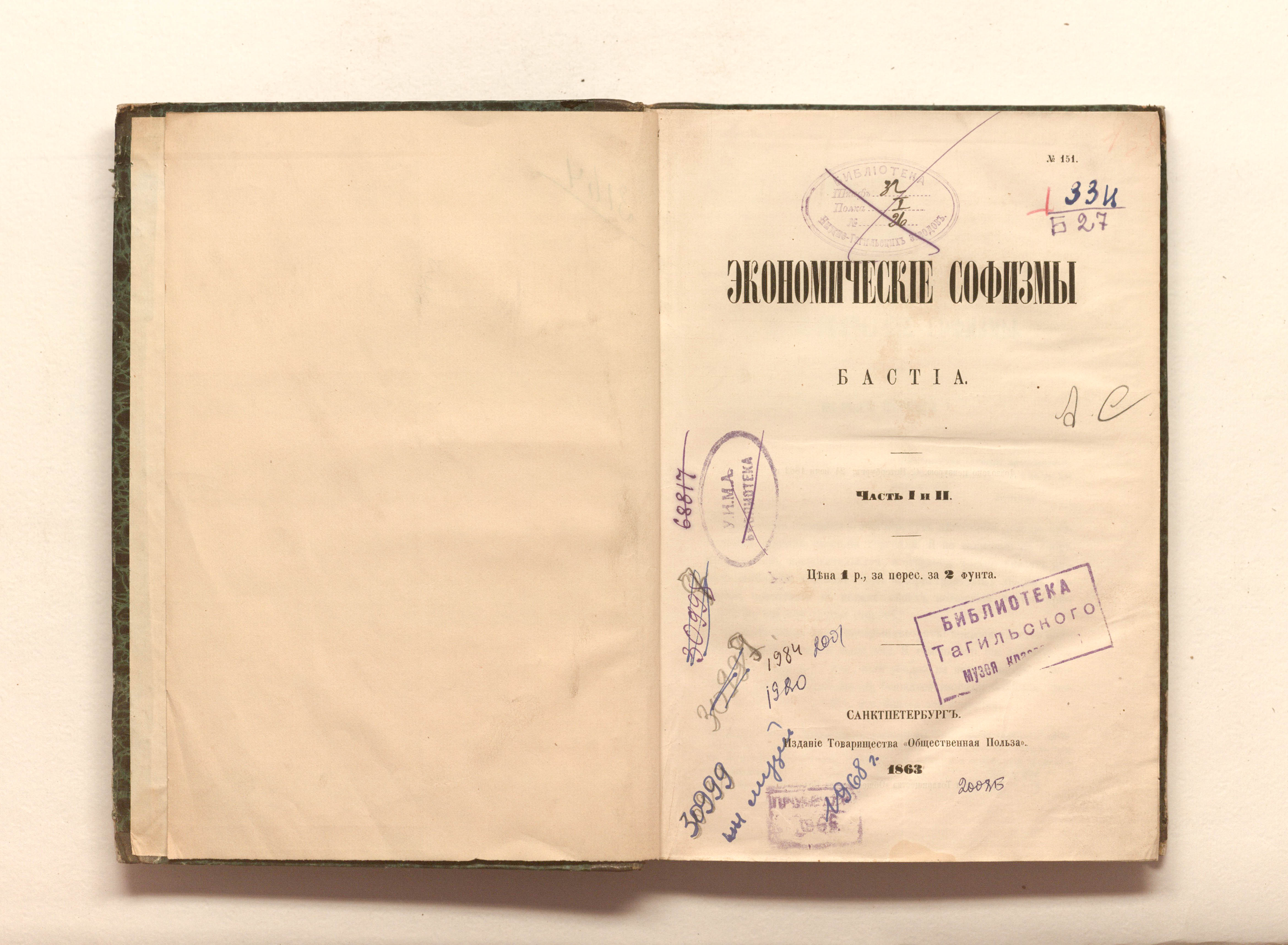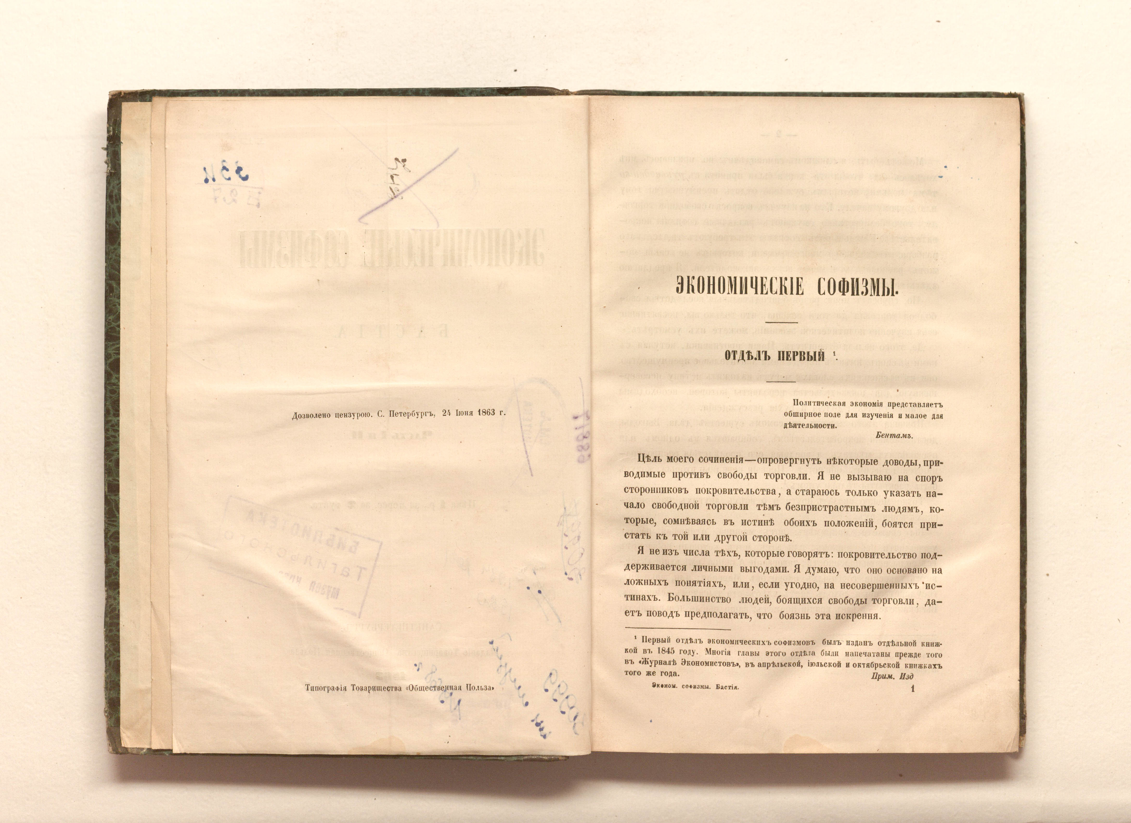 Бастиа, Клод Фредерик (1801-1850). Экономические софизмы / [Соч.] Бастиа. Ч. 1-2. — Санкт-Петербург : Обществ. польза, 1863. — [2], 281 с. ; 23х16 см.