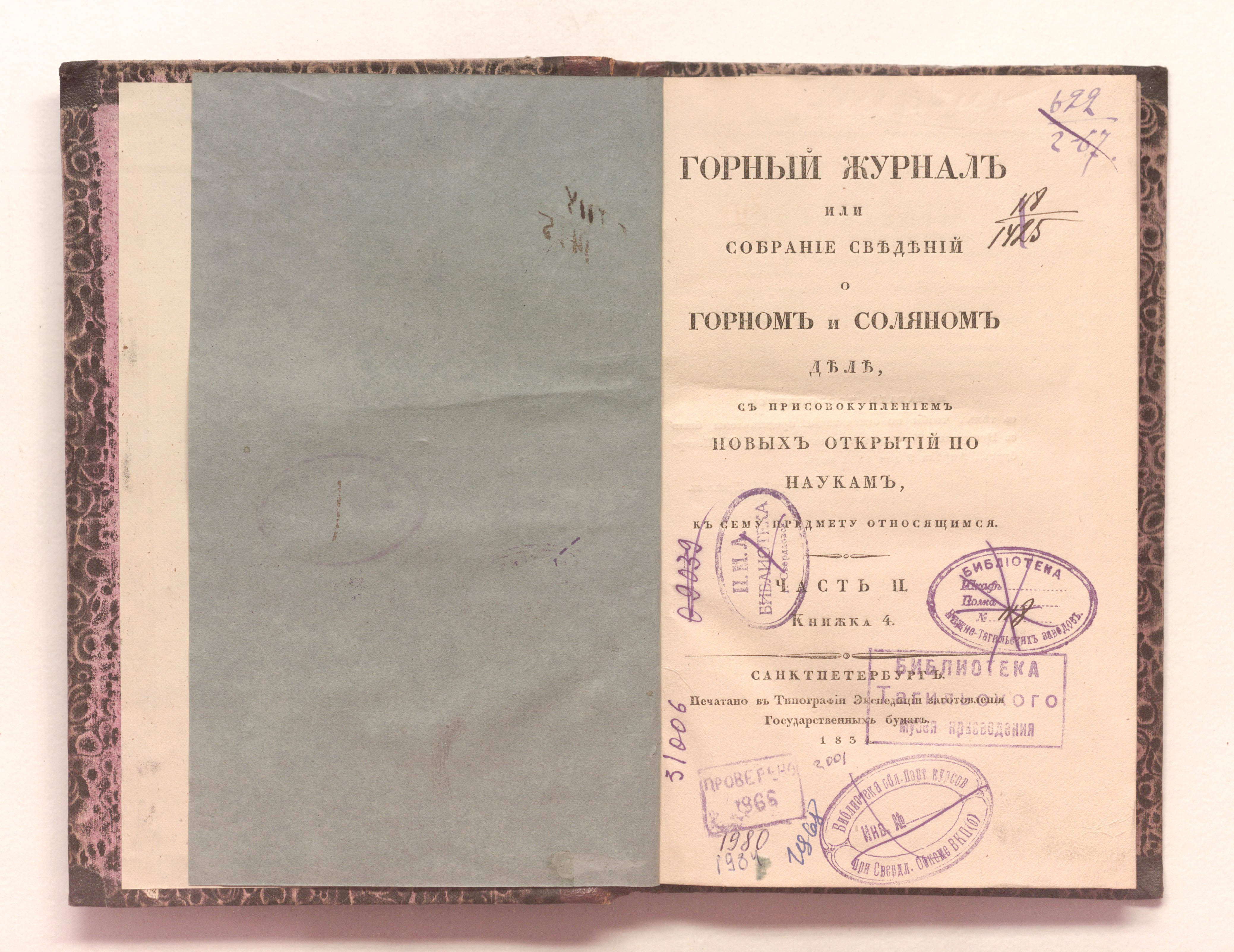 Горный журнал или Собрание сведений о горном и соляном деле, С присовокуплением новых открытий по наукам, к сему предмету относящимся. – Санкт-Петербург : печатано в Военной типографии Главнаго штаба его императорскаго величества ; в типографии Экспедиции заготовления государственных бумаг, 1825 - 1918.