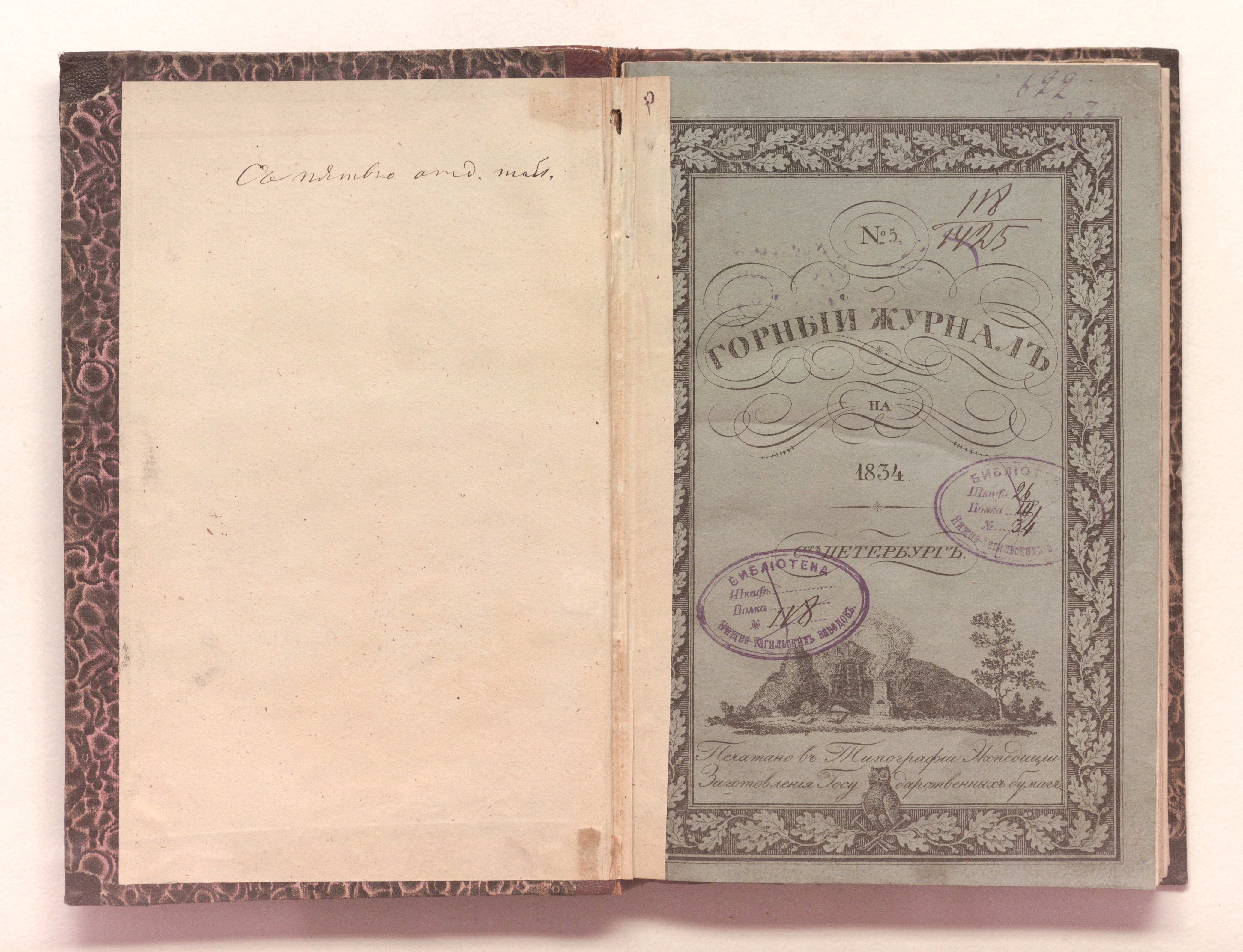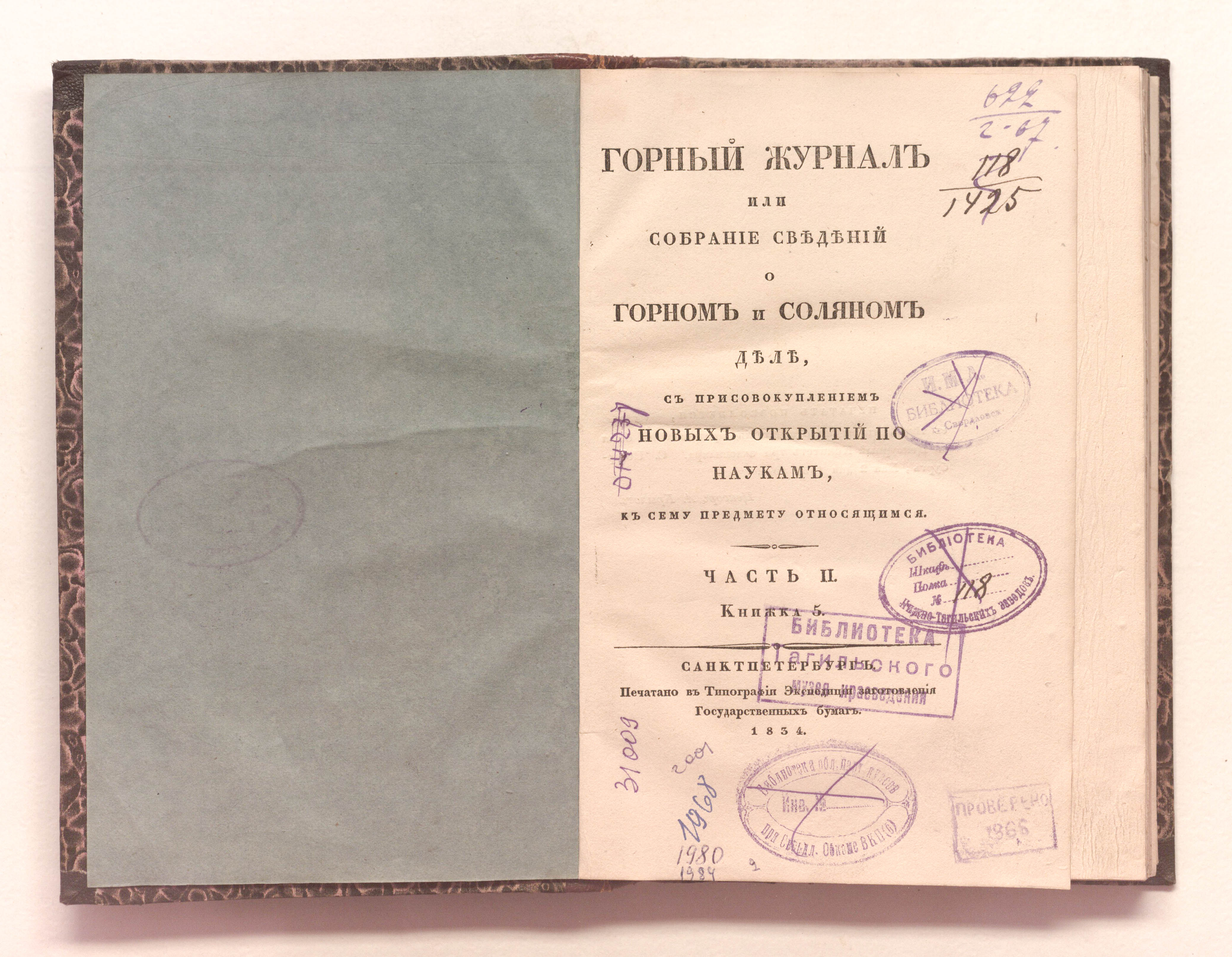 Горный журнал или Собрание сведений о горном и соляном деле, С присовокуплением новых открытий по наукам, к сему предмету относящимся. – Санкт-Петербург : печатано в Военной типографии Главнаго штаба его императорскаго величества ; в типографии Экспедиции заготовления государственных бумаг, 1825 - 1918.