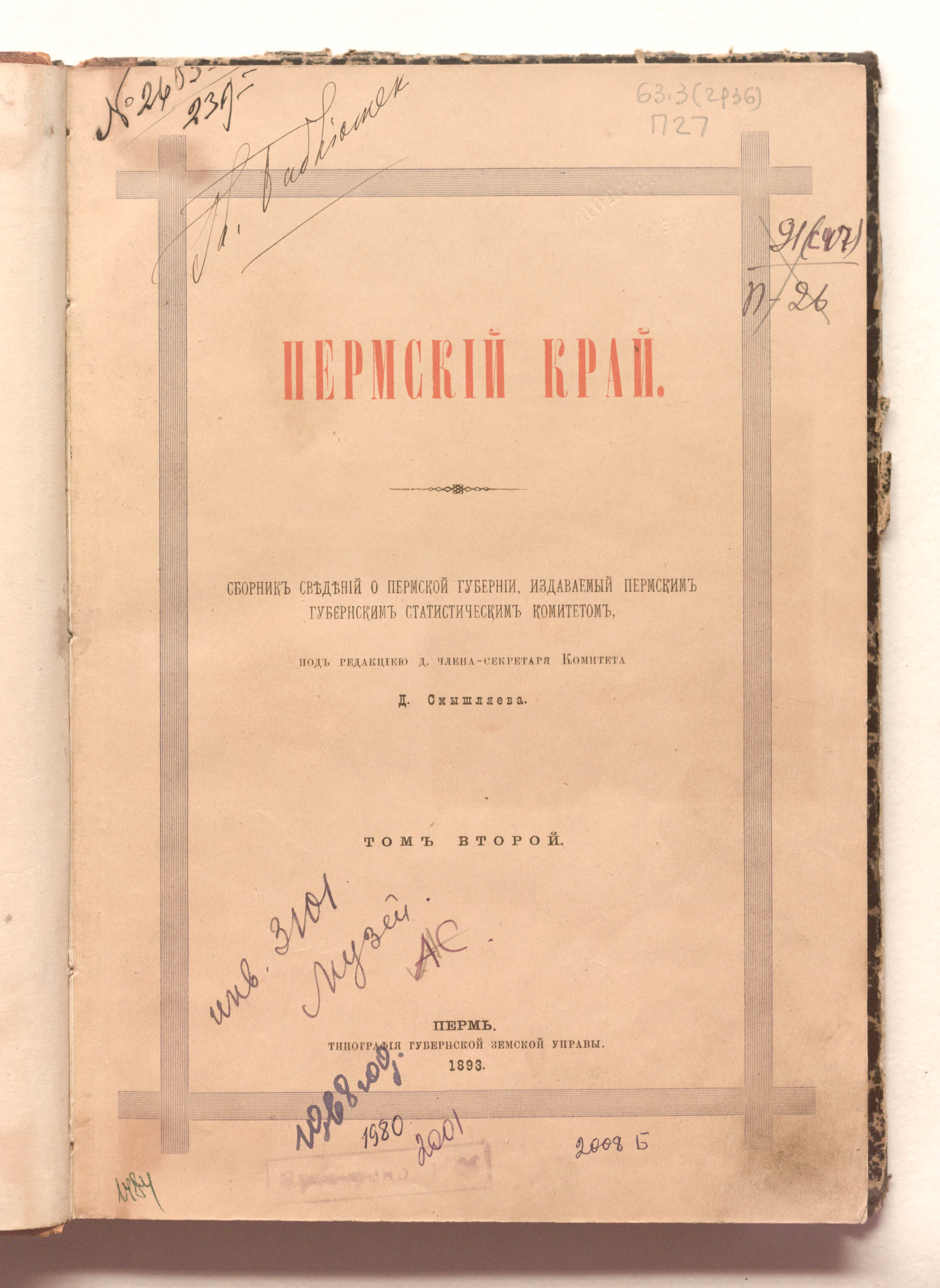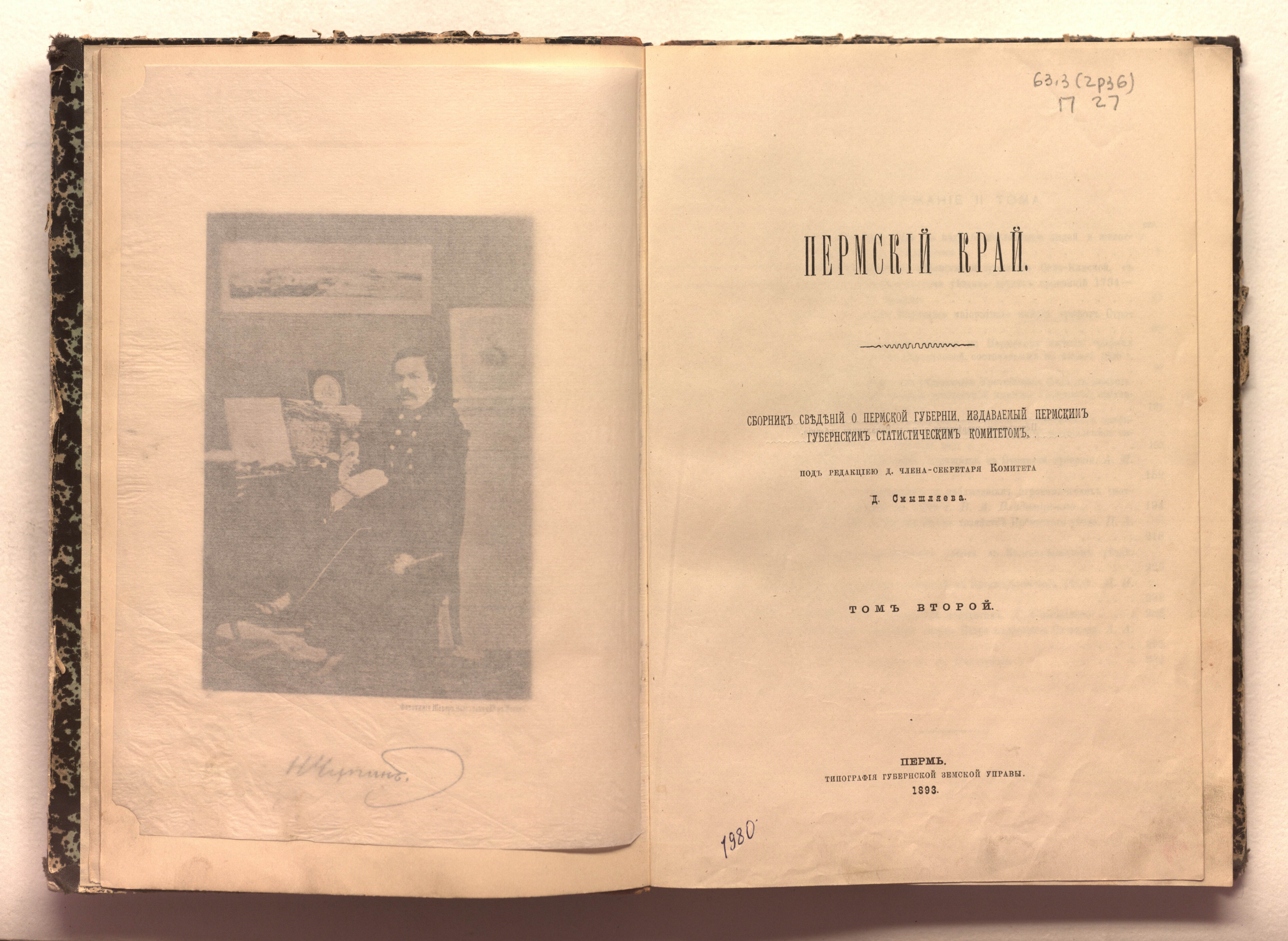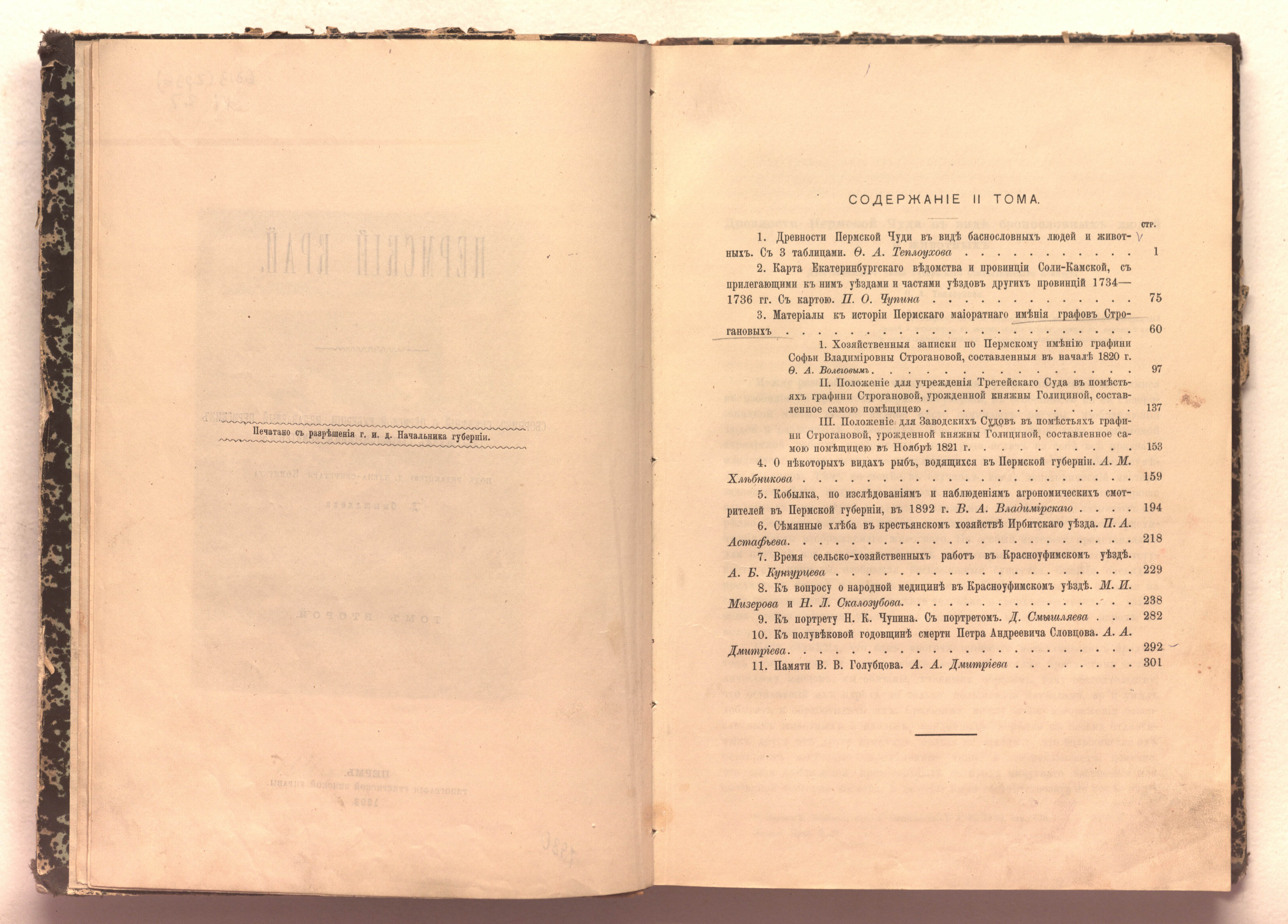 Пермский край. Сборник сведений о Пермской губернии, издаваемый Пермским губернским статистическим комитетом : научное издание / ред. Д. Д. Смышляев. – Пермь : Типография Губернской Земской управы, 1892 - 1895. – Том второй. – Пермь : Типография Губернской Земской управы, 1893. – 303 с. : ил. ; 25х18 см.