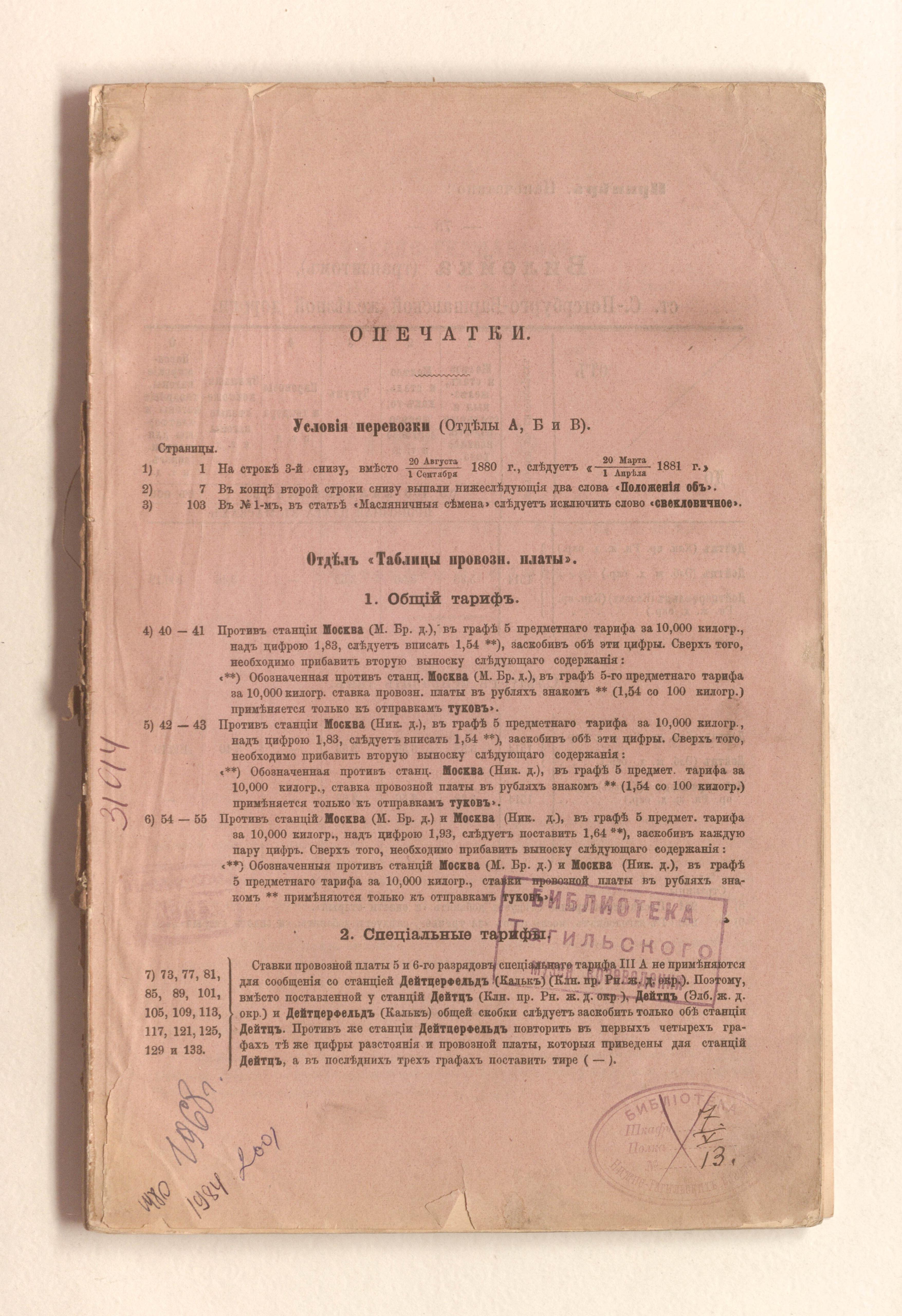Тариф прямого русско-германского товарного сообщения / Русско-Германский железно-дорожный союз. — 2-е изд. — Санкт-Петербург : Типография братьев Шумахер, 1883. — 140, [2] с. : табл. ; 28х18 см.