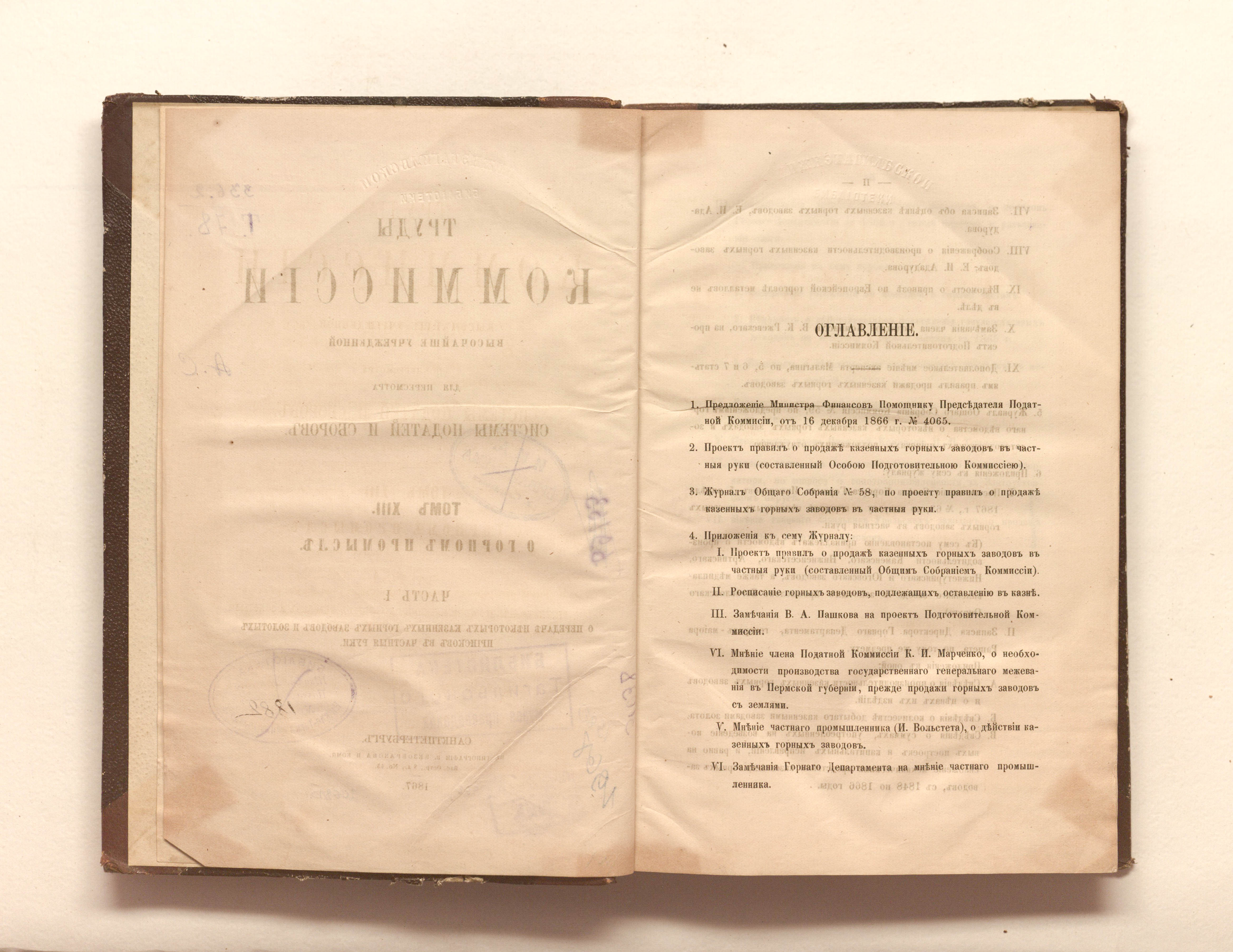 Т. 13: О горном промысле. Ч. 1. О передаче некоторых казенных горных заводов и золотых приисков в частные руки. — 1867. — Разд. Паг. ; 24,5х16,5 см.