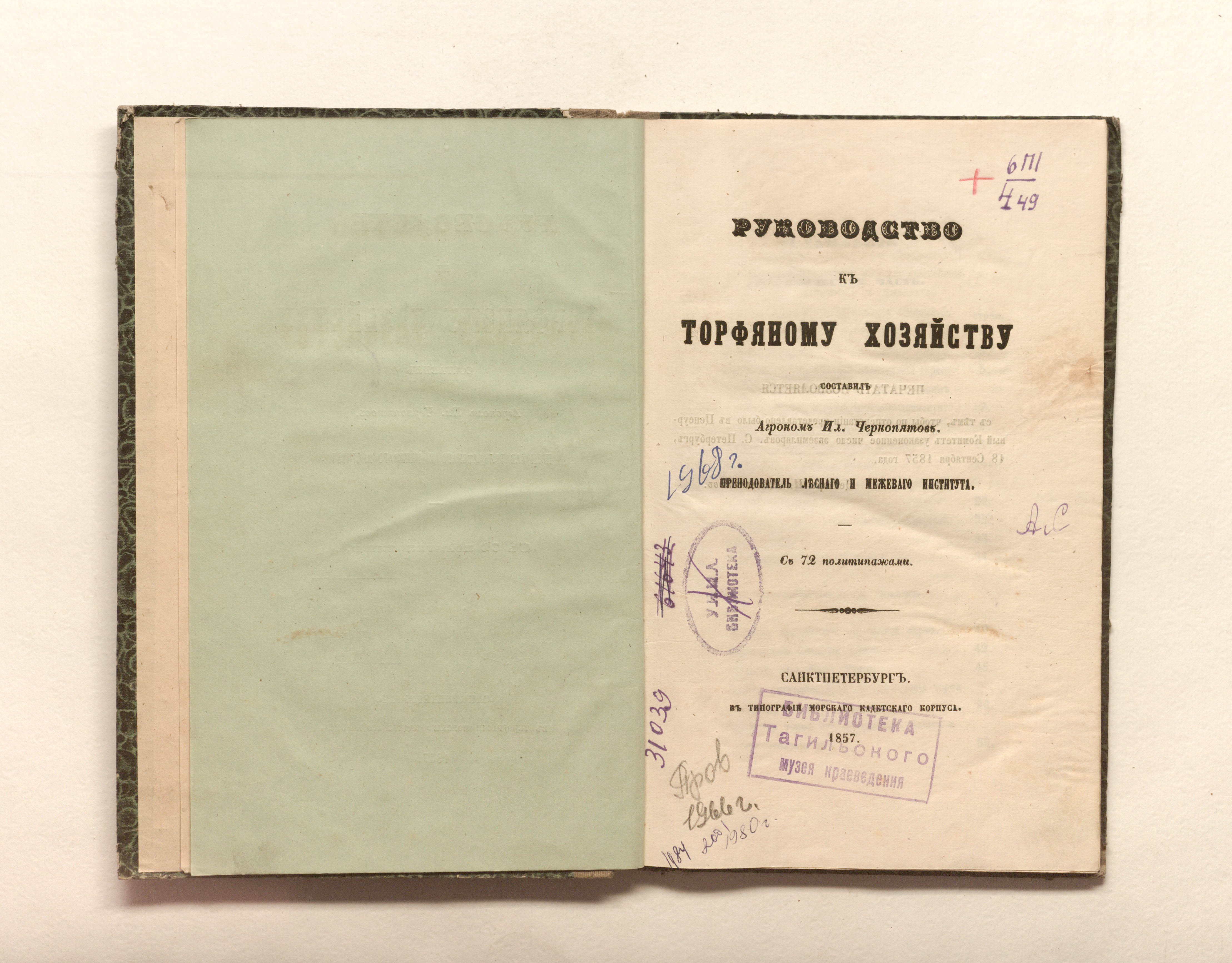 Чернопятов, Илья Никитич (1822-1879). Руководство к торфяному хозяйству : с 72 политипажами / сост. агроном Илья Чернопятов, преподаватель Лесного и Межевого института. — Санкт-Петербург : Тип. Морского кадетского корпуса, 1857. — [4], 154 с. ; 23х15 см.