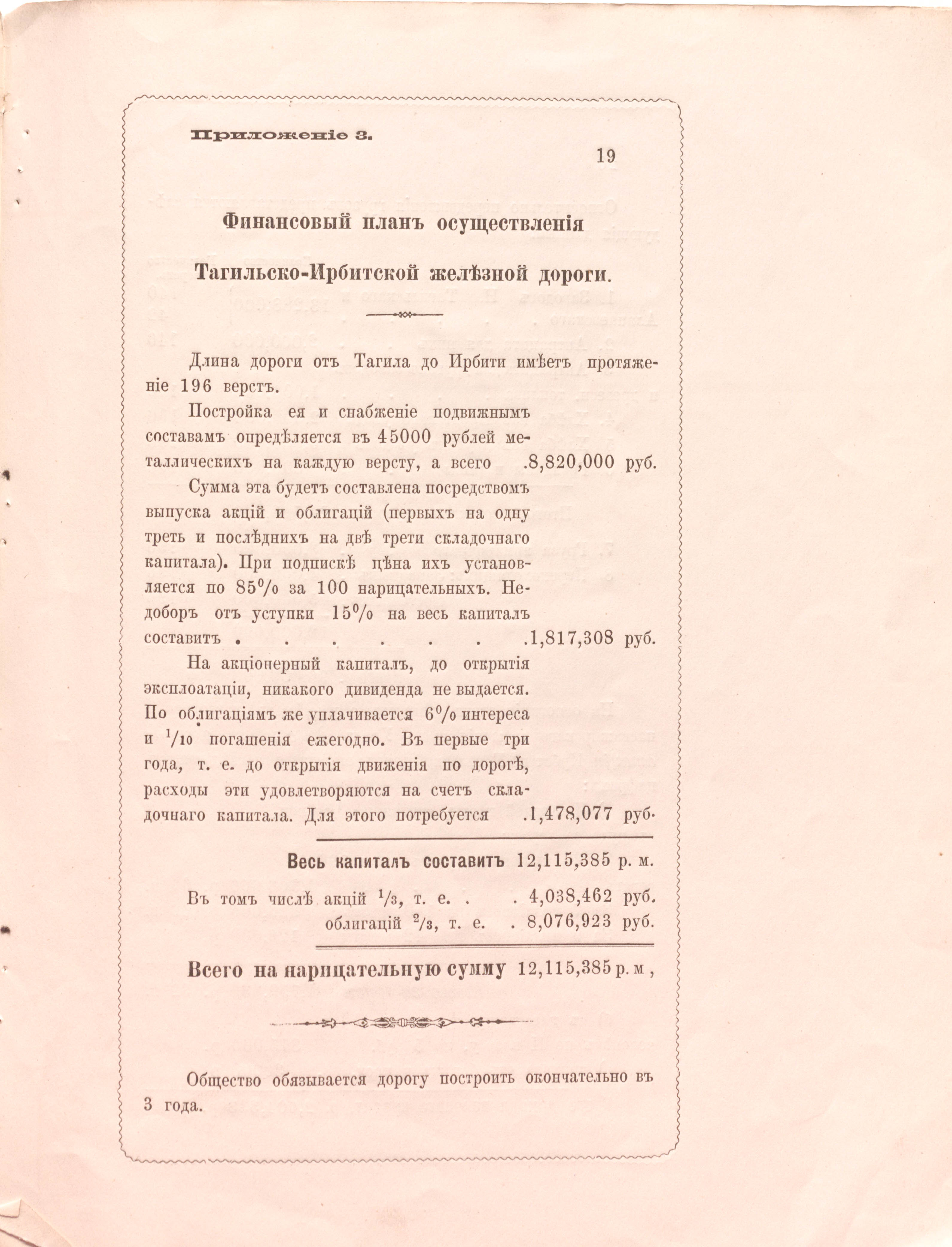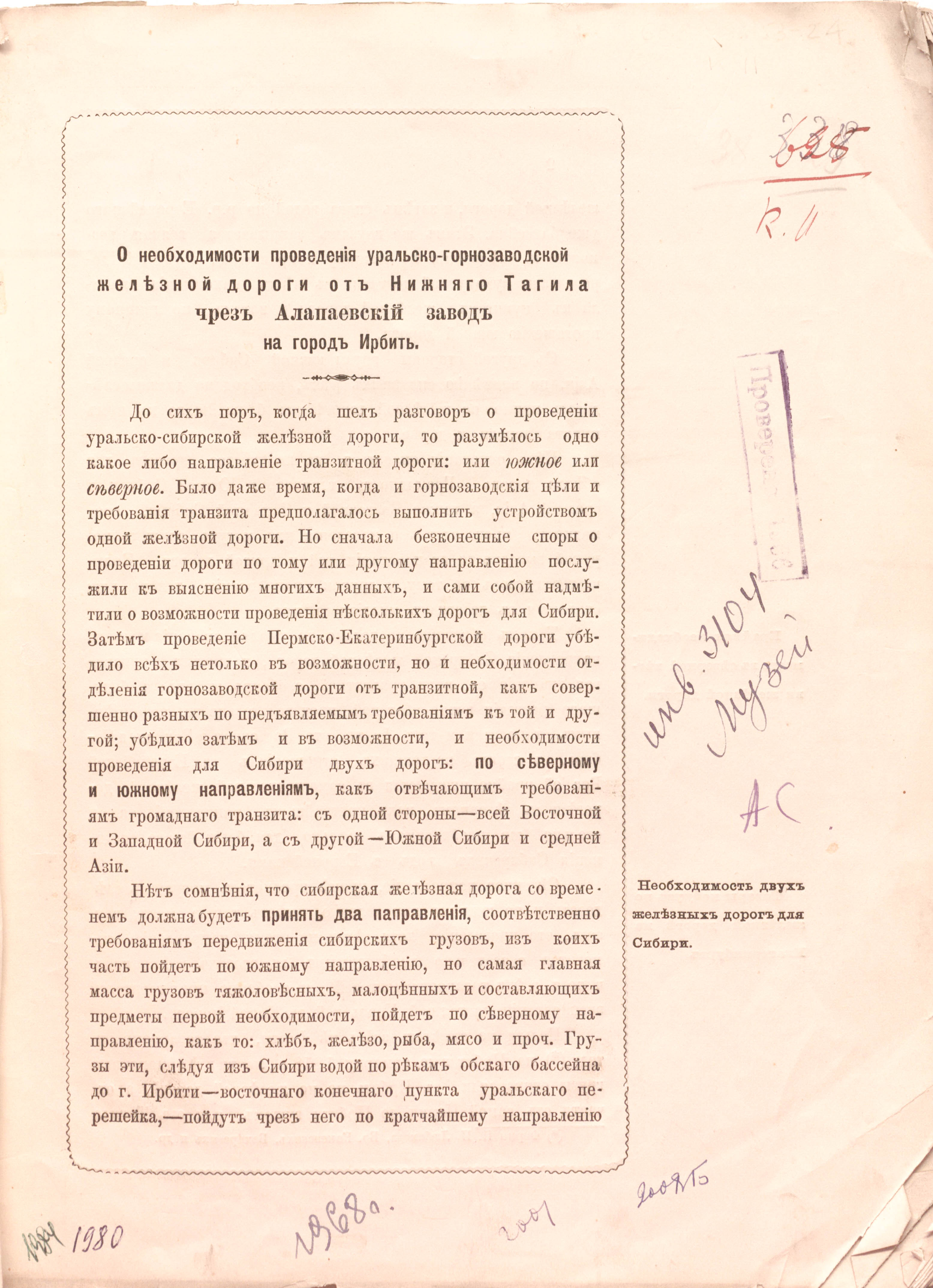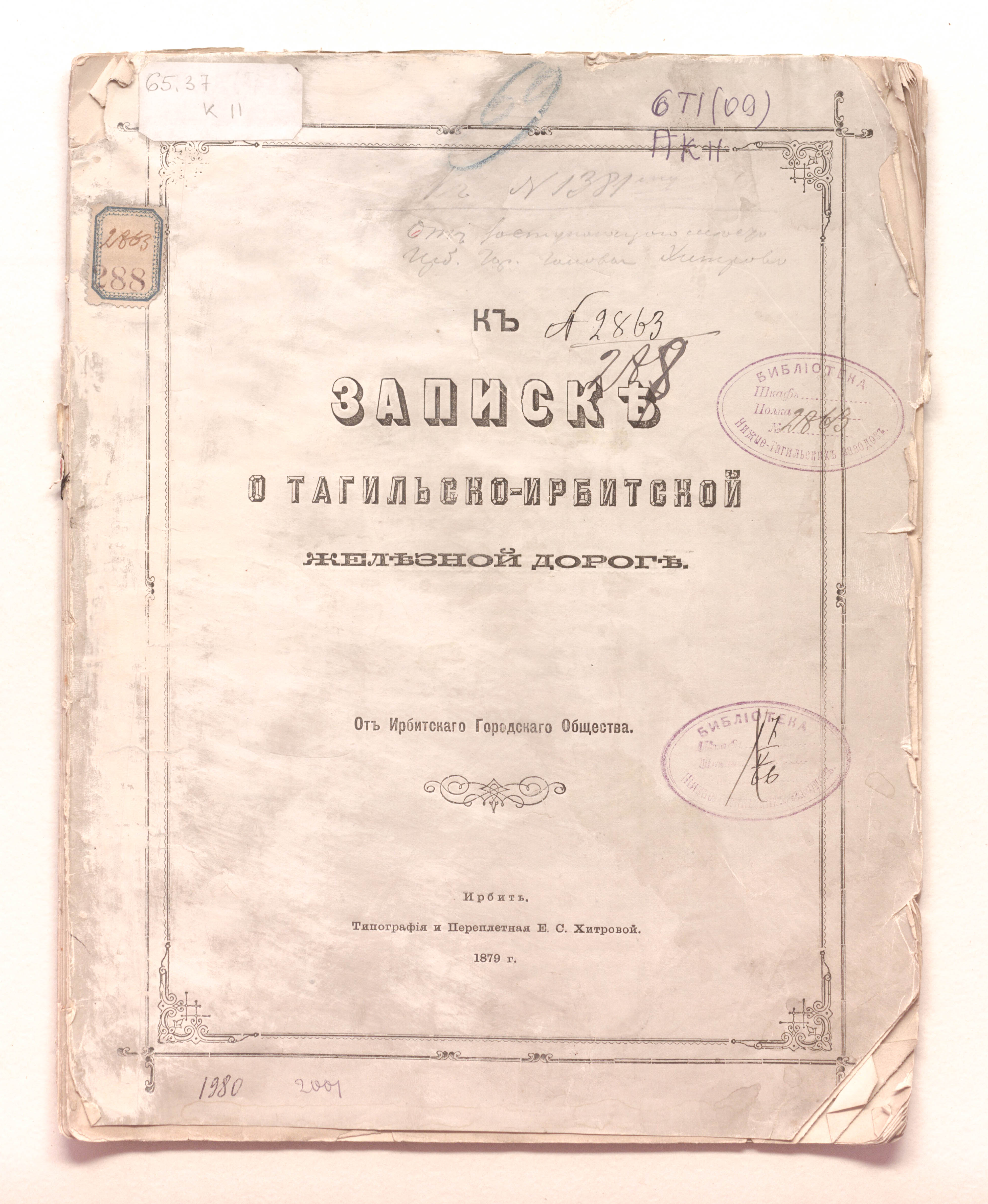К записке о Тагильско-Ирбитской железной дороге / от Ирбитскаго Городского Общества. – Ирбит : типография и переплетная Е. С. Хитровой, 1879. – 24 с. : табл. ; 27х21 см.