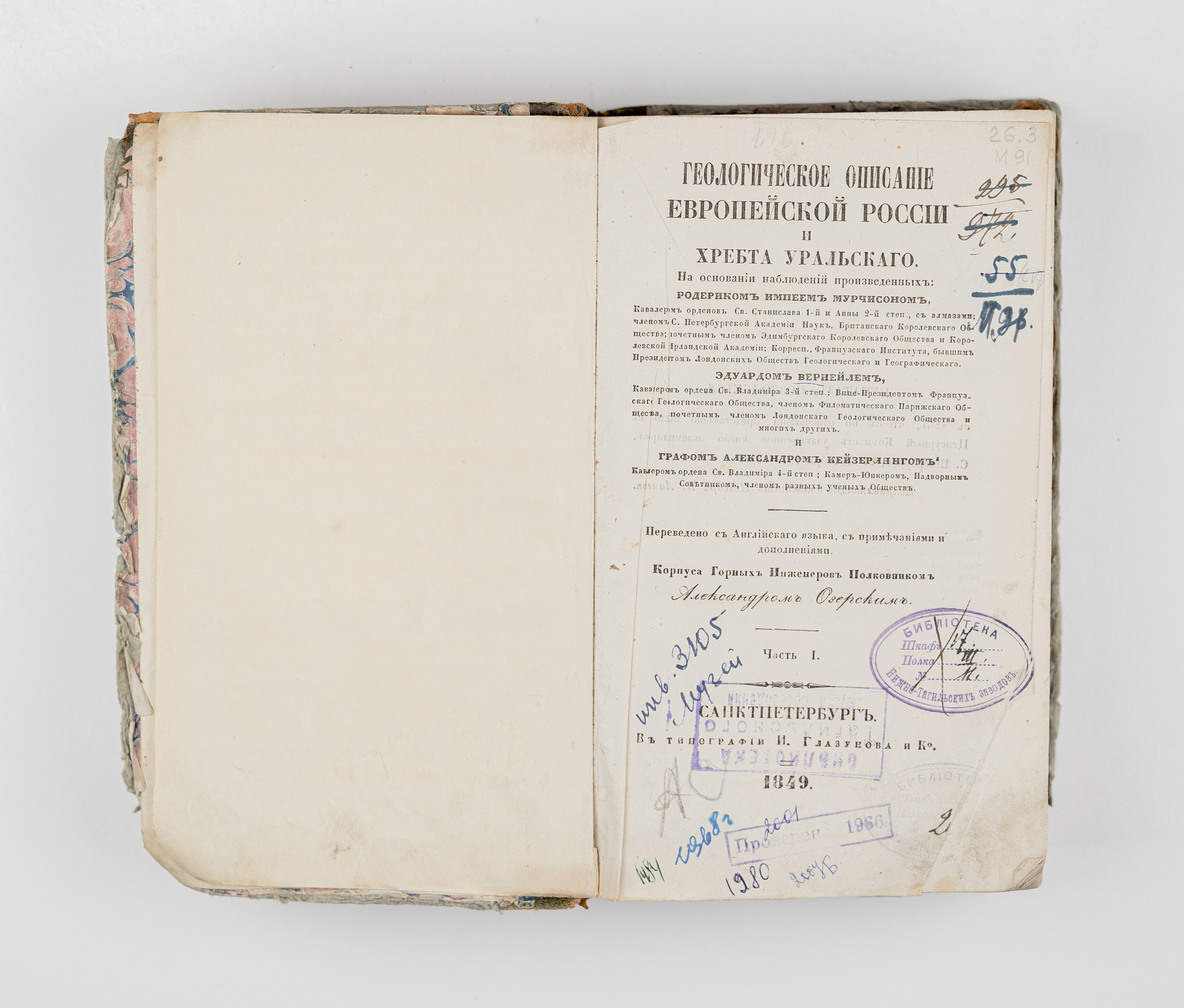 Мурчисон, Р. И. (1792-1871). Геологическое описание Европейской России и хребта Уральского. На основании наблюдений, произведенных Родериком Импеем Мурчинсоном, Эдуардом Вернейлем, Александром Кейзерлингом. В 2 ч. / Р. И. Мурчисон, Э. Вернейл, А. Кайзерлинг ; пер. с англ., с прим. и доп. Александр Озерский. – Санкт-Петербург : в тип. И. Глазунова, 1849.