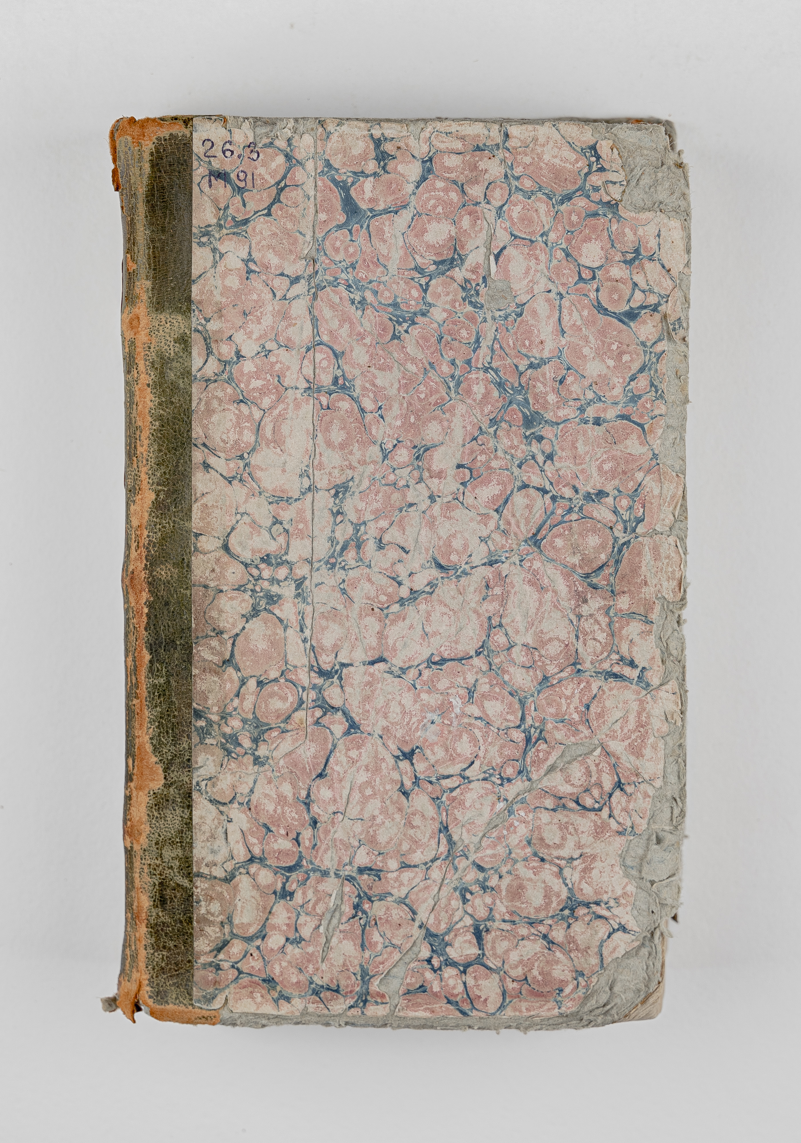 Книга в полукожаном владельческом переплете. Крышки переплета обтянуты бумагой с рисунком «под мрамор». Обрез тонированный.