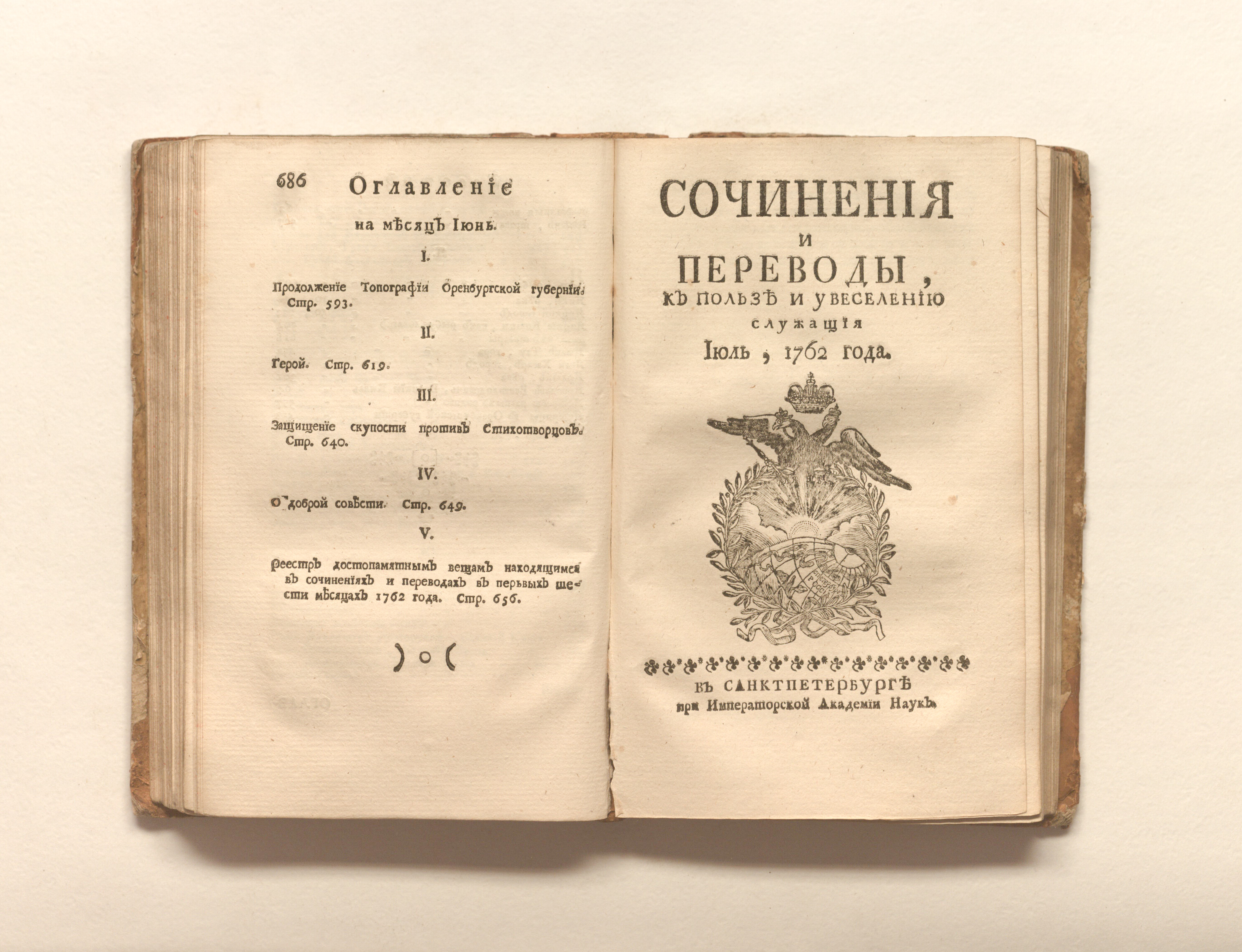 Сочинения и переводы к пользе и увеселению служащия. — Санкт-Петербург : При Императорской Академии наук. — 1762. — Май-август. — 497-687, 1-192 с. ; 19х12 см.