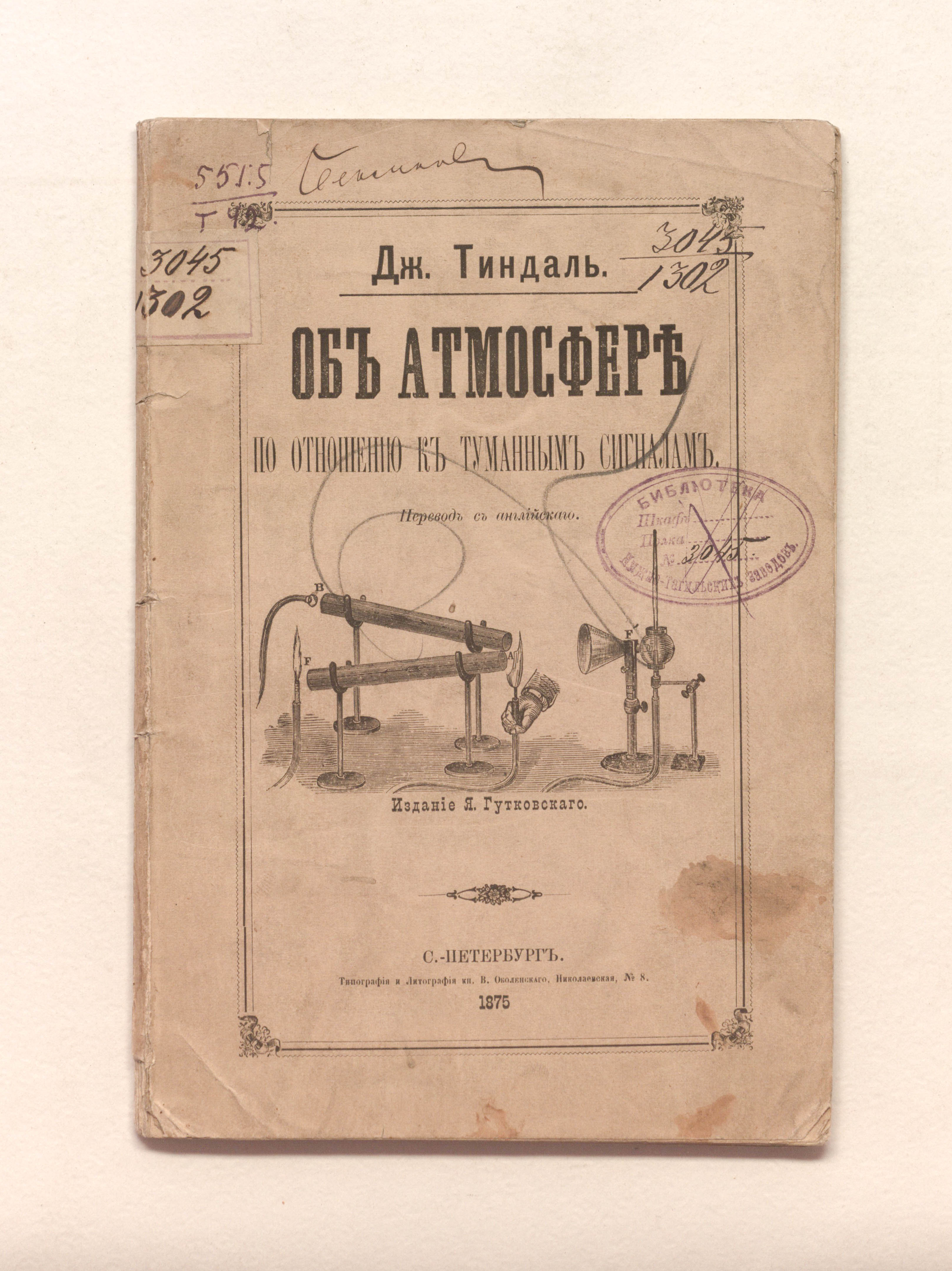 Тиндаль, Джон (1820-1893). Об атмосфере по отношению к туманным сигналам : пер. с англ. / Дж. Тиндаль. — Санкт-Петербург : издание Я. Гутковского, 1875. — [4], II, 79 с. : ил. ; 21,5х14,5 см.
