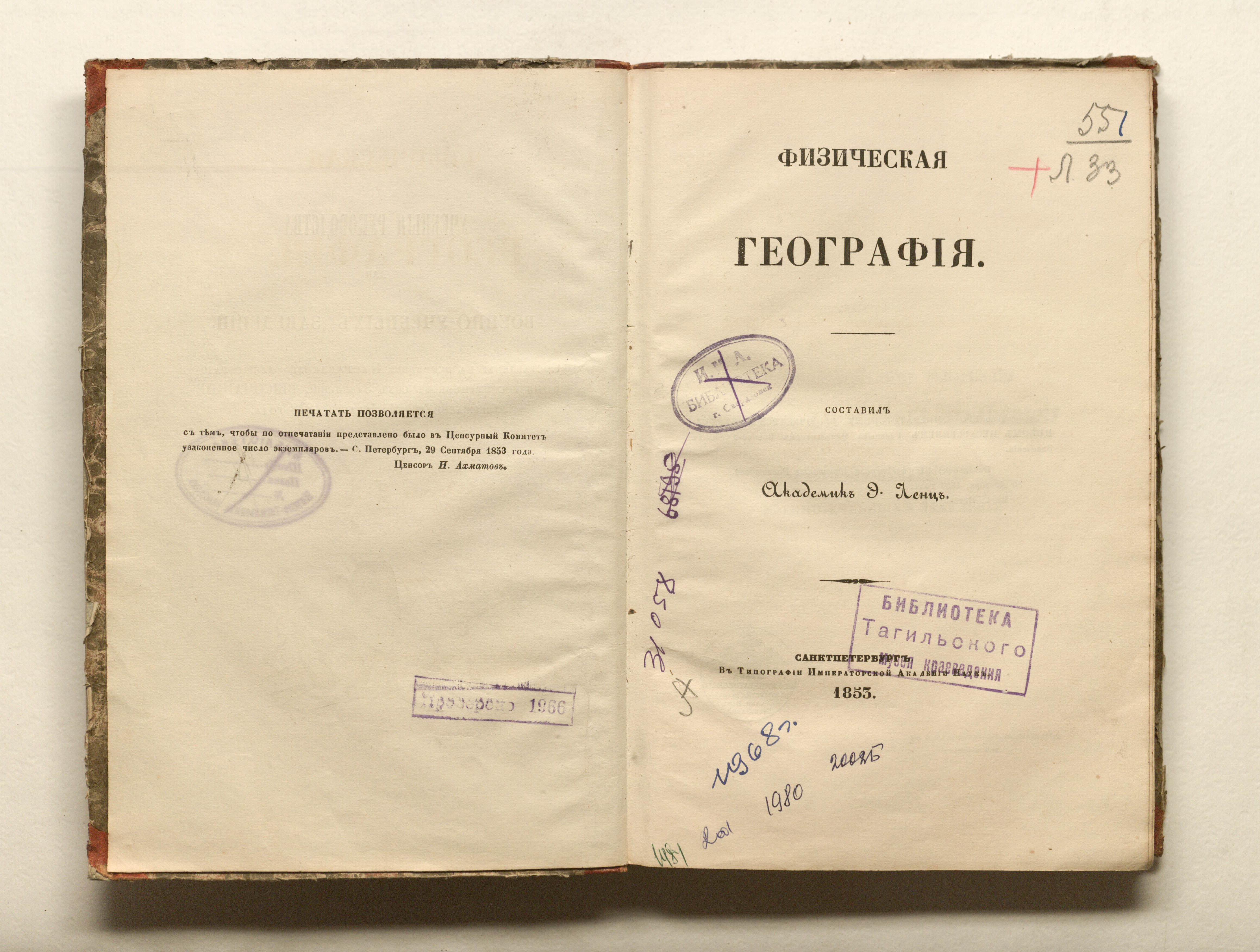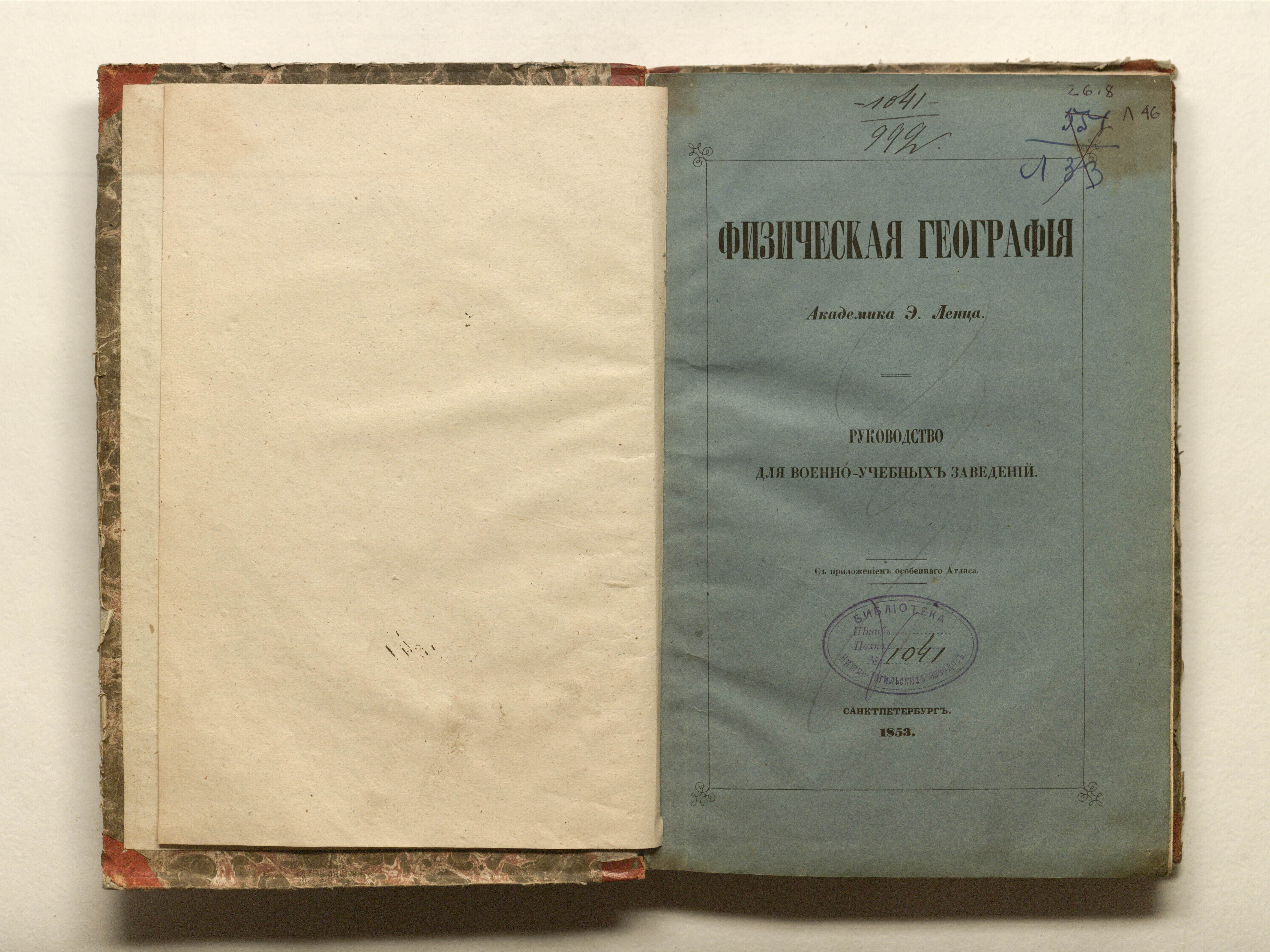 Ленц, Эмилий Христианович (1804-1865). Физическая география : руководство для военно-учебных заведений / cоставил академик Э. Ленц. — Санкт-Петербург : Тип. Императорской Академии наук, 1853. — [6], IV, 272 с. ; 24,5х16 см.