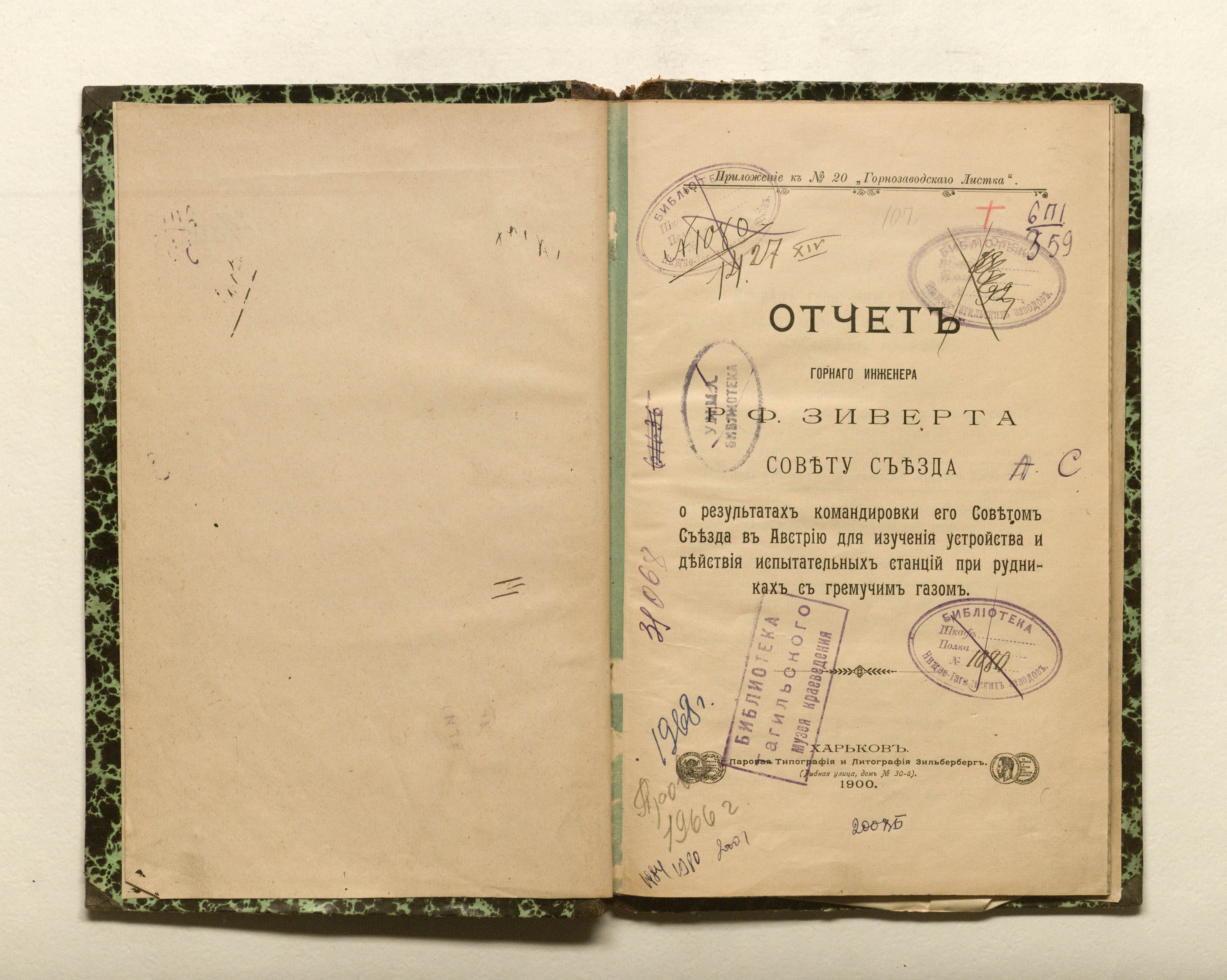 Зиверт, Роман Федорович. Отчет горного инженера Р.Ф. Зиверта Совету Съезда о результатах командировки его Советом Съезда в Австрию для изучения устройства и действия испытательных станций при рудниках с гремучим газом / Р. Ф. Зиверт. — Харьков : паровая тип. и лит. Зильберберг, 1900. — 37 с. : 8 л. табл. ; 24,5х16 см.