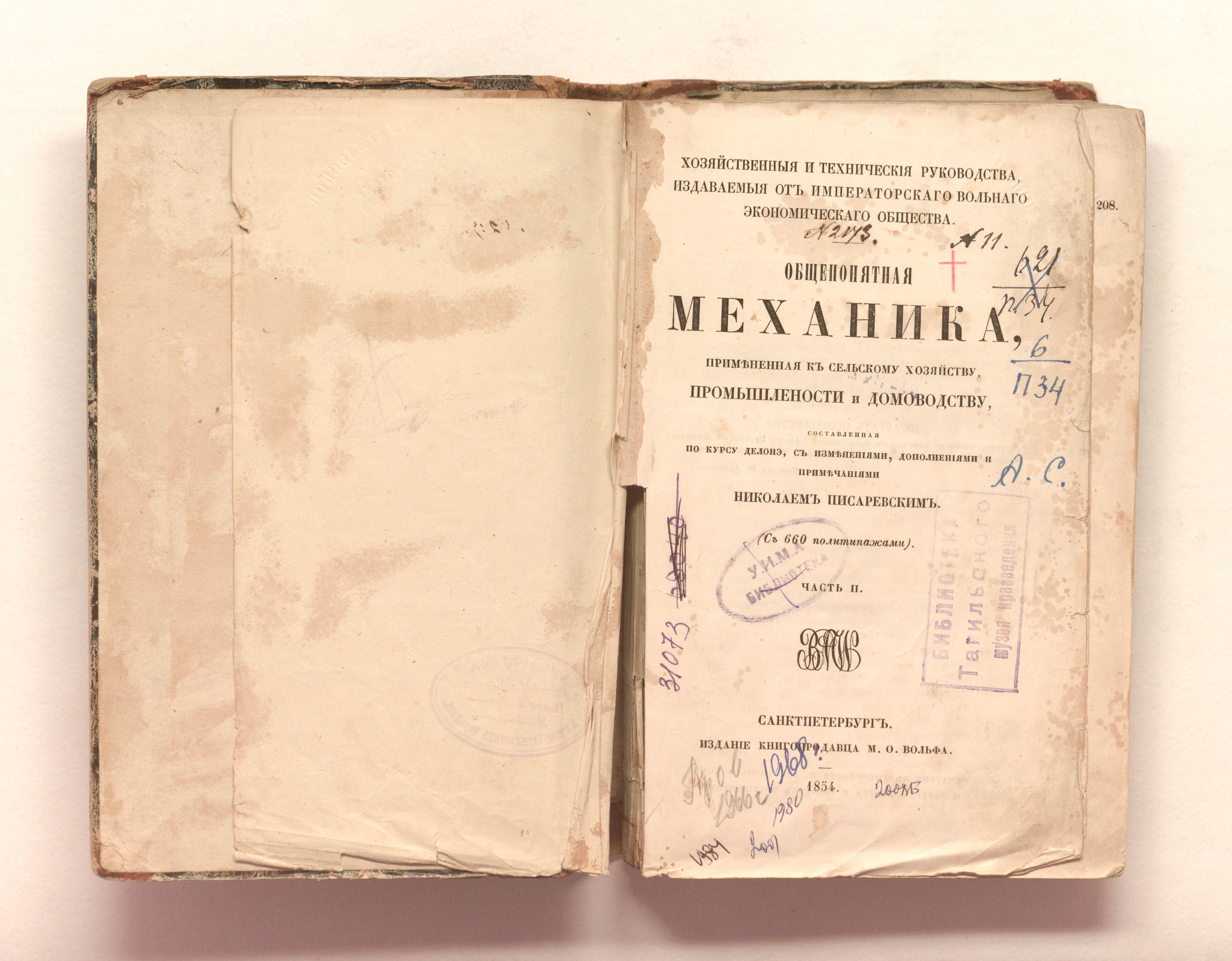 Общепонятная механика, примененная к сельскому хозяйству, промышленности и домоводству. Ч. 2. Механика жидких тел / составленная по курсу Делонэ, с изменениями, дополнениями и примечаниями Николаем Писаревским. — Санкт-Петербург : Издание М. О. Вольфа, 1854. — [2], 341-740 с. ; 22х13,5 см.