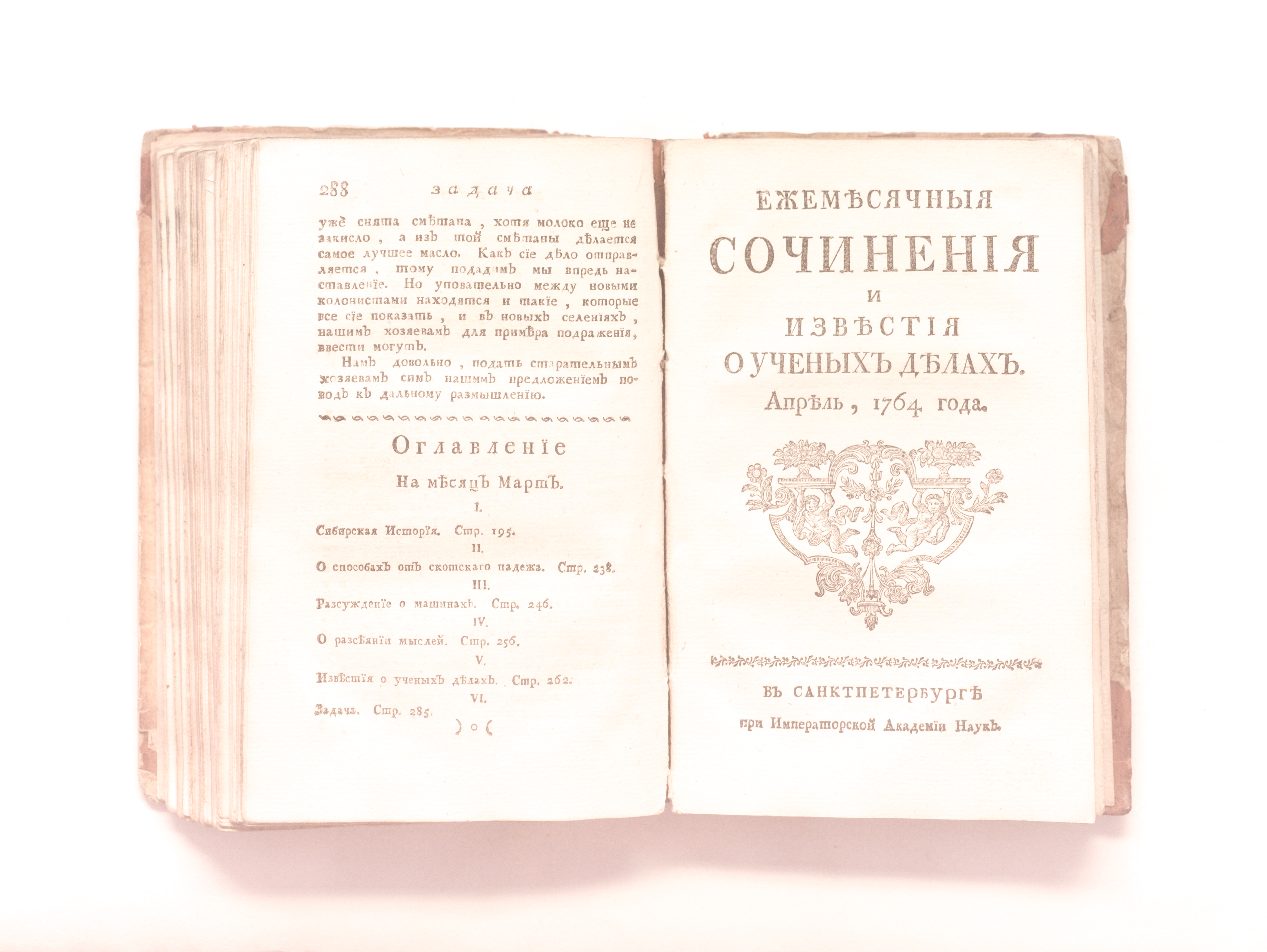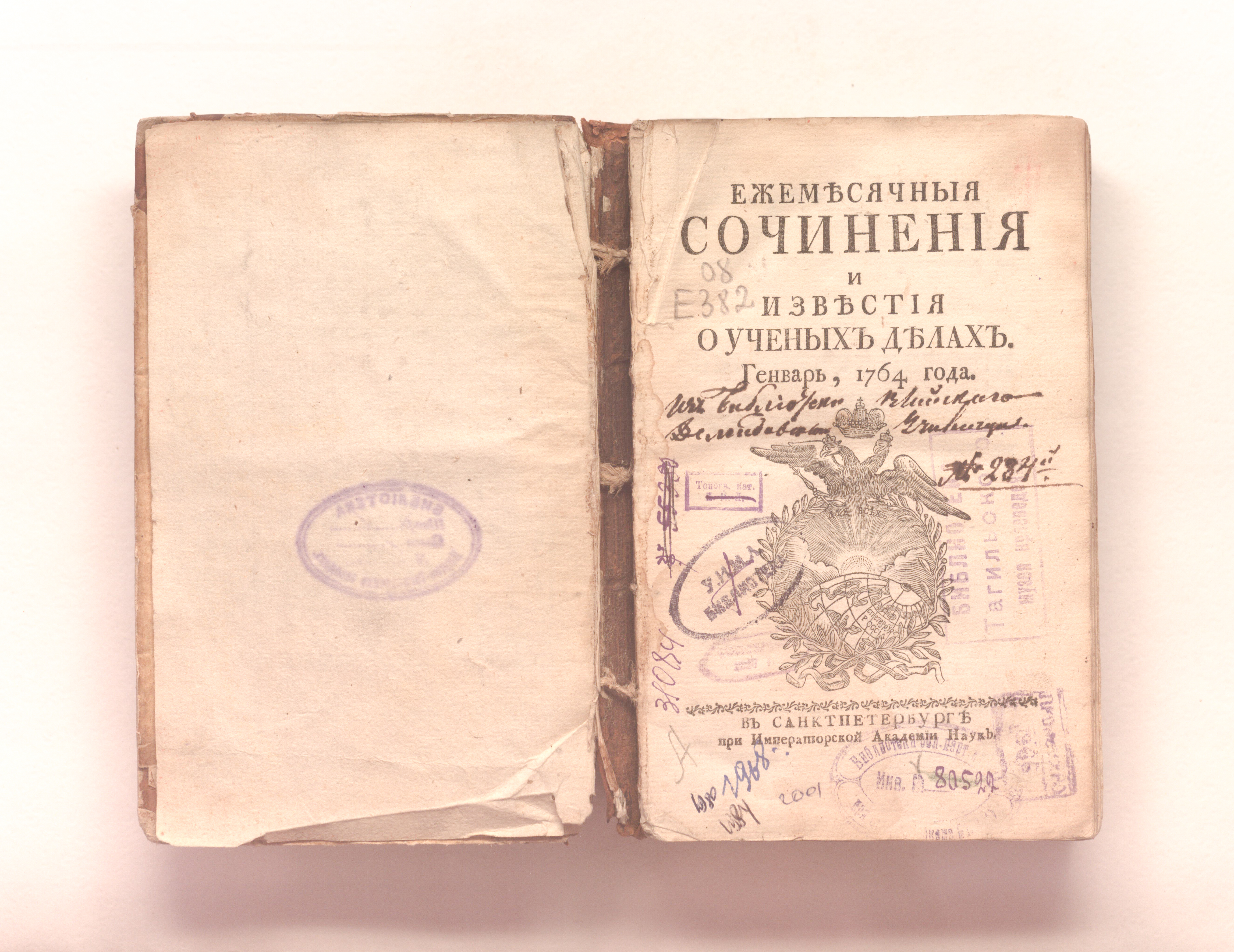 Ежемесячные сочинения и известия о ученых делах. — Санкт-Петербург : При Императорской Академии наук. — 1764. — Январь-апрель. — 1-384 с. ; 19х12 см.