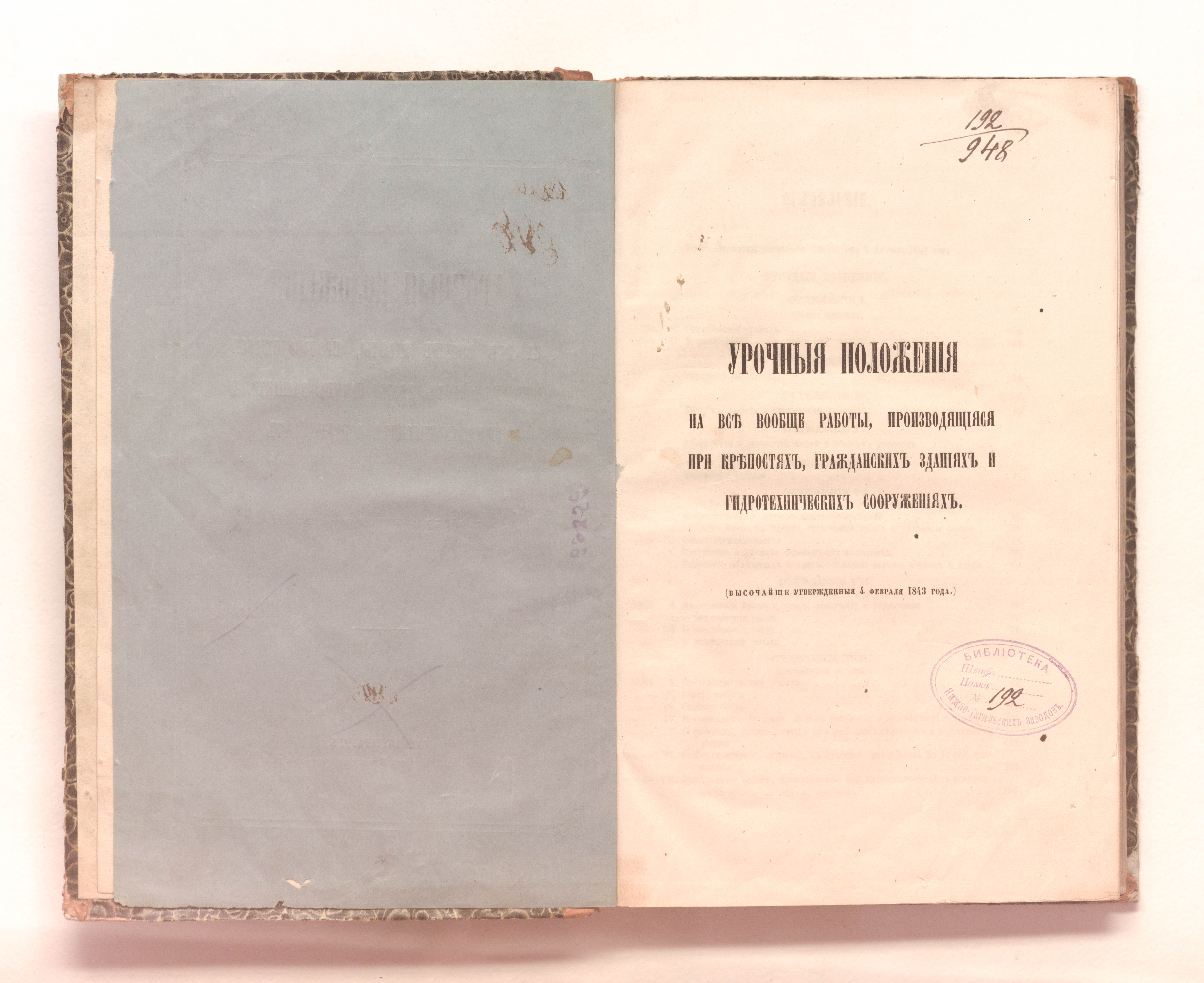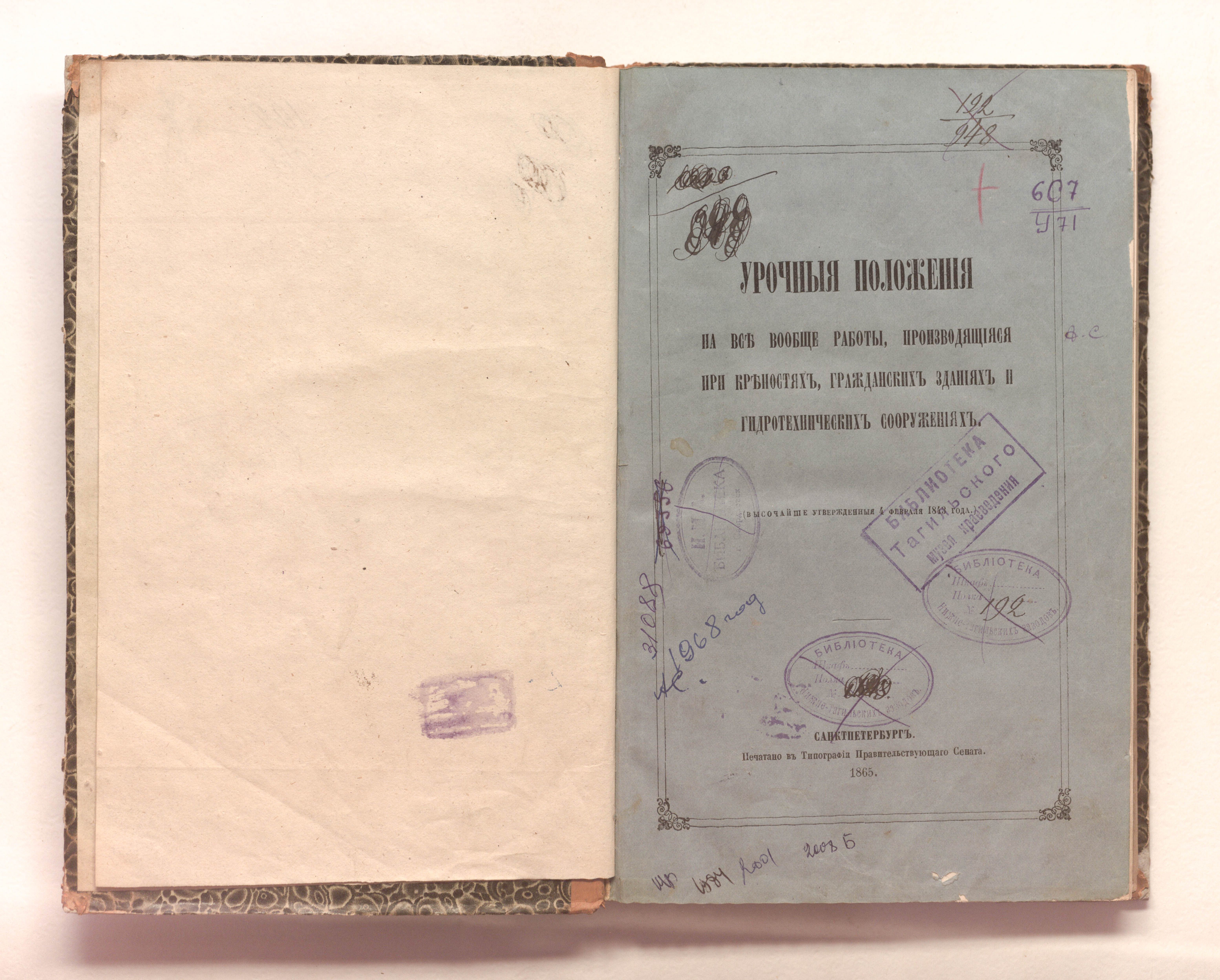 Урочные положения на все вообще работы, производящиеся при крепостях, гражданских зданиях и гидротехнических сооружениях : выс. утв. Санктпетербург, 4 февр.1843 года. — Санкт-Петербург : тип. Правительствующего сената, 1865. — 340 с. ; 26,5х17 см.