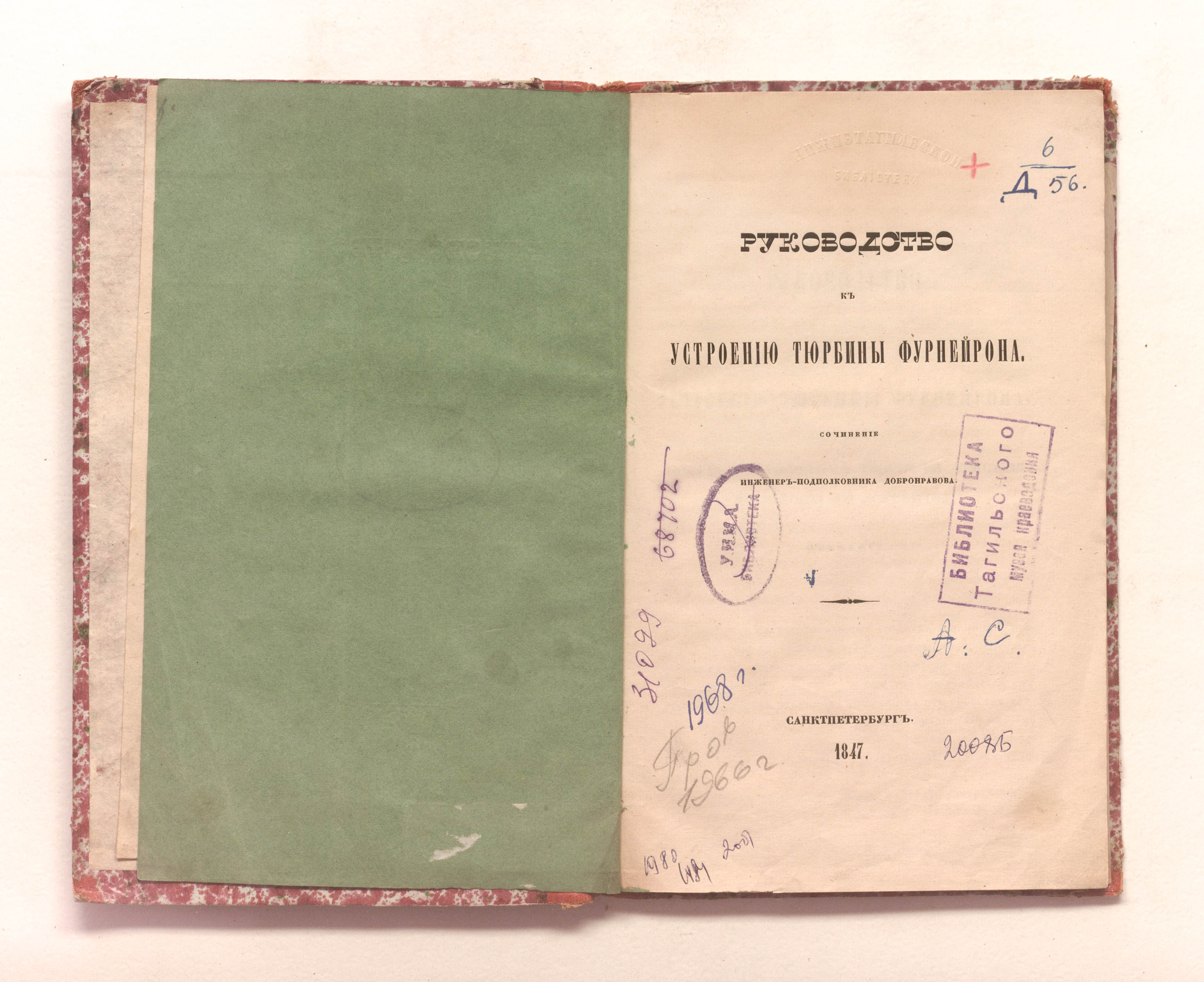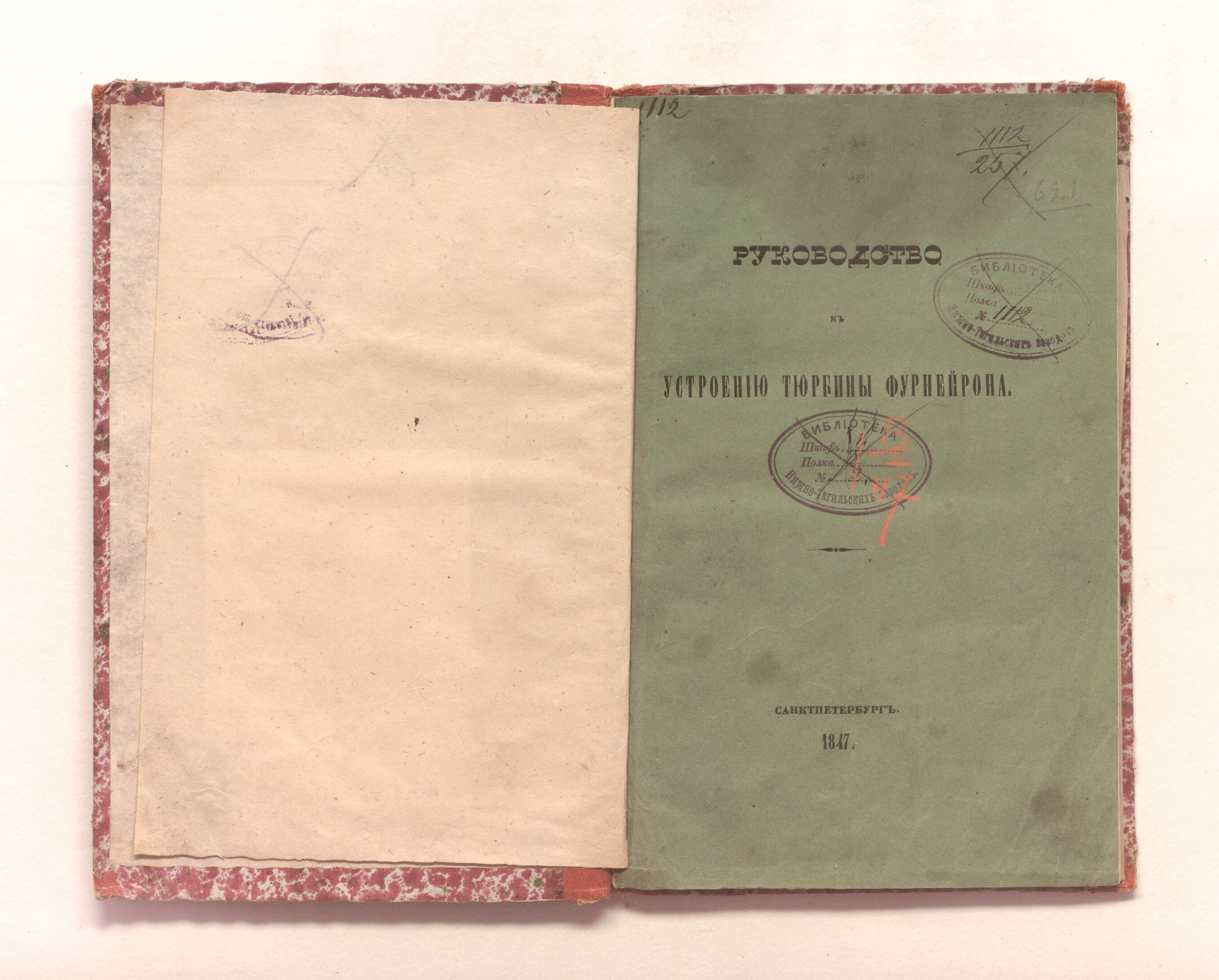 Добронравов, Аркадий Гаврилович. Руководство к устроению тюрбины Фурнейрона / Соч. инж.-подполк. Добронравова. — Санкт-Петербург : [б. и.], 1847. — [2], 123 с. : 2 л. табл.