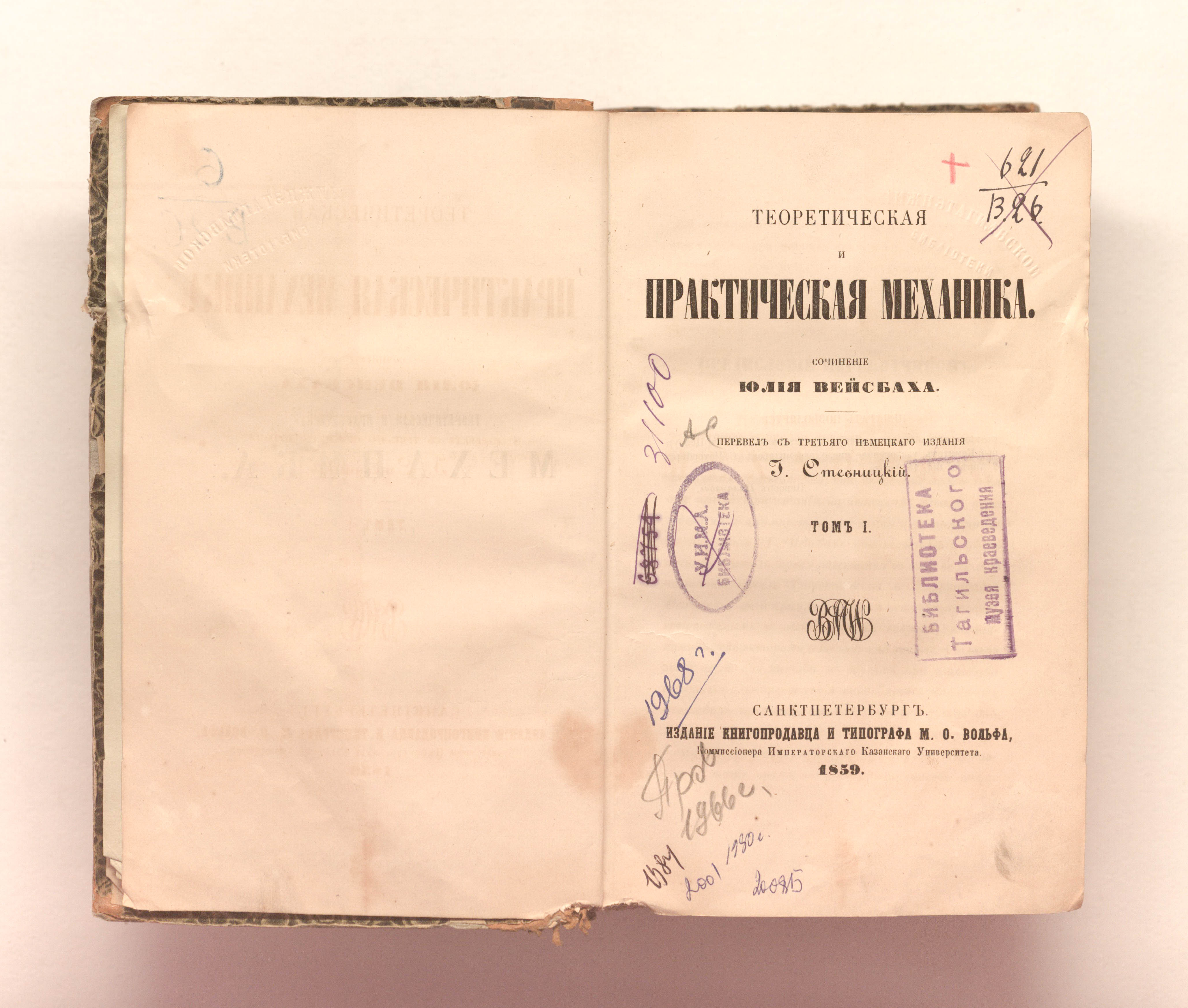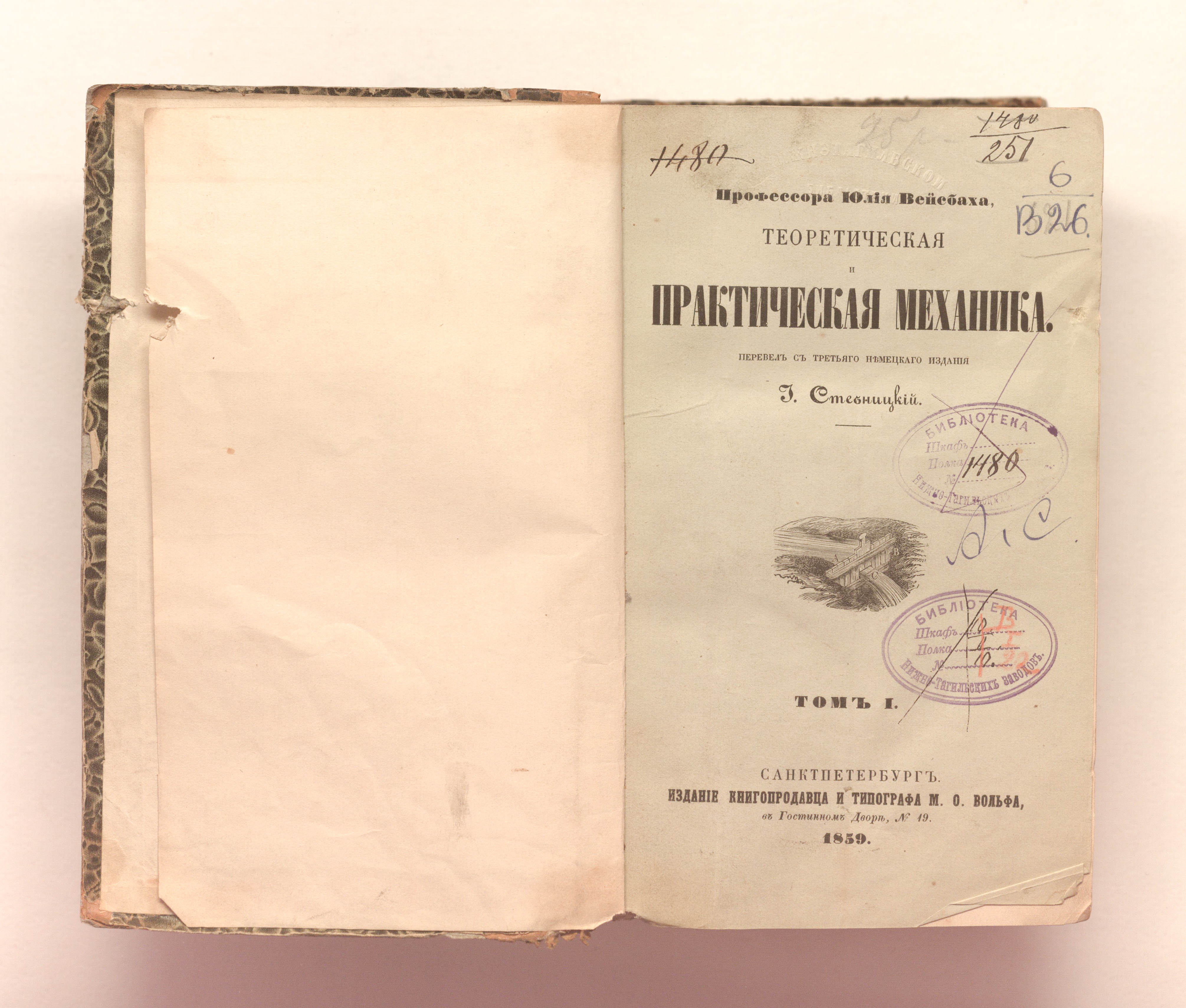 Теоретическая и практическая механика. Т. 1 / Ю. Вейсбах ; пер. с 3-го нем. изд. И. Стебницкий. — Санкт-Петербург : издание М. О. Вольфа, 1859. — [6], 1219, XII с. : ил. ; 22х14 см.
