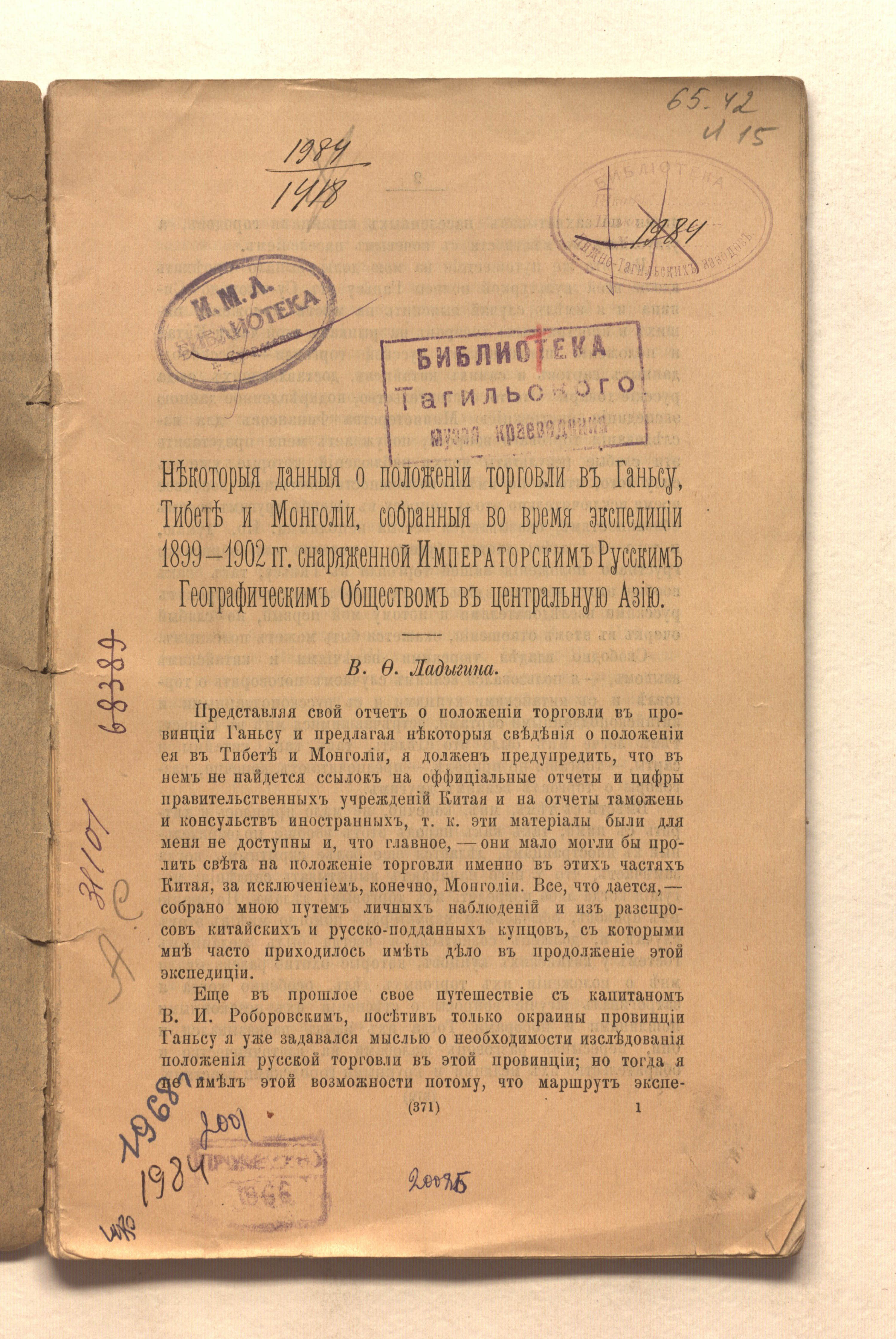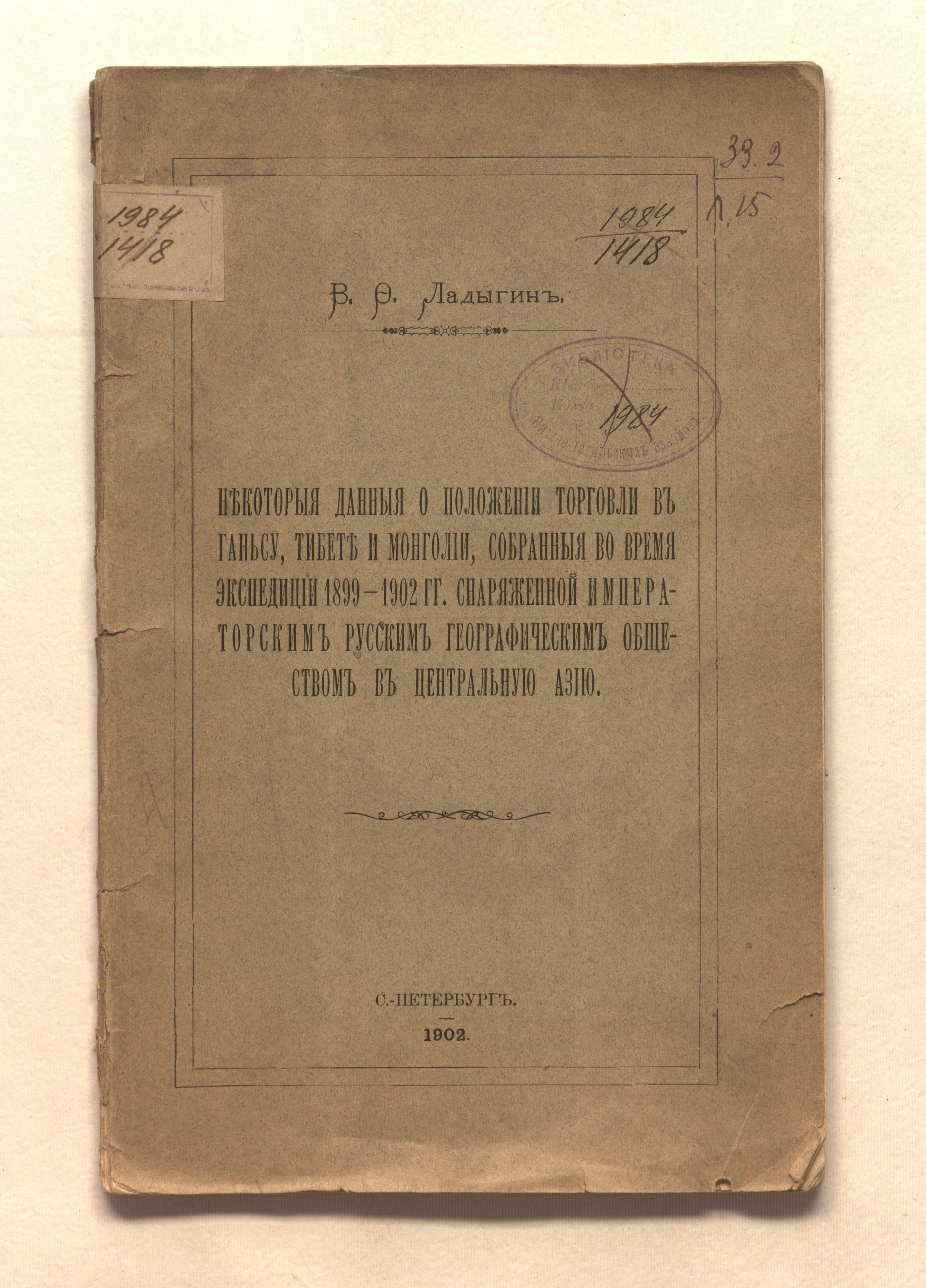 Некоторые данные о положении торговли в Ганьсу, Тибете и Монголии, собранные во время экспедиции 1899-1902 гг., снаряженной Русским географическим обществом в Центральную Азию / В. Ф. Ладыгин ; Русское географическое общество. — Санкт-Петербург : тип. В. Безобразова и К°, 1902. — 96 с. ; 24,5х15,5 см.