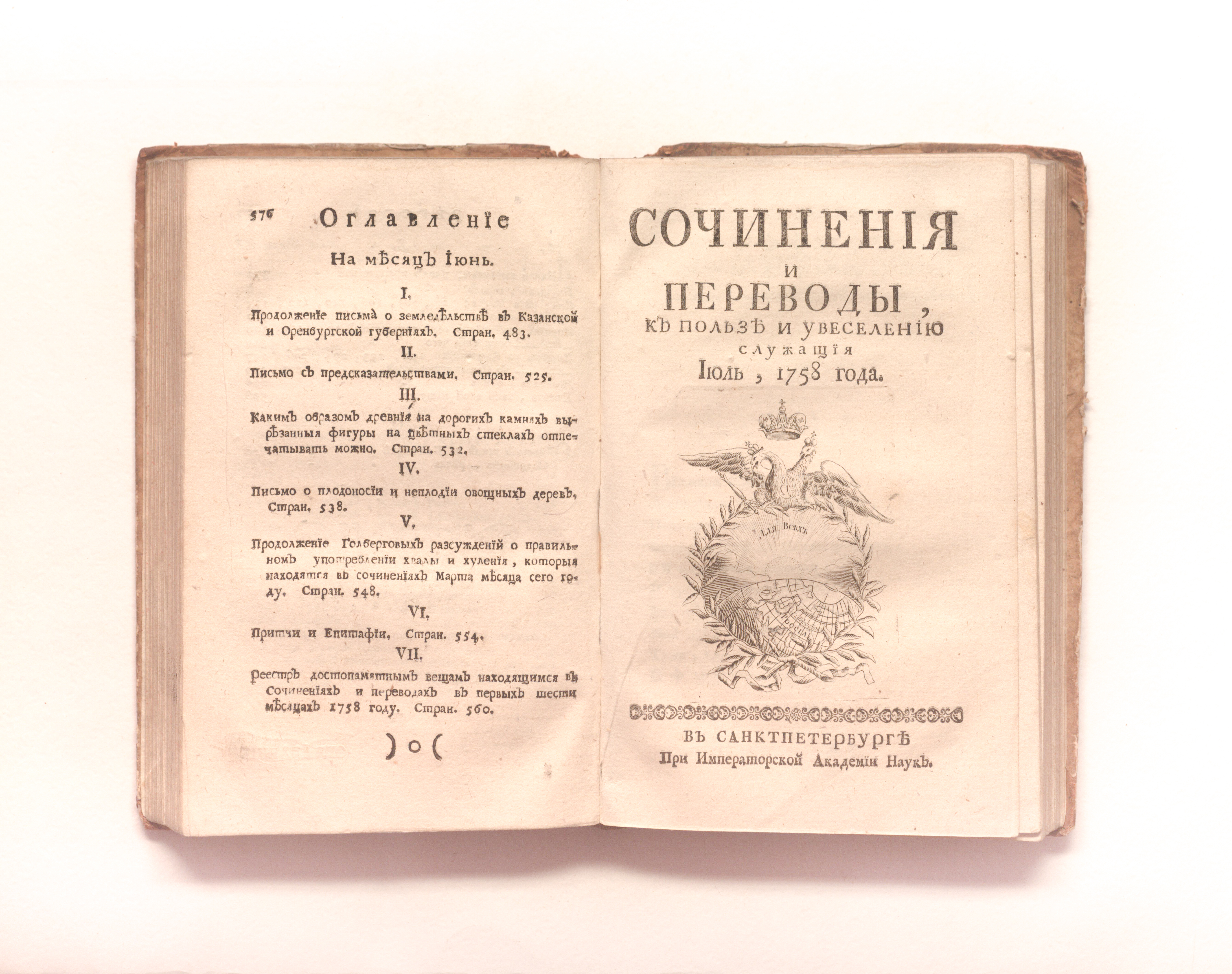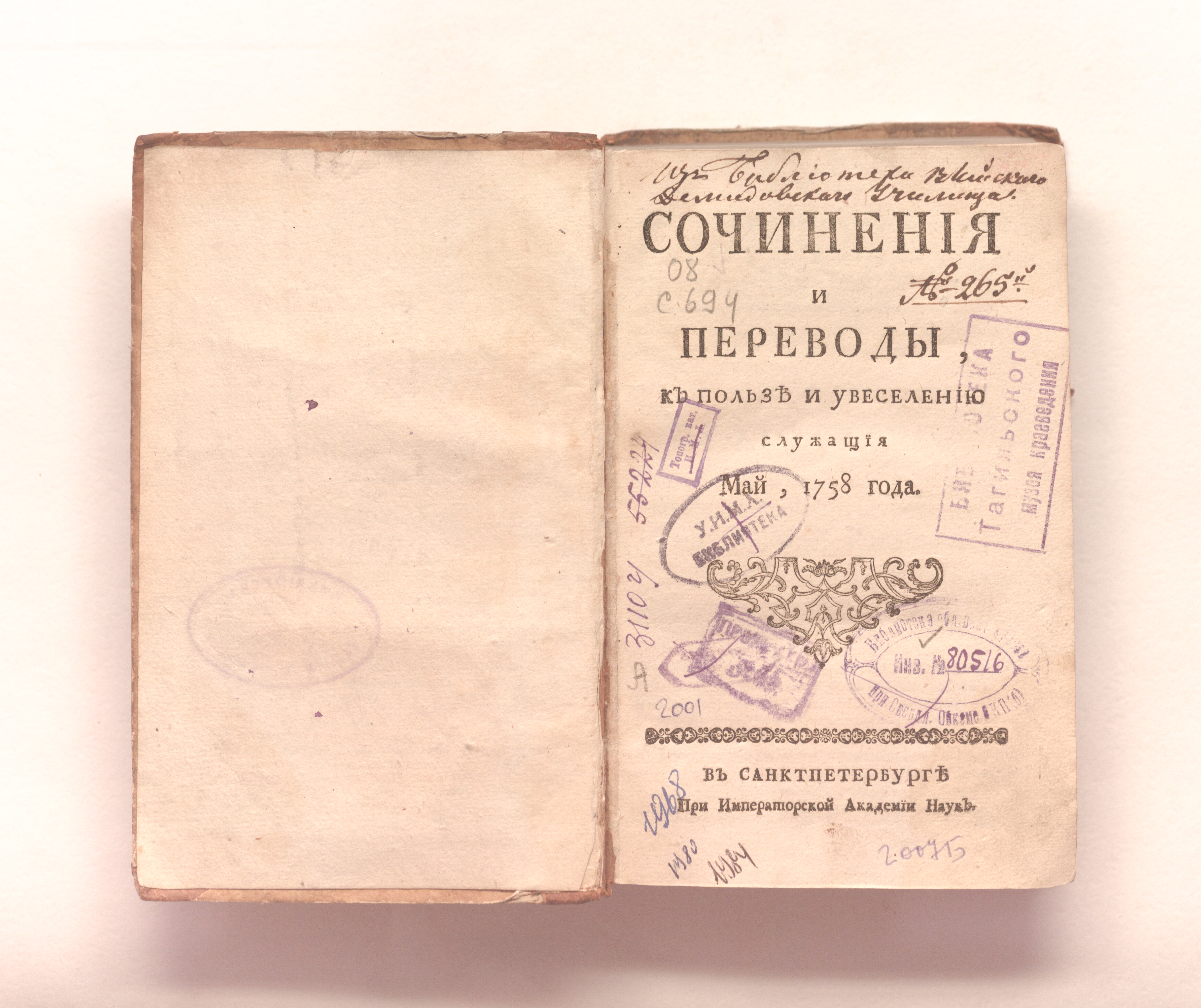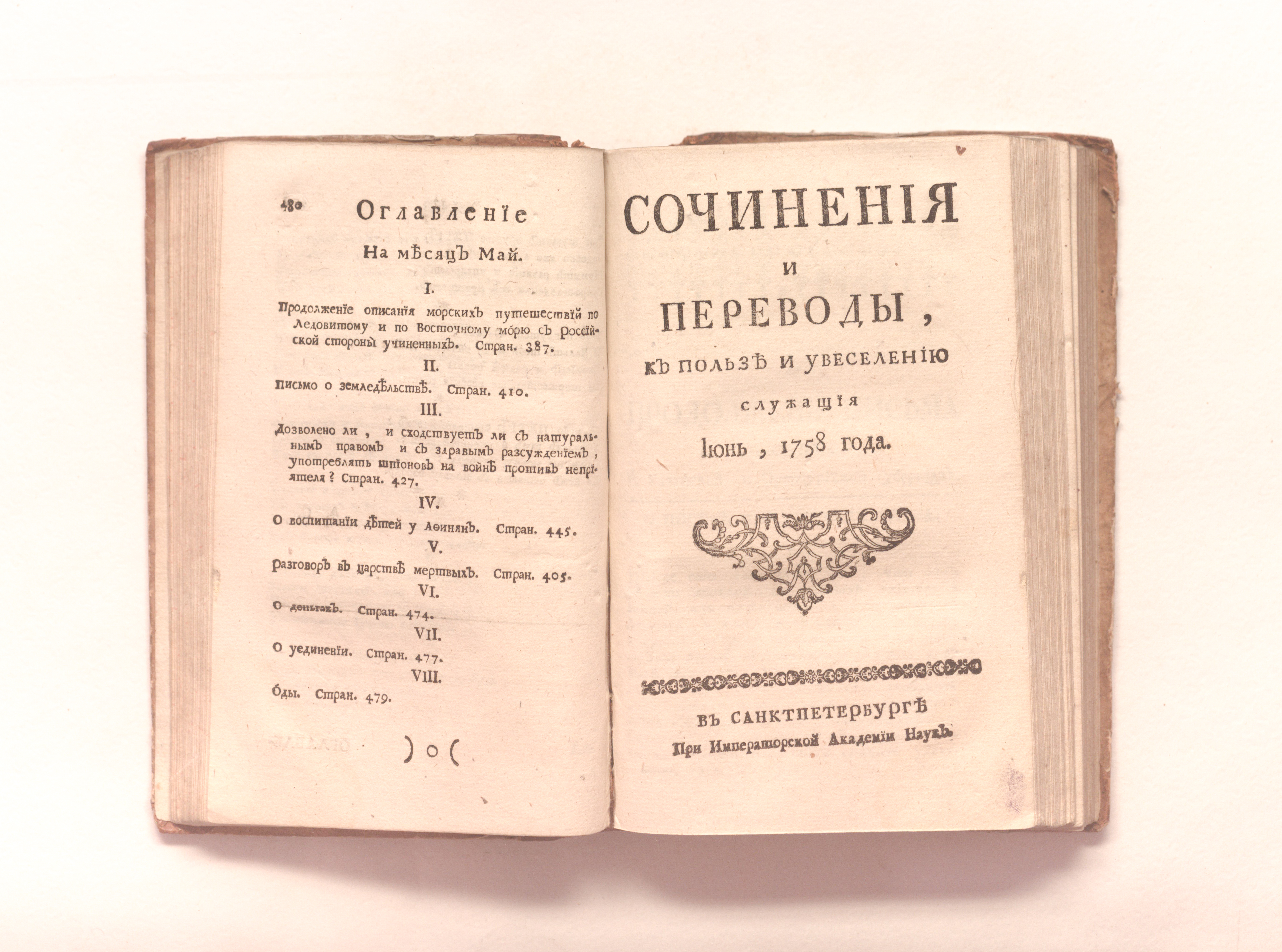 Сочинения и переводы к пользе и увеселению служащия. — Санкт-Петербург : При Императорской Академии наук. — 1758. — Май-август. — 387-576, 1-192 с. ; 19х12 см.
