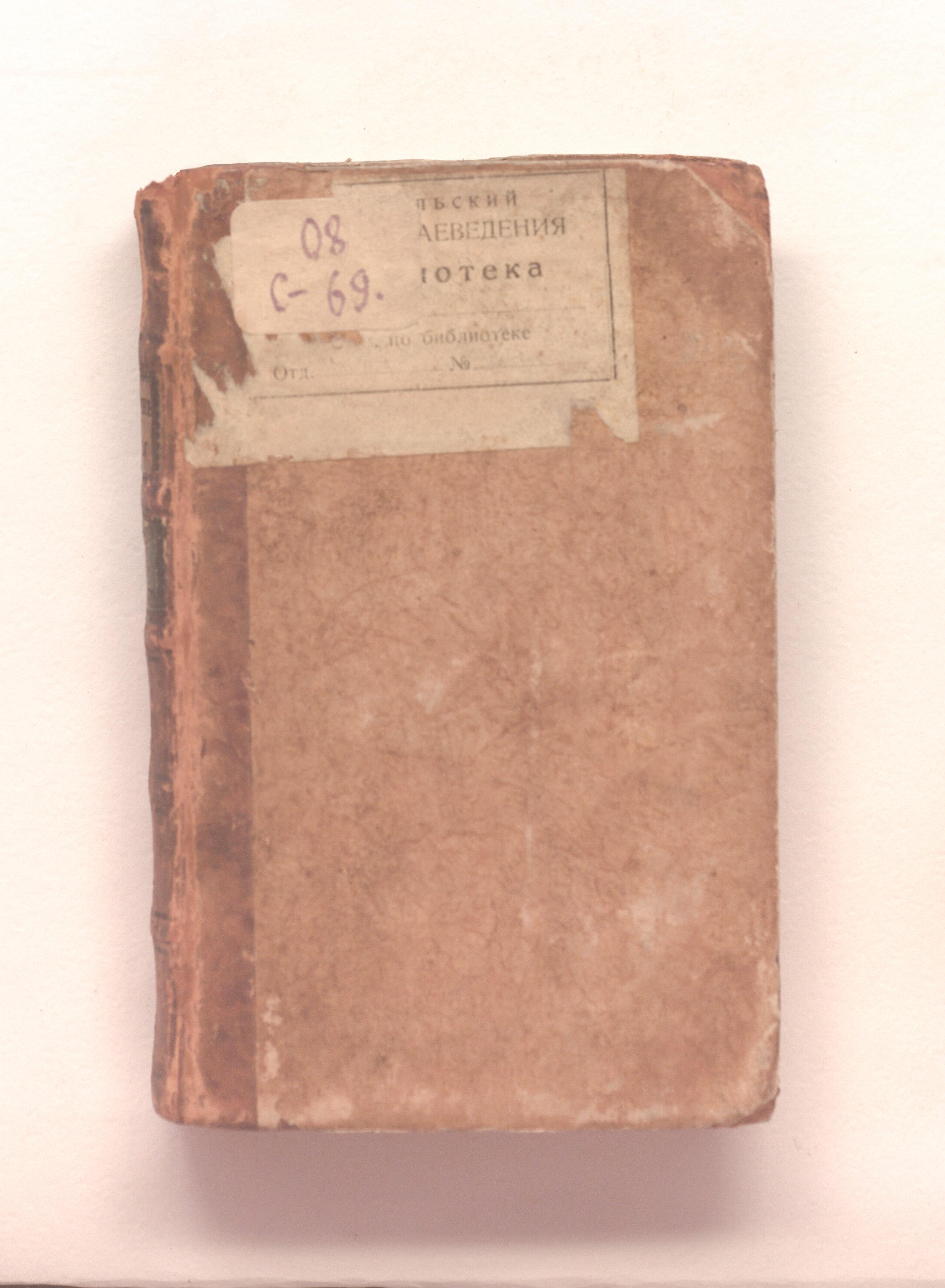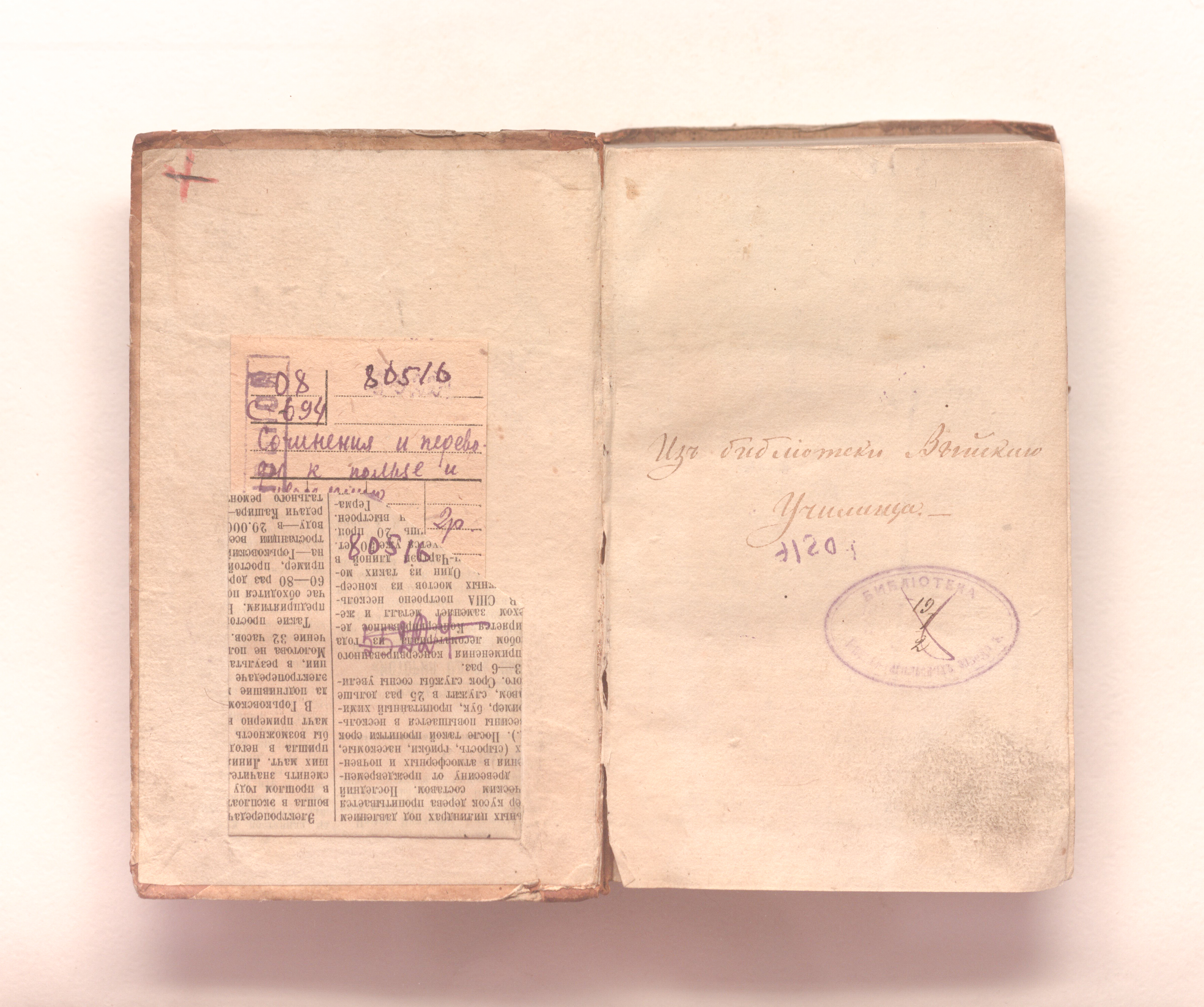 "Из библиотеки Выйскаго Демидовскаго училища № 265»(тит. л.); «Из Библиотеки Выйскаго училища»(форзац).