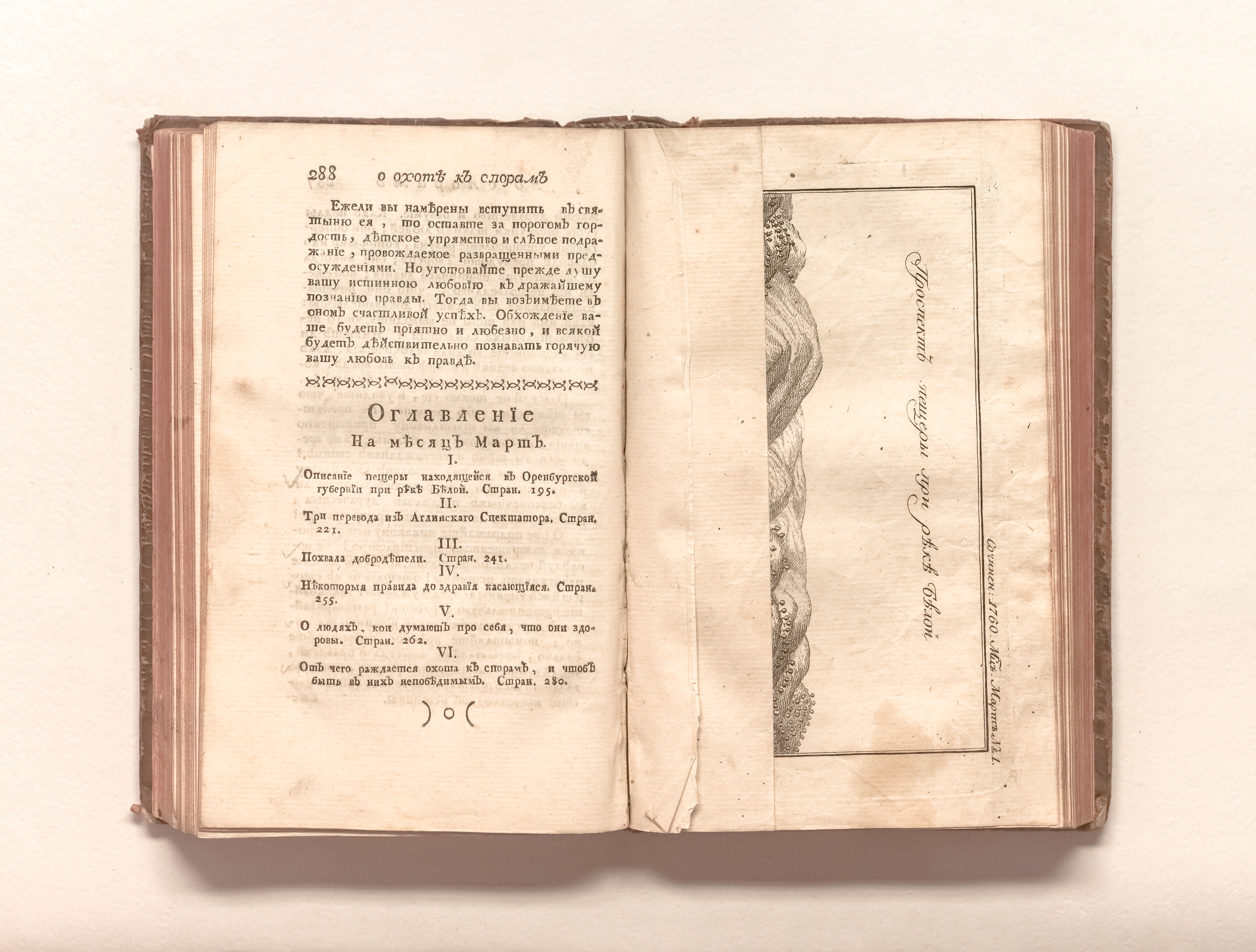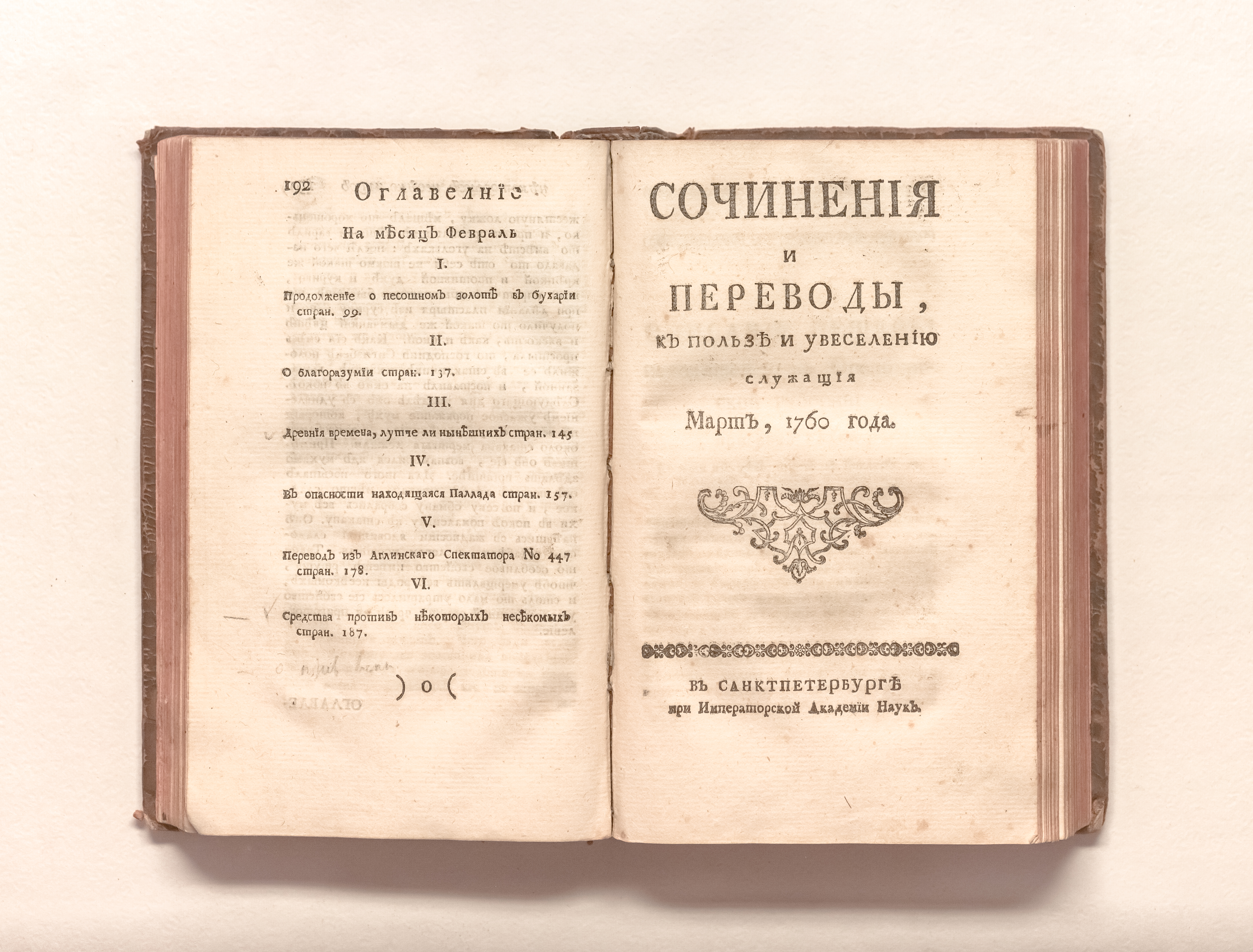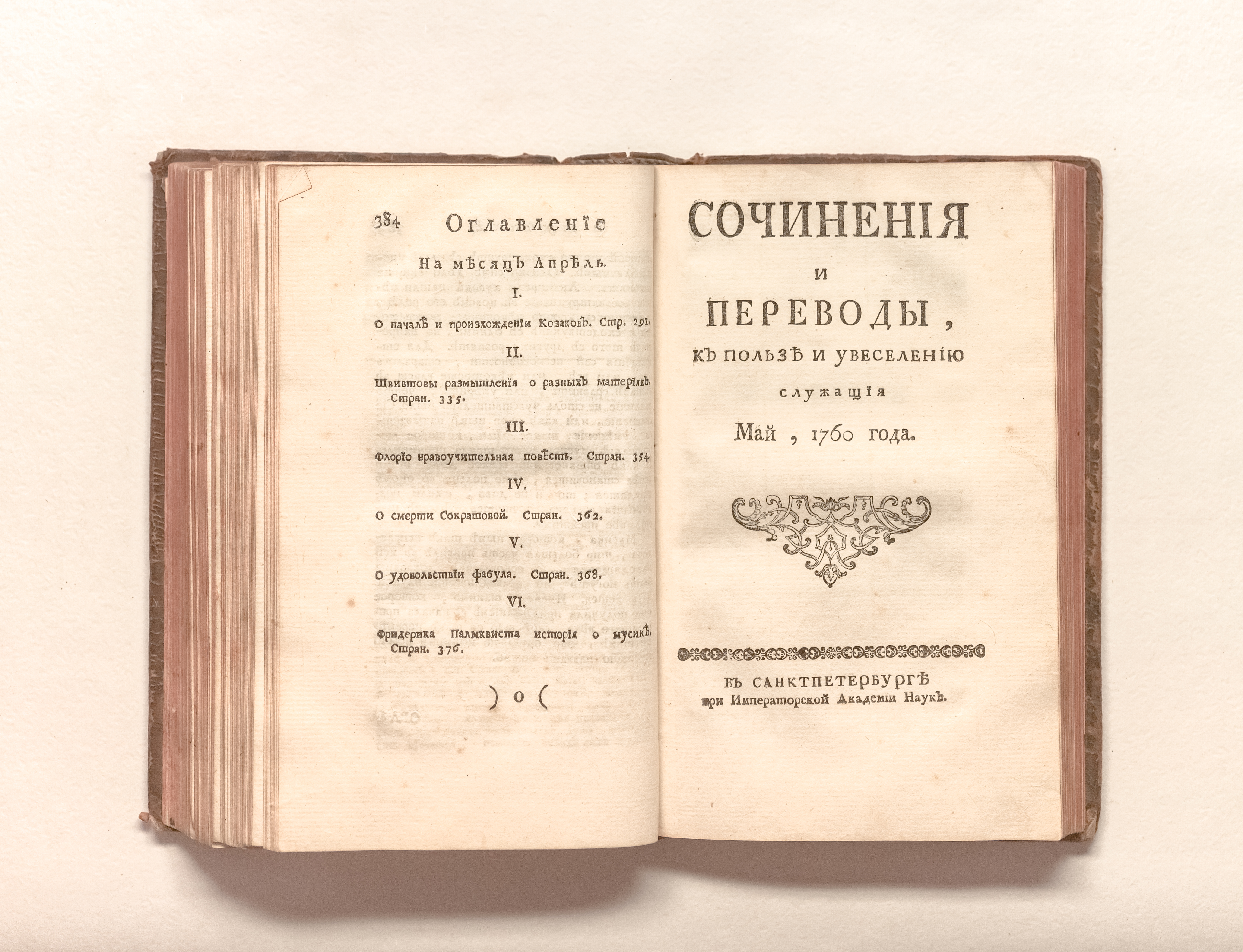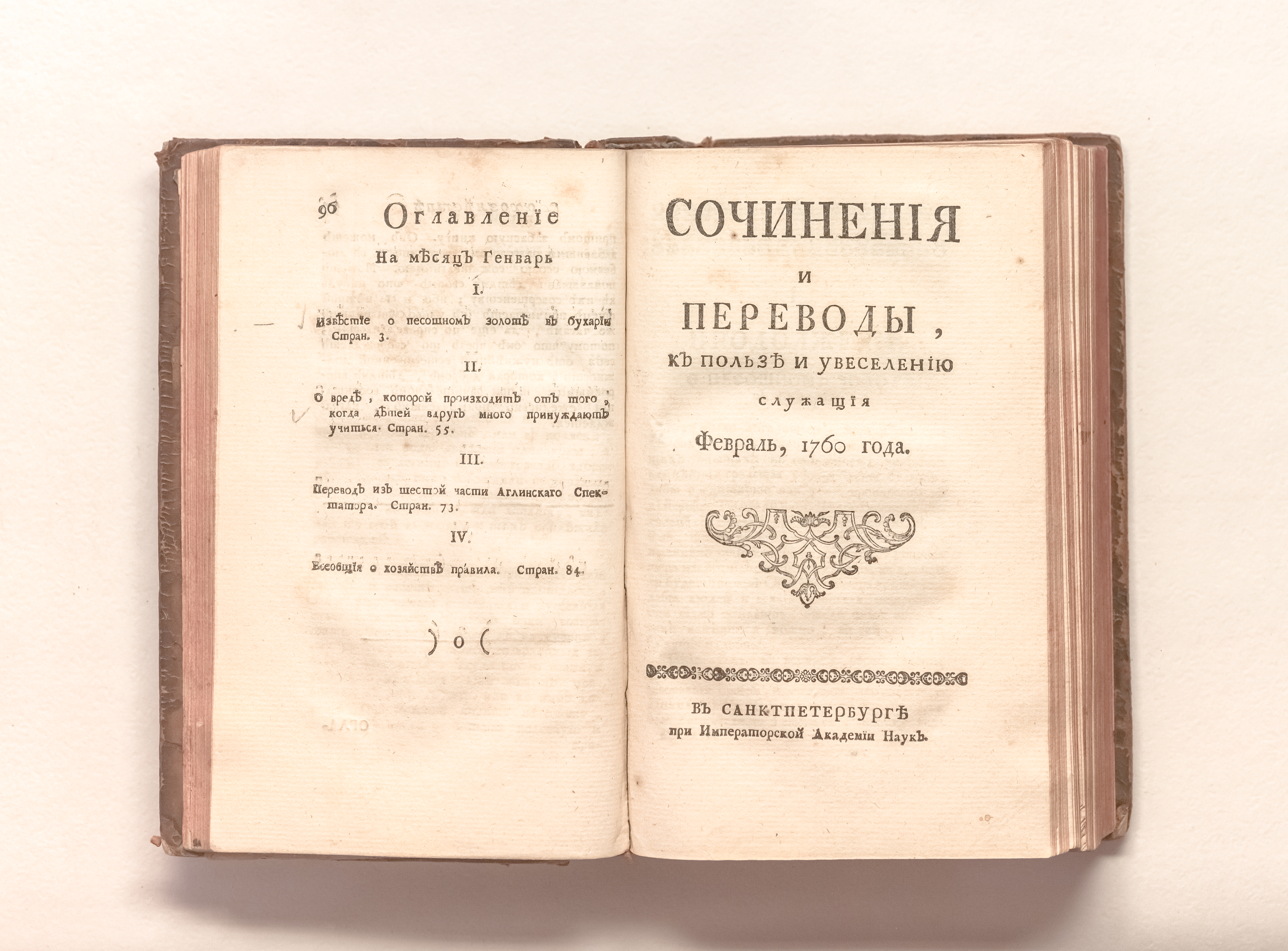 Сочинения и переводы к пользе и увеселению служащия. — Санкт-Петербург : При Императорской Академии наук. — 1760. — Январь-июнь. — 576 с. : 3 л. ил. ; 20х12 см.