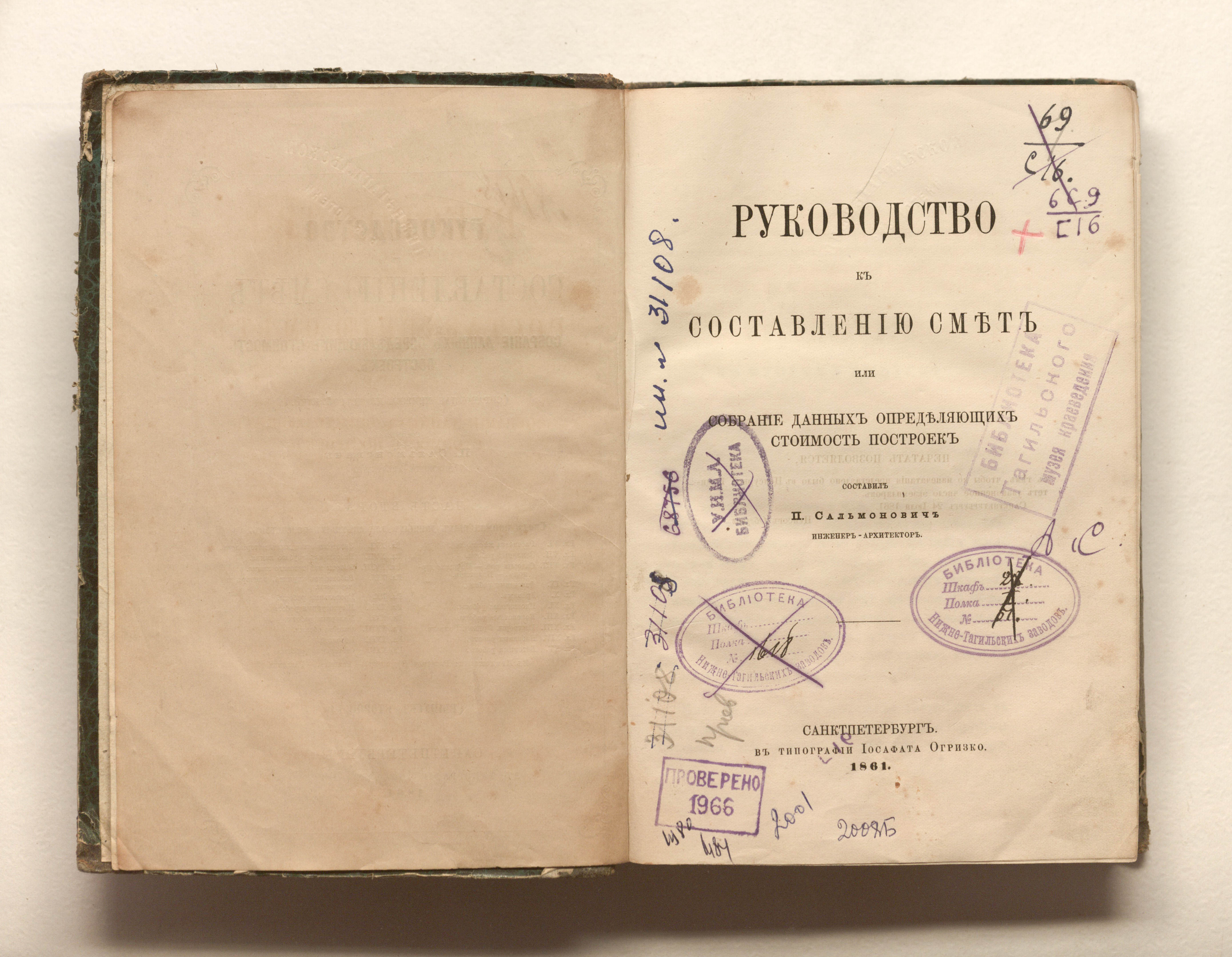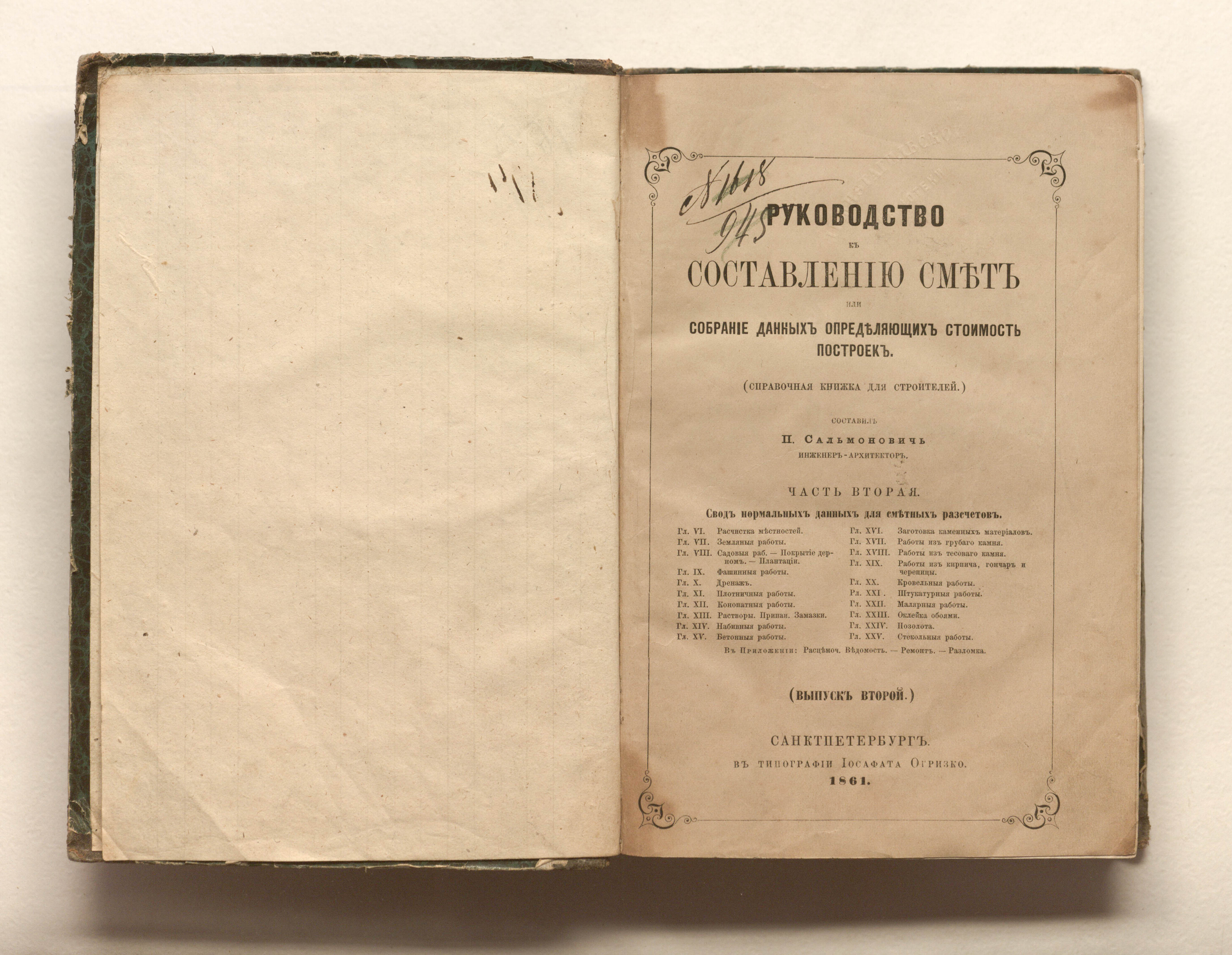 Руководство к составлению смет, или Собрание данных, определяющих стоимость построек : справочная книжка для строителей. Ч. 2. Свод нормальных данных для сметных расчетов / составил П. Сальмонович инженер-архитектор. — Санкт-Петербург : в тип. Иосафата Огризко, 1861. — X, 209-260, 472 с. ; 21х15 см.