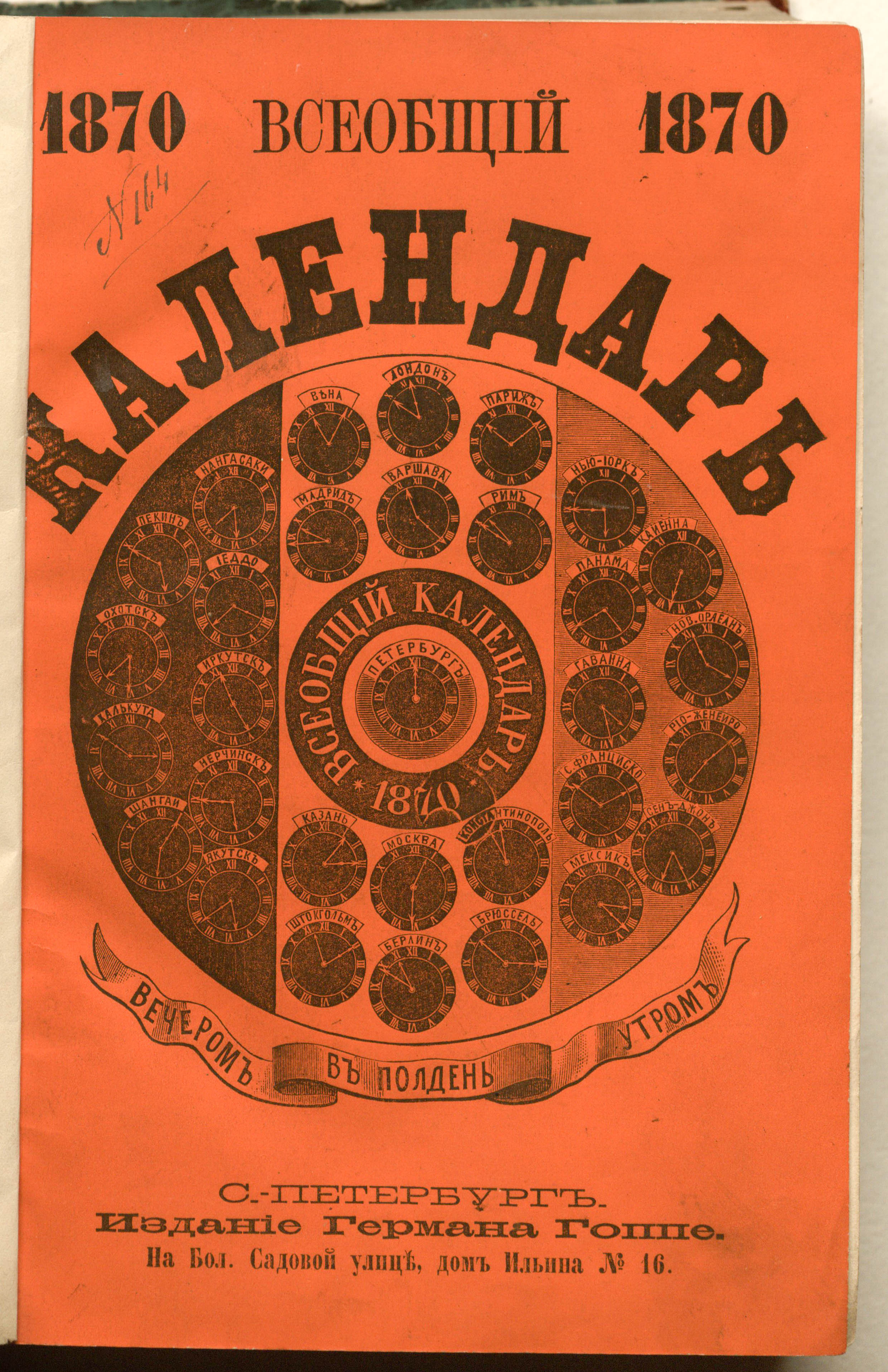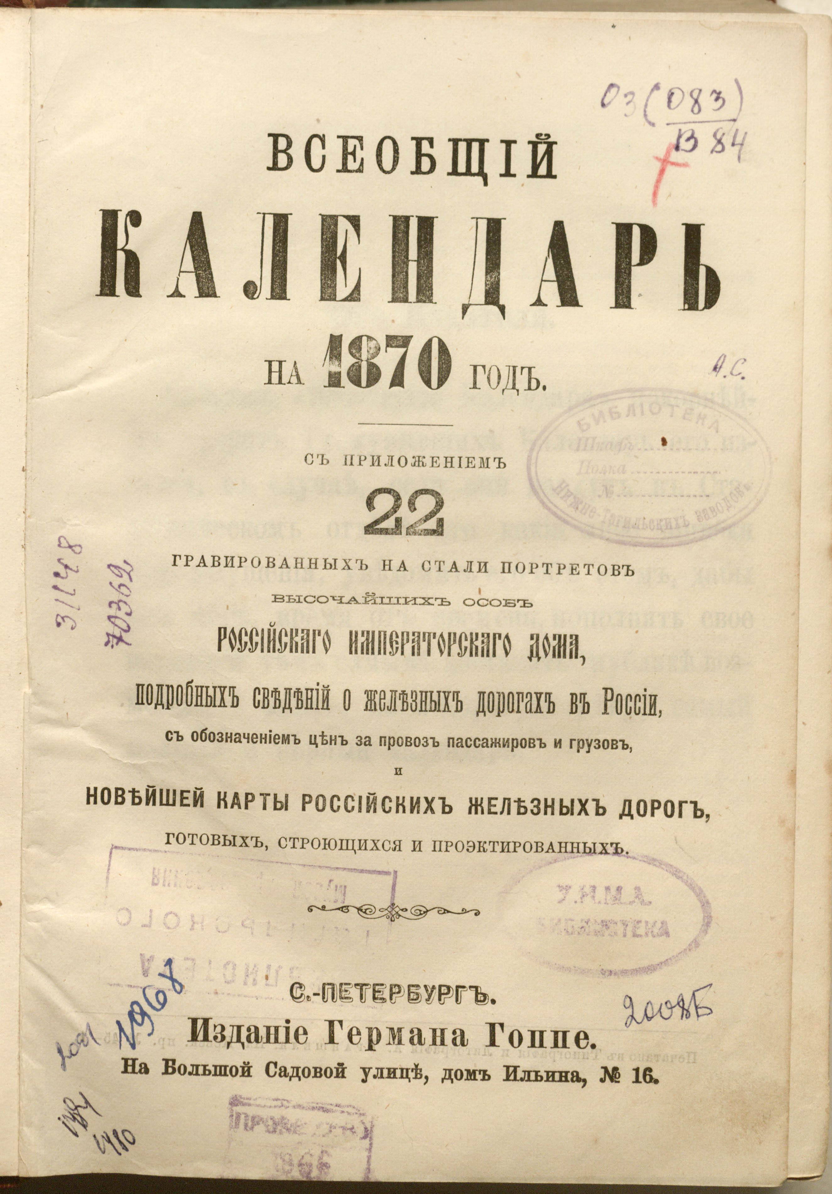 Всеобщий календарь на 1870 г. с приложением 22 гравированных на стали портретов высочайших особ Российскаго Императорскаго дома, подробных сведений о ж/д. в России, с обозначением цен за провоз пассажиров и грузов и новейшей карты росс. ж/д., готовых, строящихся и проектированных : календарь. — Санкт-Петербург : Издание Германа Гоппе, 1869. — LXIV, 816 с. ; 22,5х15 см.