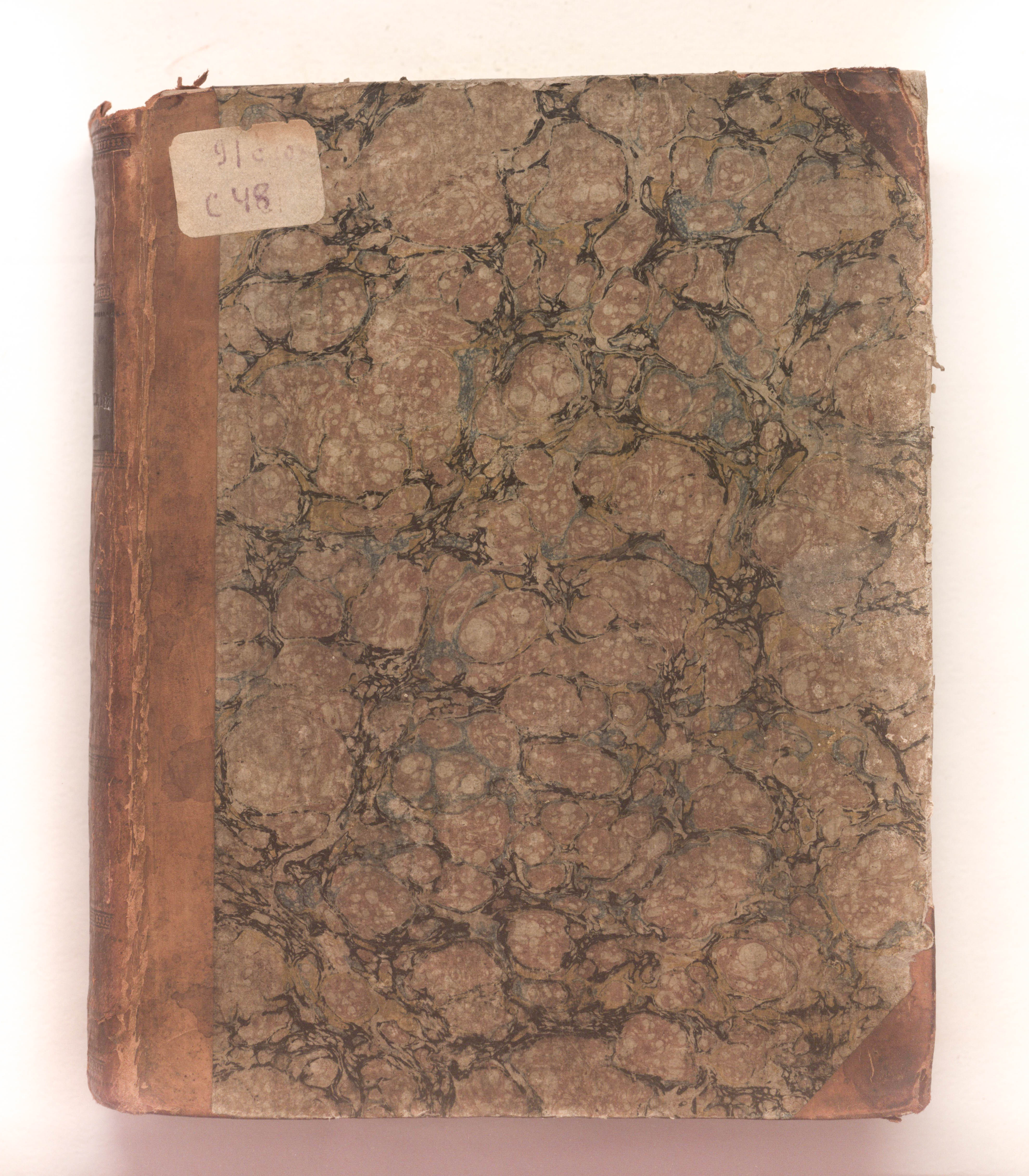 Книга в полукожаном владельческом переплете. Крышки переплета обтянуты бумагой с рисунком «под мрамор». Бумага верже.