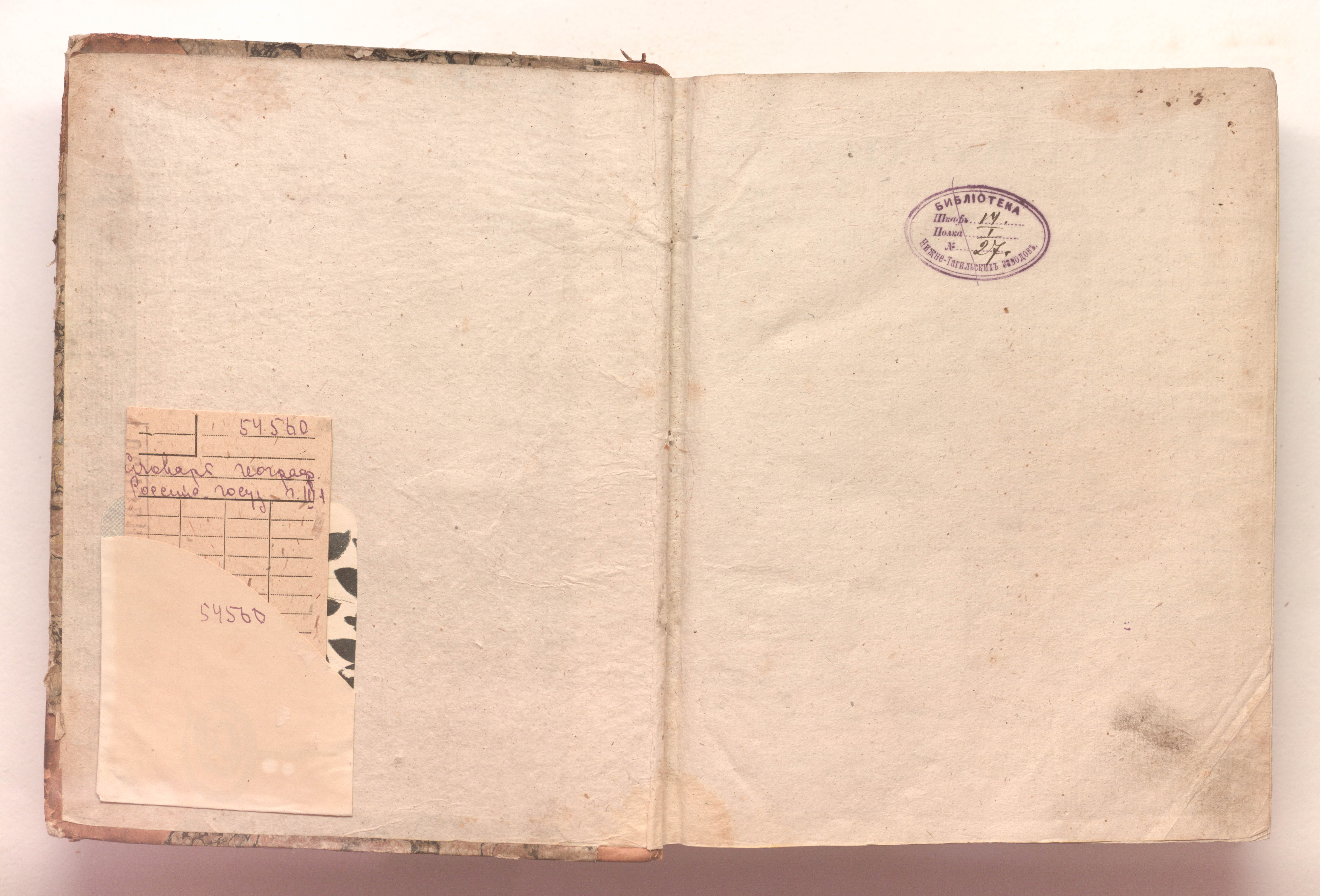 «Библиотека Нижне-Тагильских заводов. Шкаф 14. Полка I. № 27» (перепл. л.);