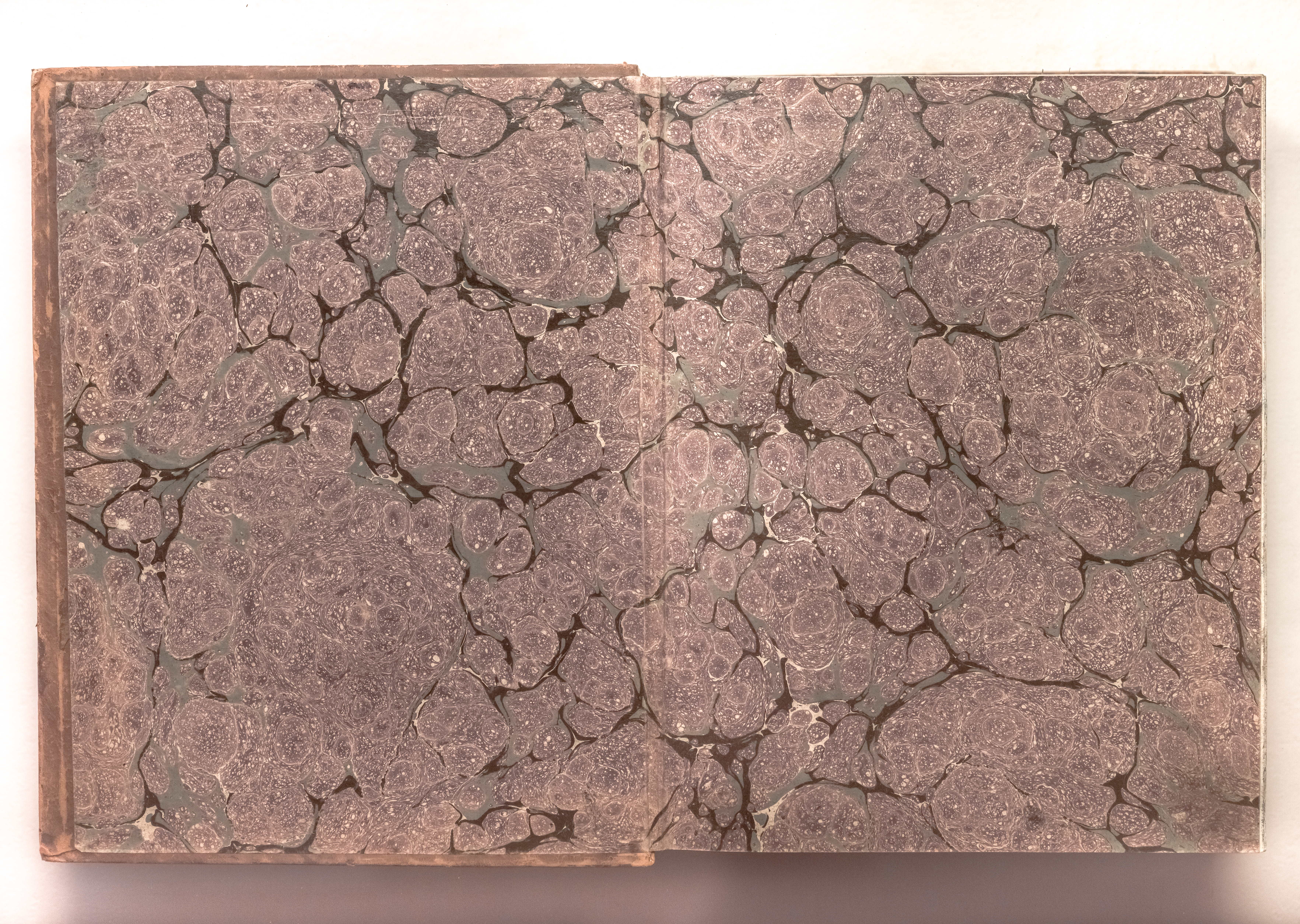 Книга в цельнокожаном владельческом переплете. Форзацы украшены бумагой с рисунком «под мрамор». Обрез тонированный. Бумага верже. Водяной знак (перепл. л.).