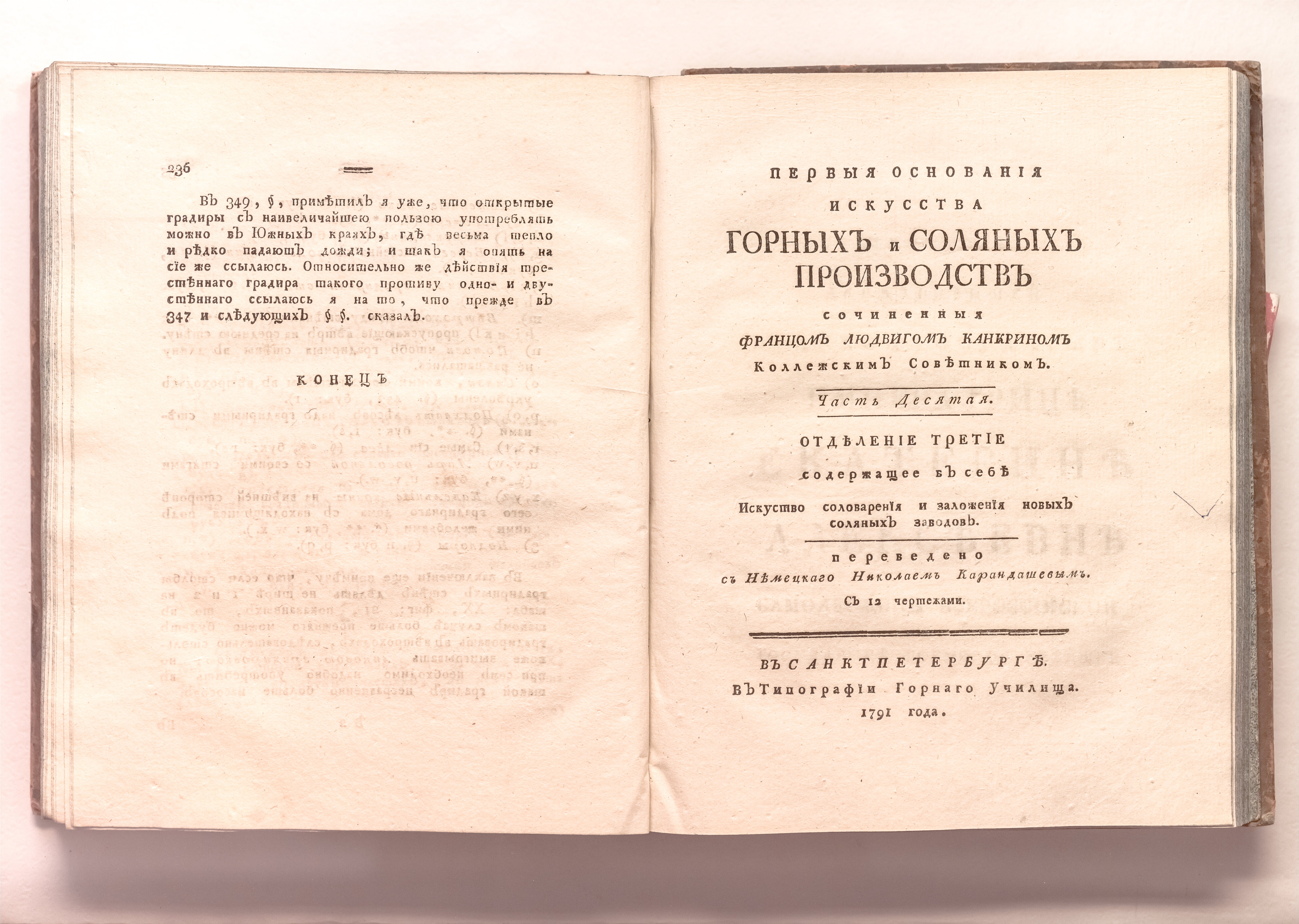 Ч. 10. Отделение третье. Содержащее в себе искусство солеварения и заложения новых соляных заводов / пер. с немецкого Николаем Карандашевым. – Санкт-Петербург : тип. Горного училища, 1791. – [4], 206 с.