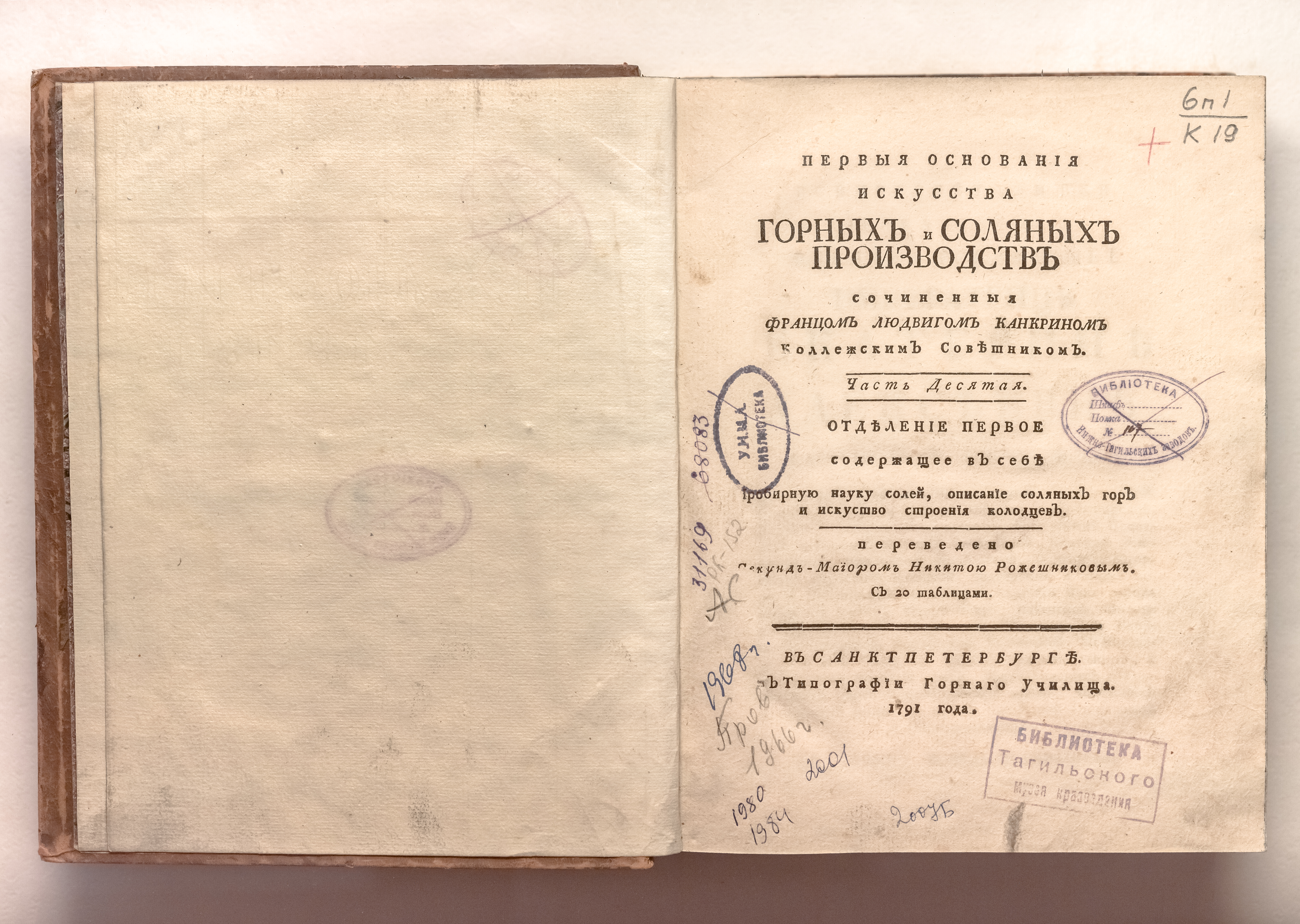 Ч. 10. Отделение первое. Содержащее в себе пробирную науку солей, описание соляных гор и искусство строения колодцев / пер. секунд-майором Никитою Рожешниковым. – Санкт-Петербург : тип. Горного училища, 1791. – [1], [IV], 337 с. : 18 л. табл.