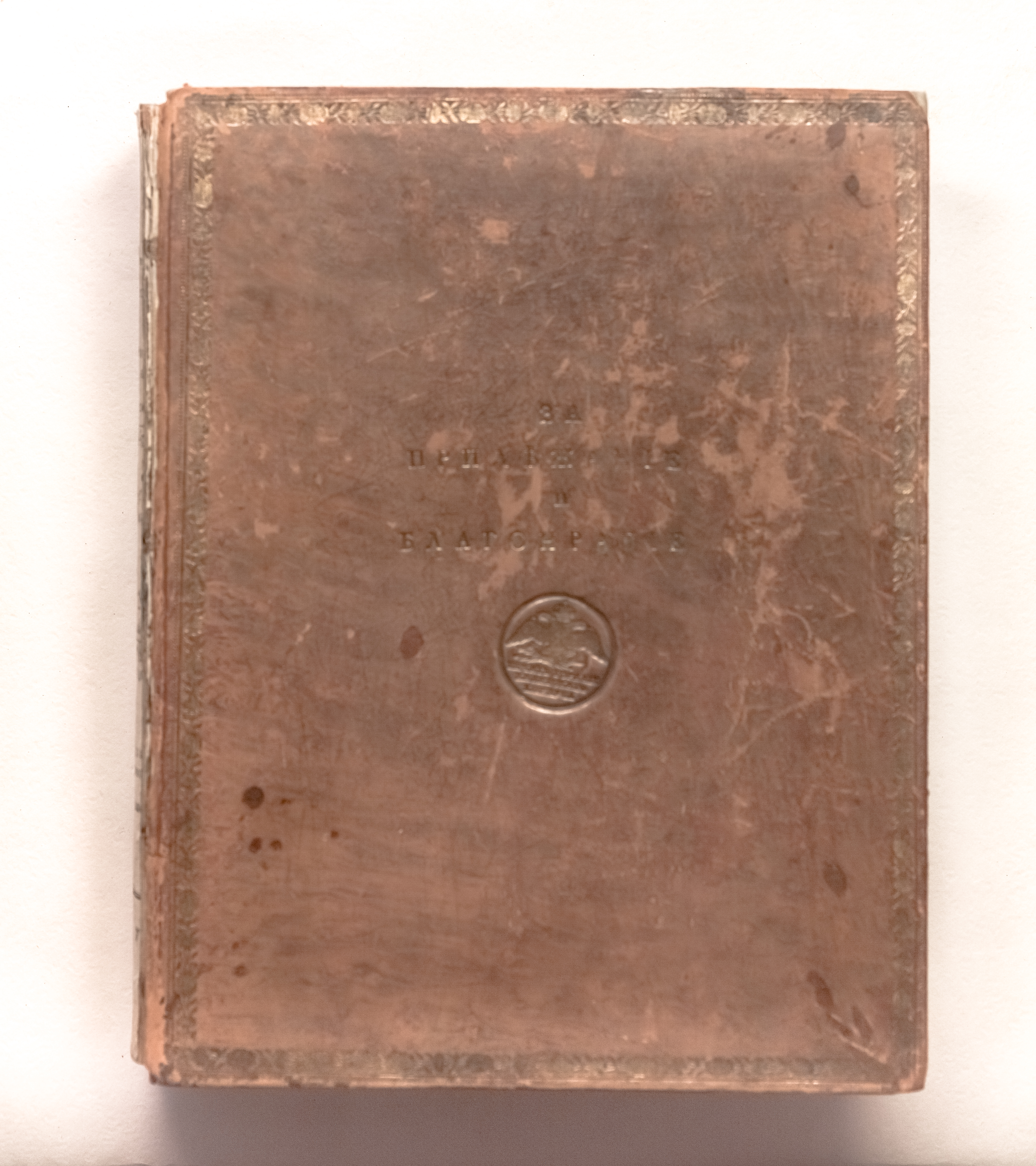 Золотисненый суперэкслибрис в виде изображения гербового орла, ниже надпись «Печать горнаго кадетскаго корпуса» (на верх. крышке переплета).