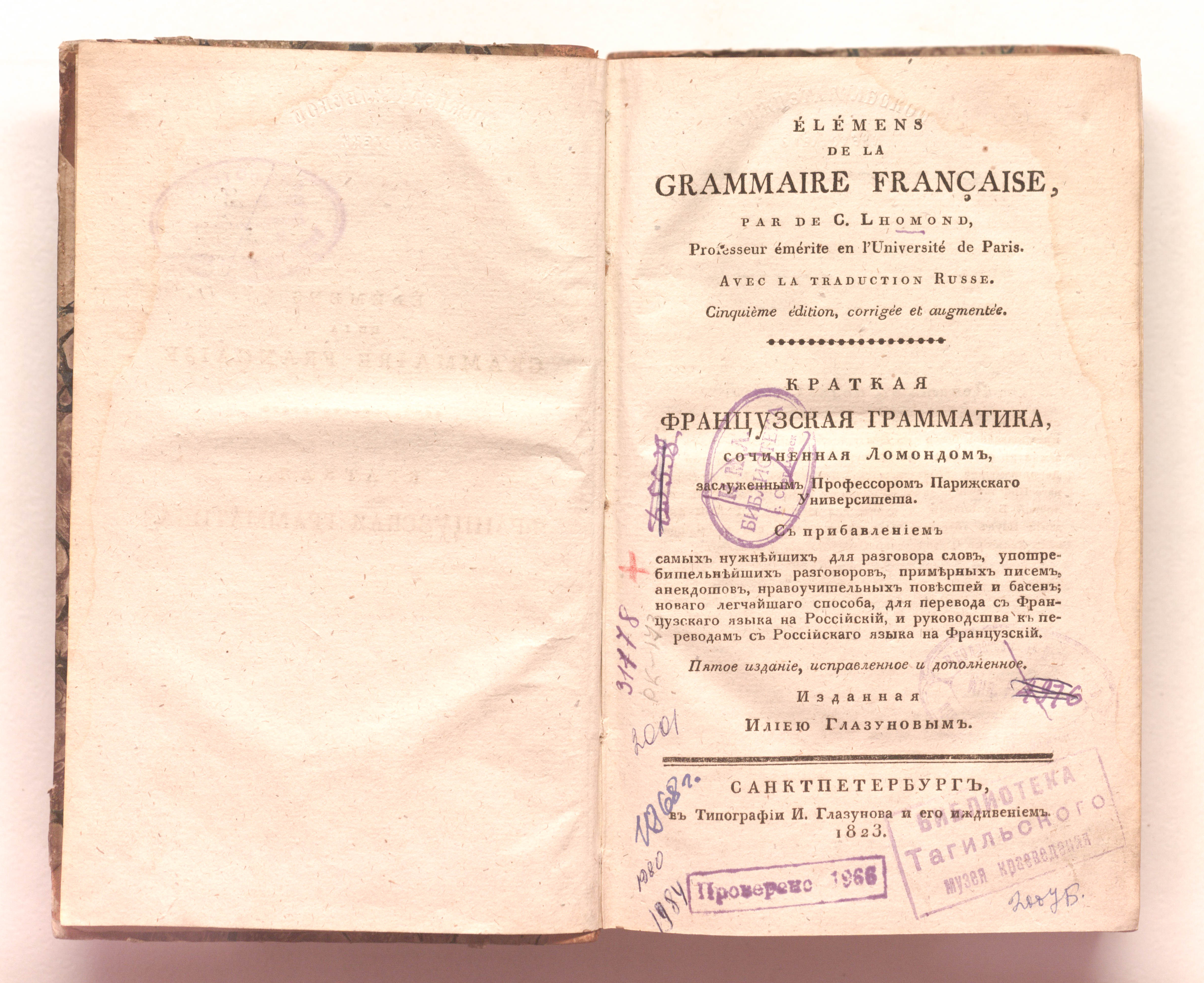 Elemens de la grammaire française = Краткая французская грамматика / Ш. Ф. Ломон. – 5-е изд., испр. и доп. – Санкт-Петербург : Изданная Илием Глазуновым, 1823. – ХVI, 515 с. : табл. ; 21х13 см.