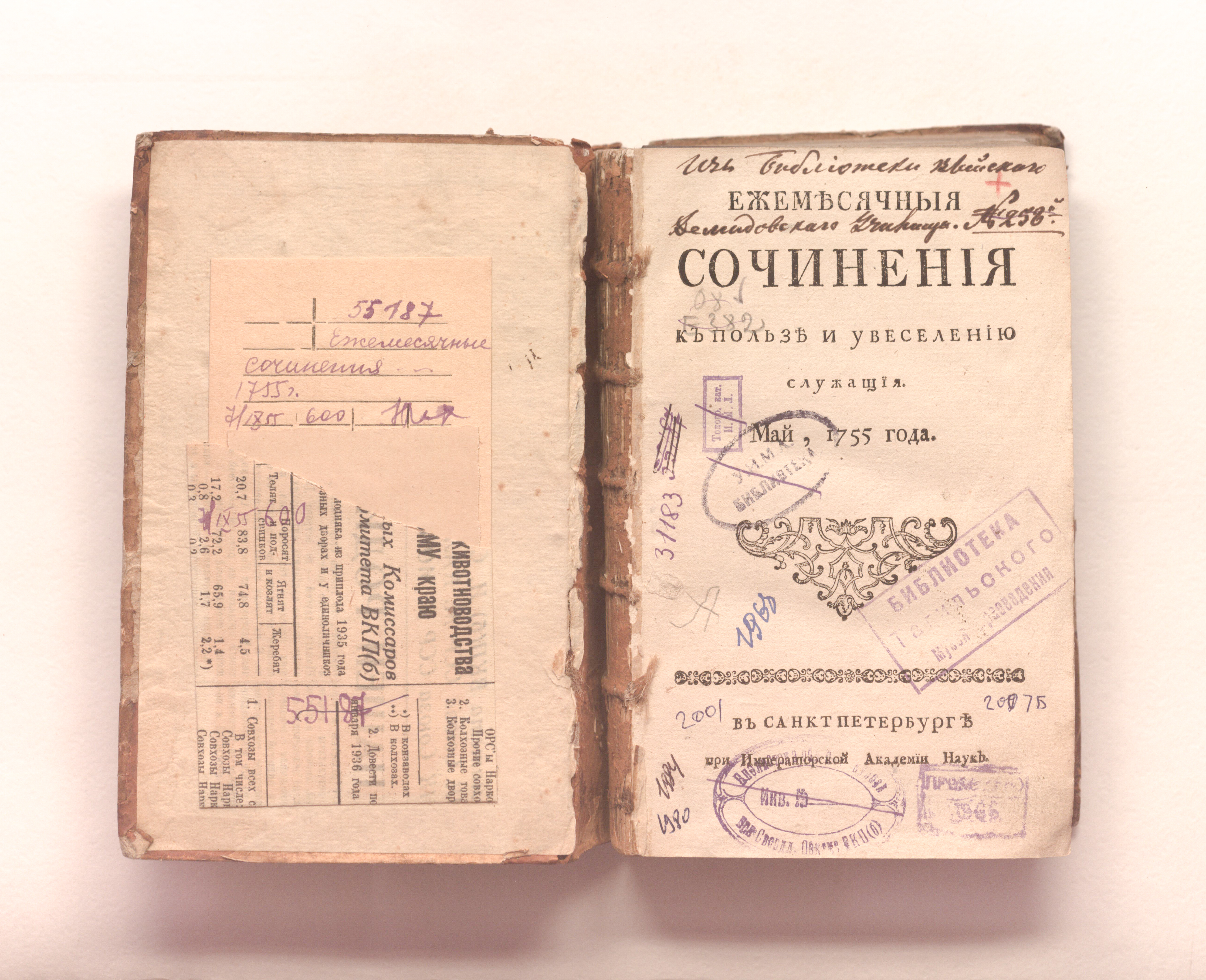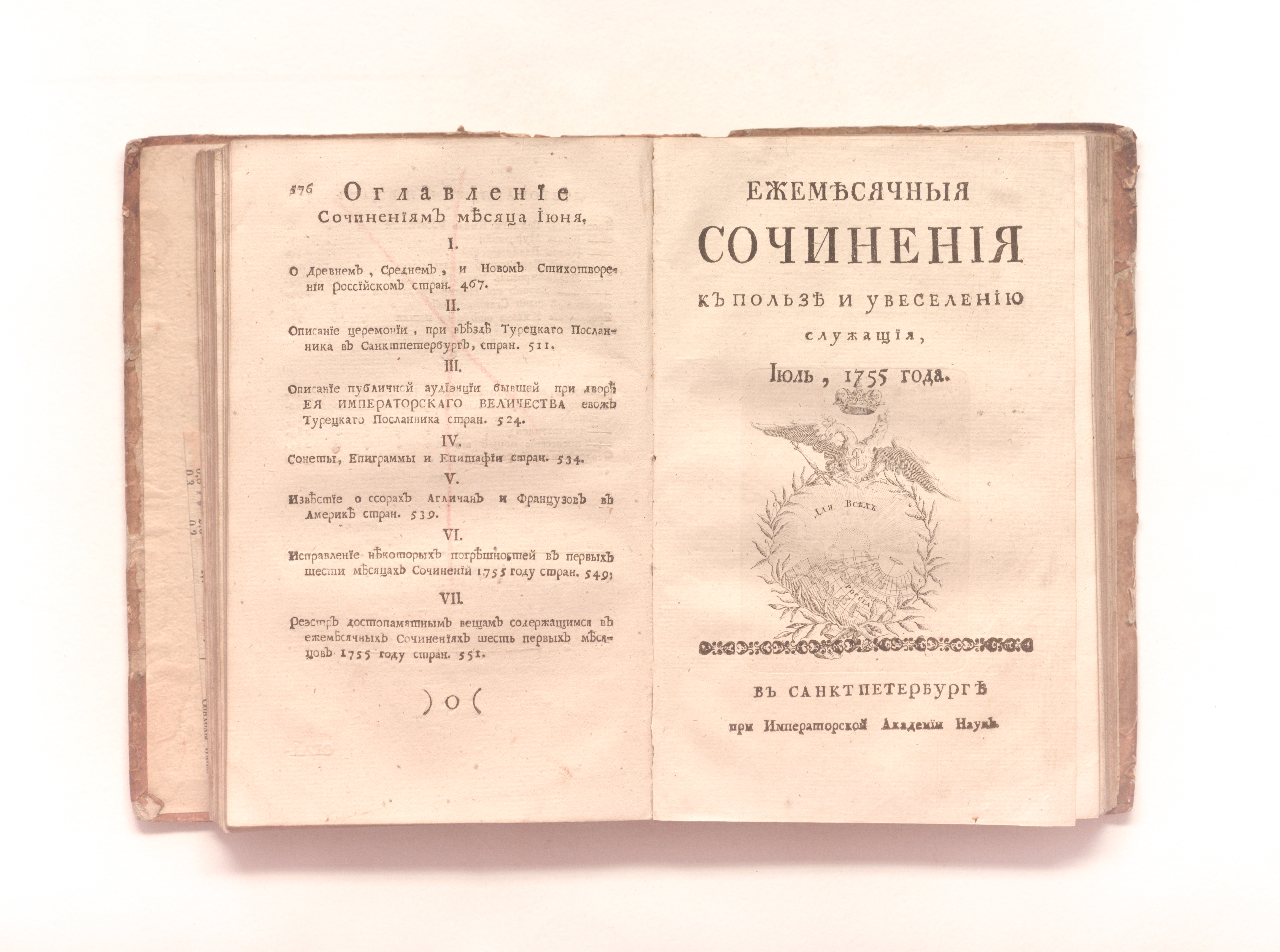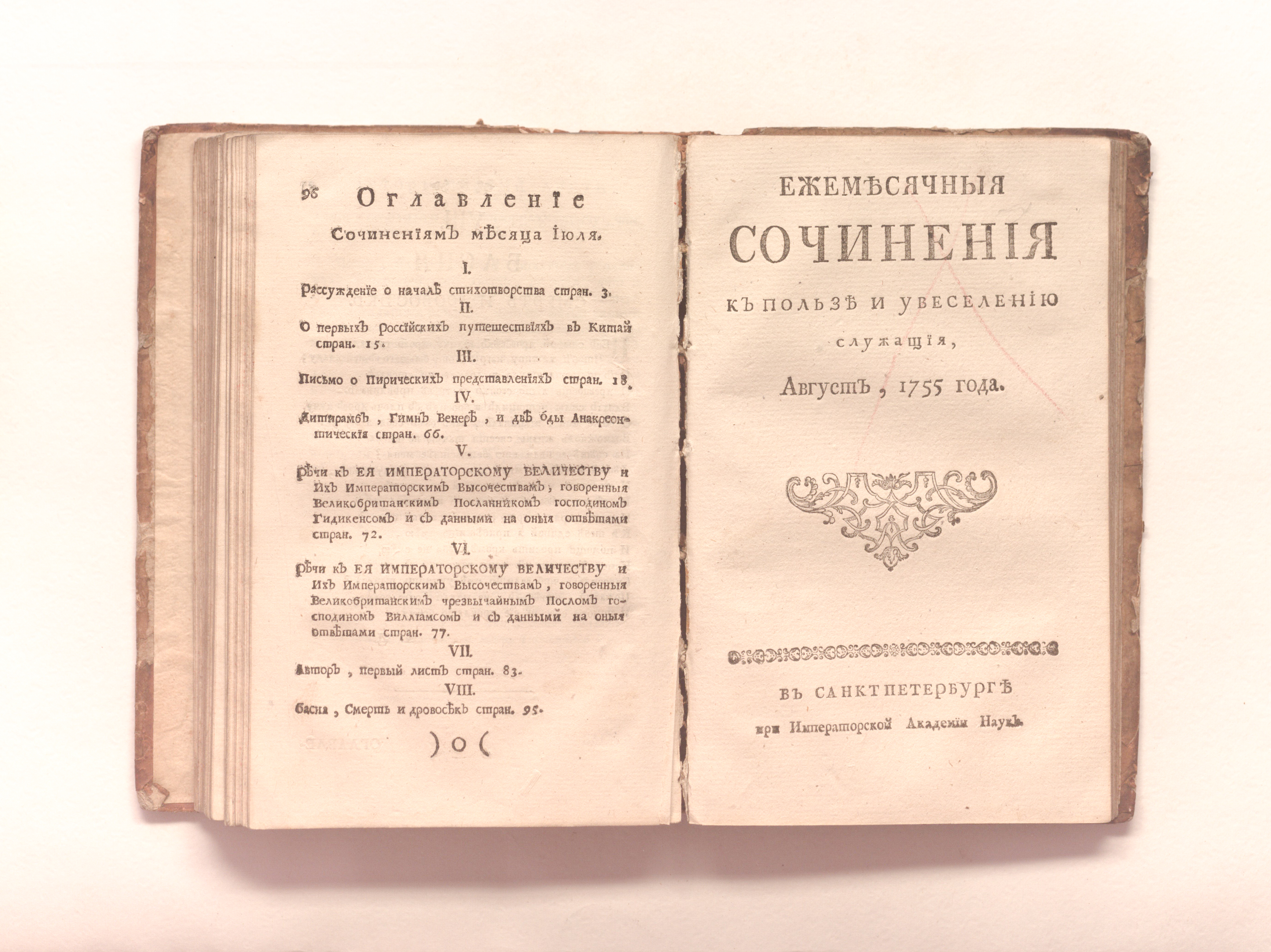 Сочинения и переводы к пользе и увеселению служащия. — Санкт-Петербург : При Императорской Академии наук. — 1755. — Май-август. — 371-576, 1-192 с. ; 19х12 см.