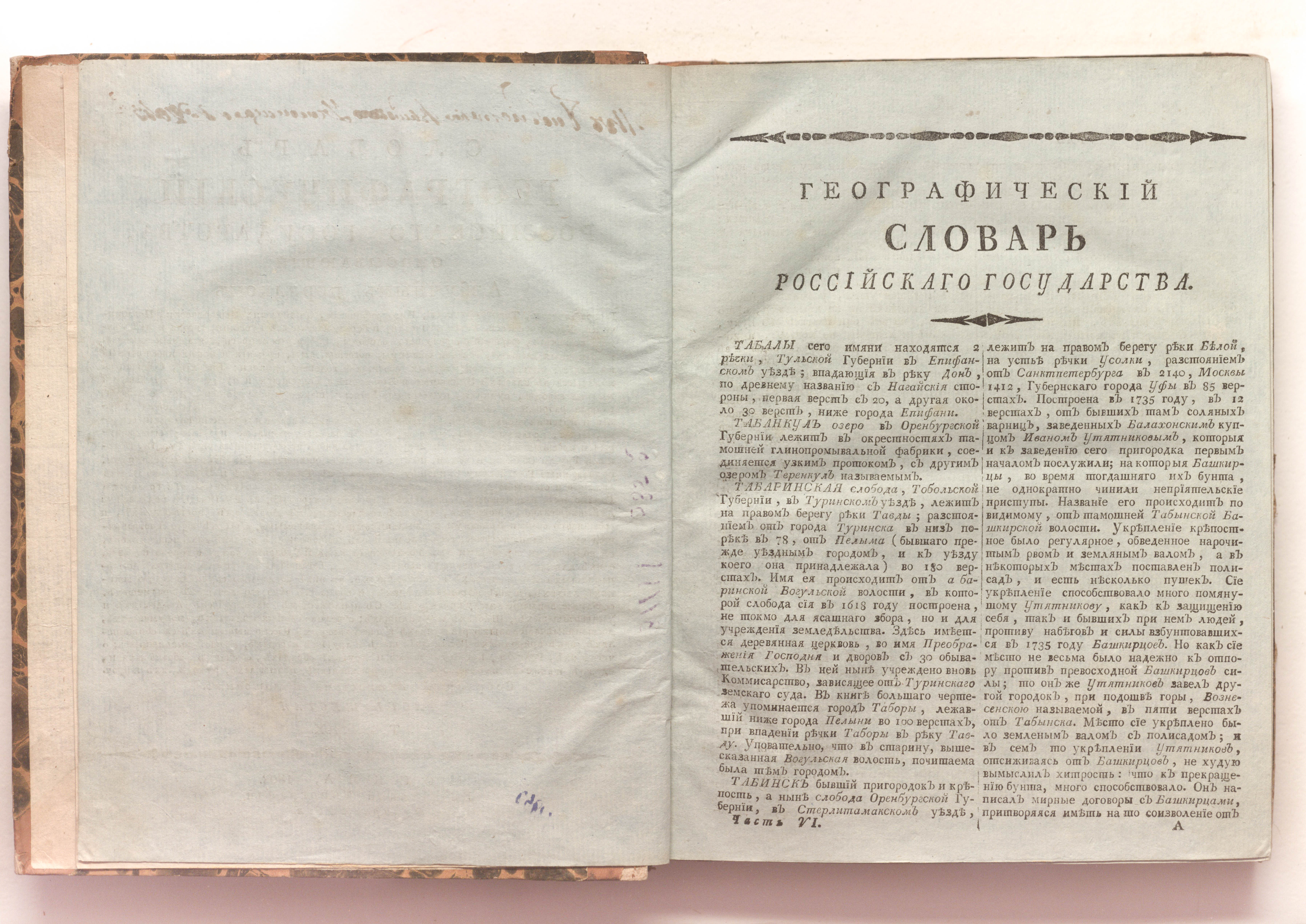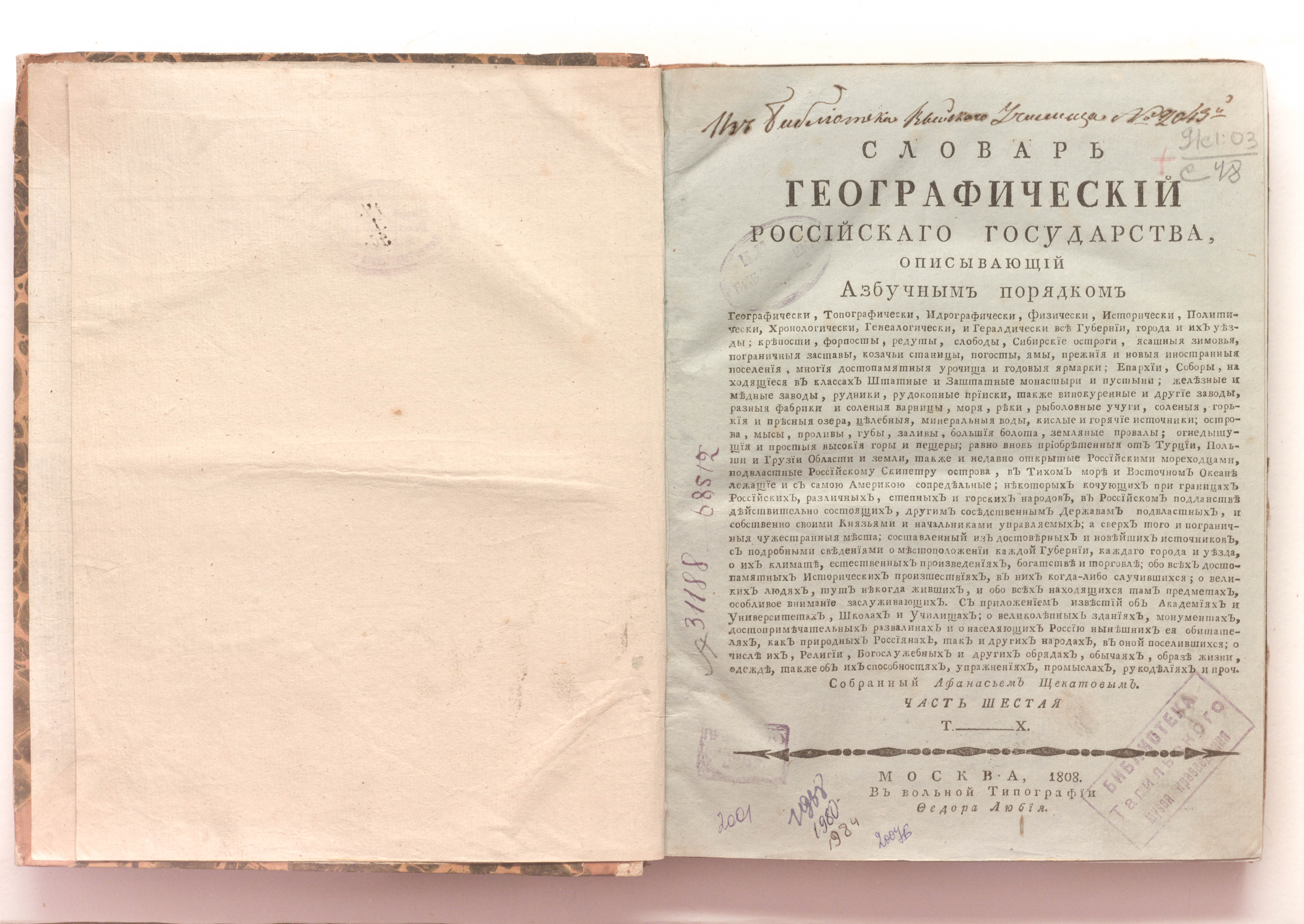Щекатов, Афанасий. Словарь географический Российского государства, описывающий азбучным порядком географически, топографически, гидрографически, физически, исторически, политически, хронологически, генеалогически и геральдически все губернии, города и их уезды… / собранный Афанасьем Щекатовым. – Ч. 6 : Т - Х. — Москва : в вольной типографии Федора Любия, 1808. – [1] c., 798 стб. : 1 л. табл. ; 26х20 см.