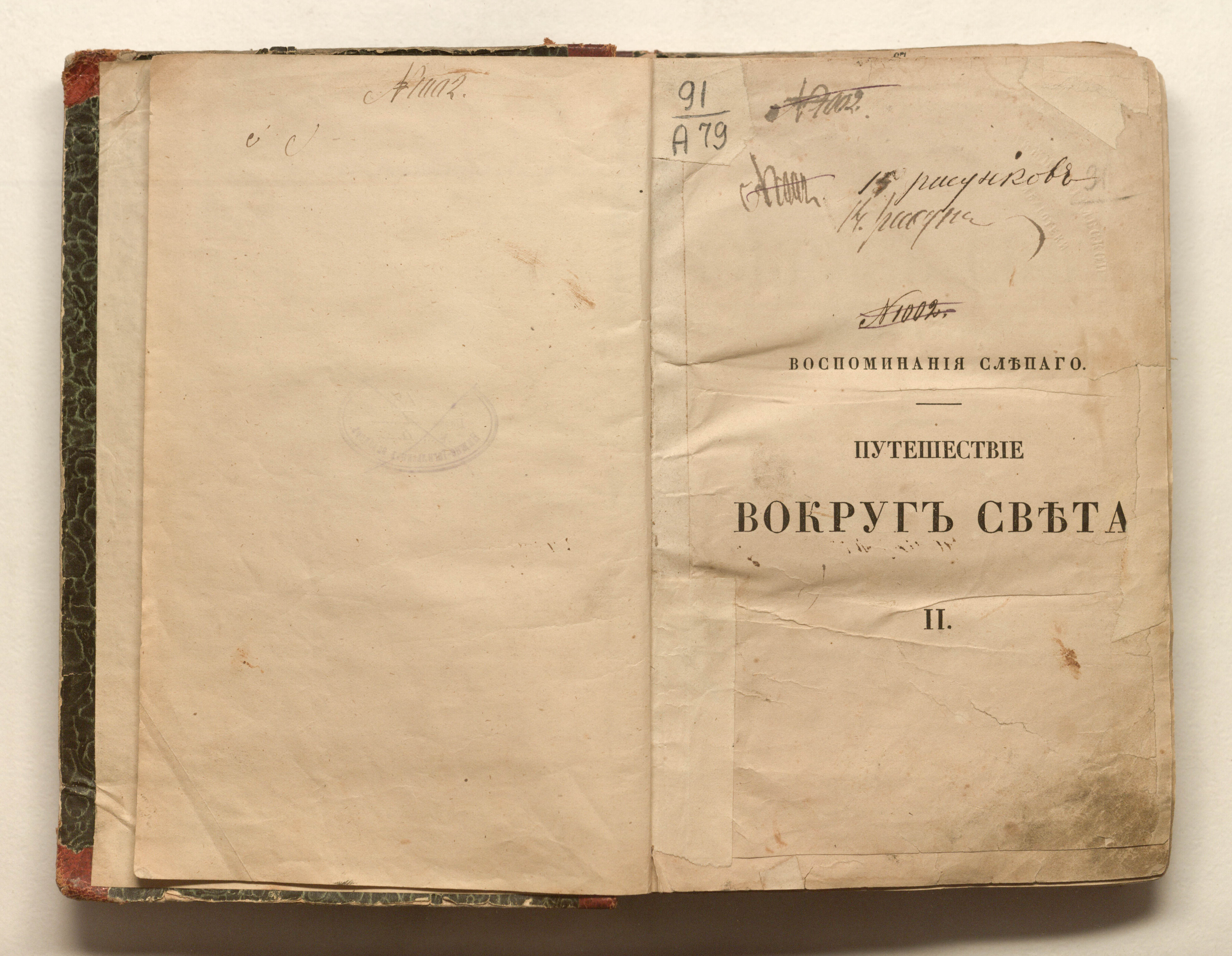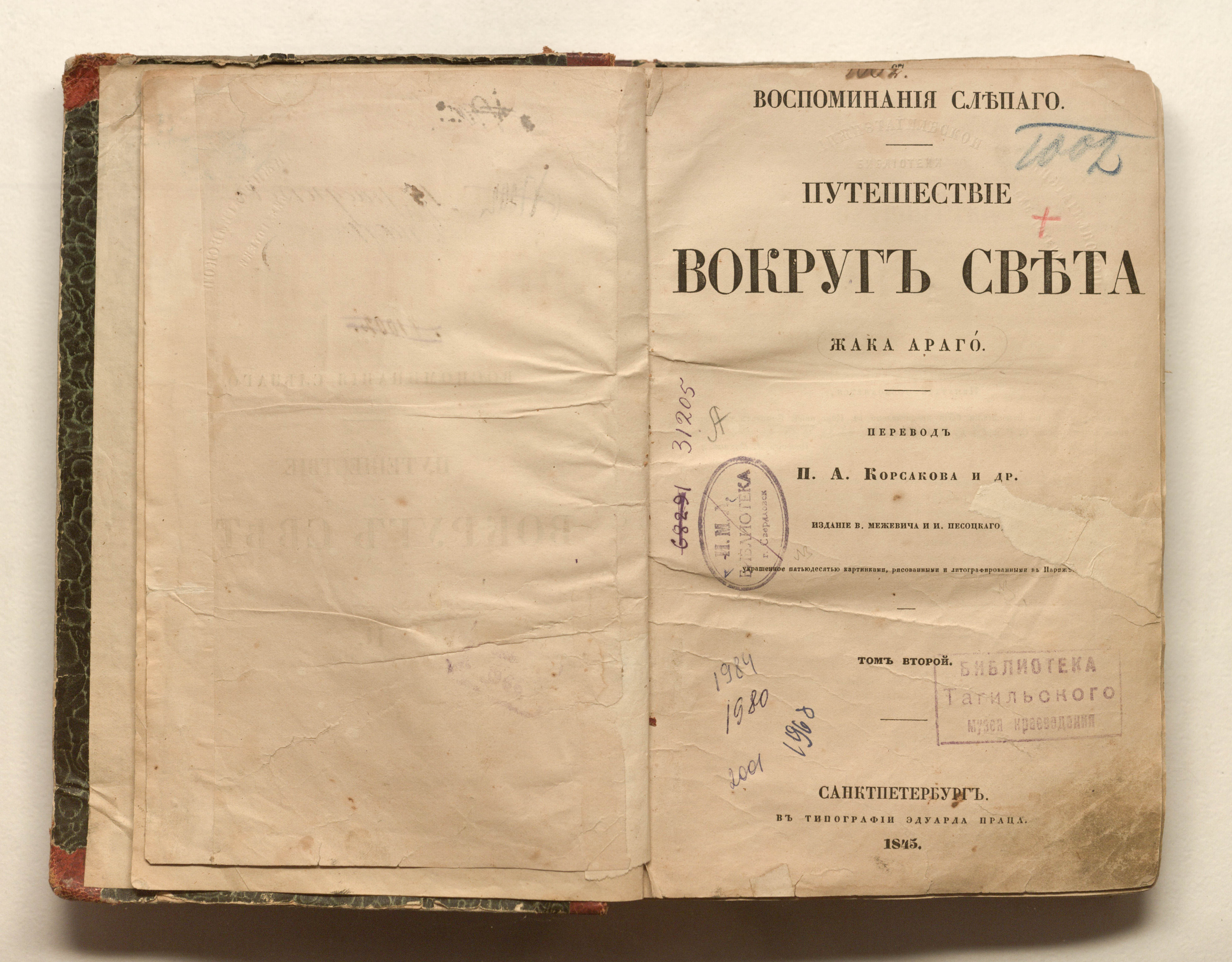 Воспоминания слепого. Путешествие вокруг света. Т. 2 : документально-художественная литература / Ж. Араго ; пер. П. А. Корсаков. — Санкт-Петербург : Типография Эдуарда Праца и К°, 1845. — [2], 320, [4] с. : ил. ; 24,5х17 см.