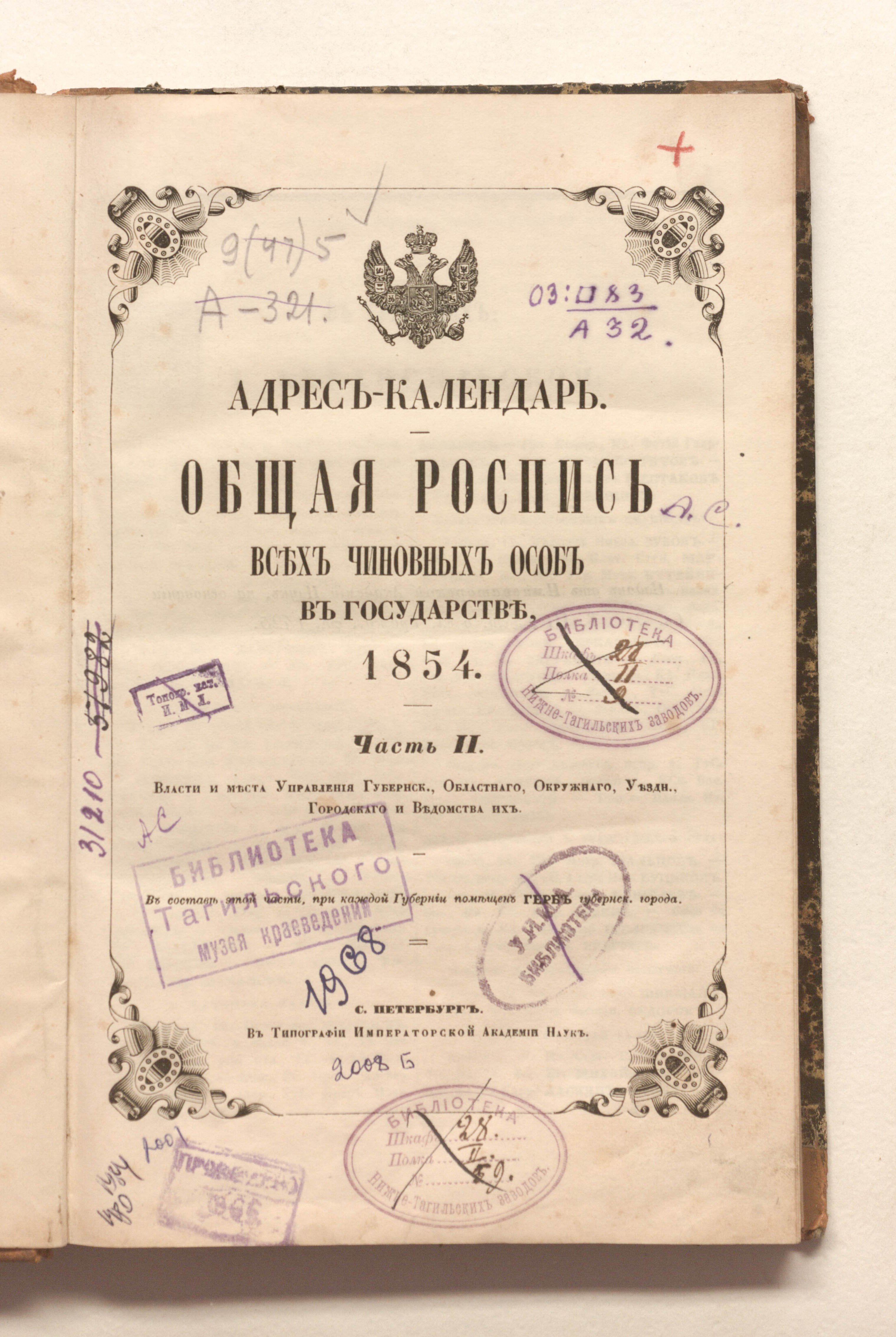 Адрес-Календарь : общая роспись всех чиновных особ в государстве. Ч. 2. — Санкт-Петербург : тип. императорской Академии наук, 1854. — 204, 3, 66 с. ; 24.5х16 см.