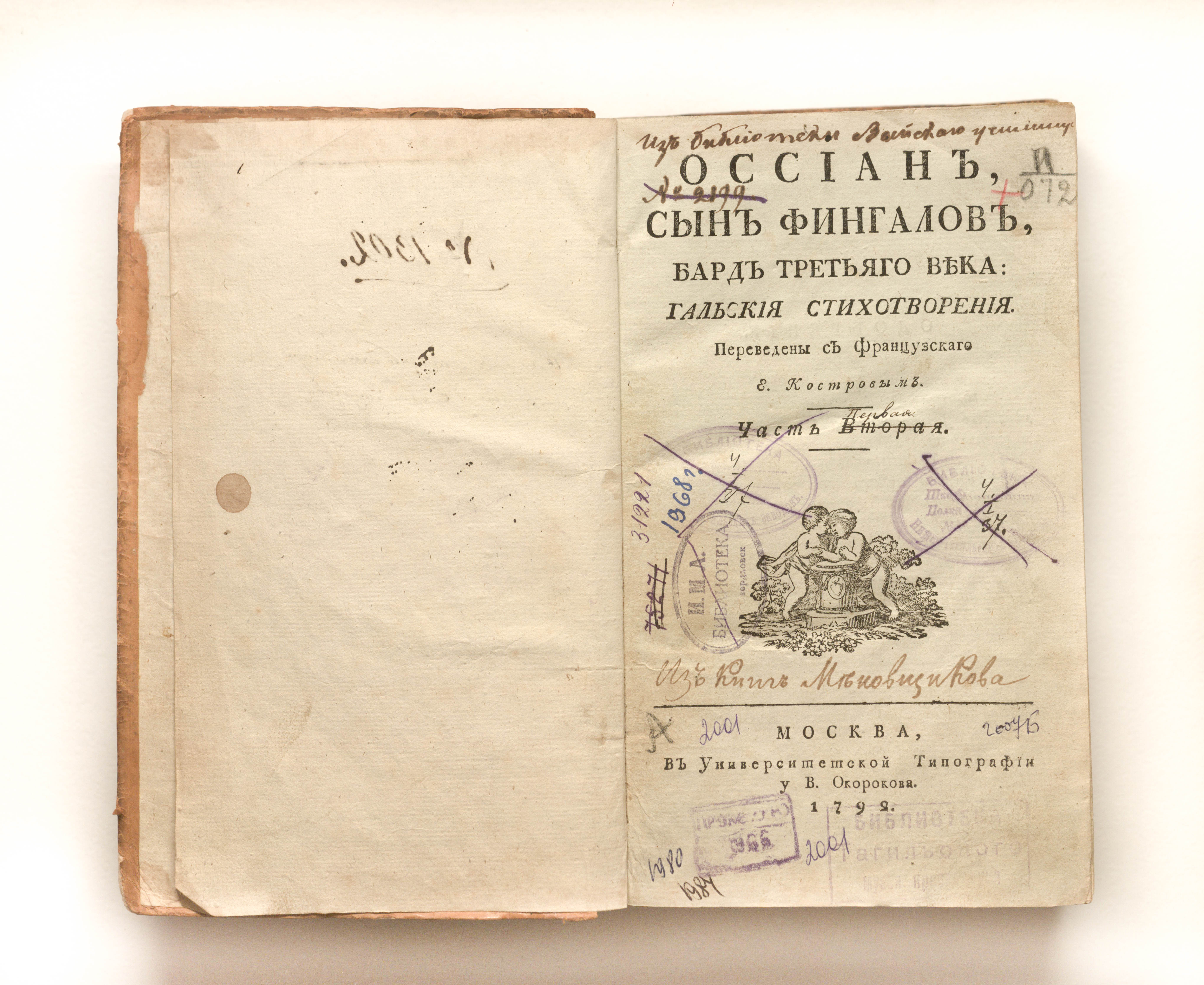 Макферсон, Джеймс (1736-1796). Оссиан, сын Фингалов, бард третьяго века: Гальския стихотворения / Д. Макферсон ; переведены с французскаго Е. Костровым. — Москва : Унив. тип., у В. Окорокова, 1792. — LXXIV, 75-363, 1-264 с. ; 22х13 см.