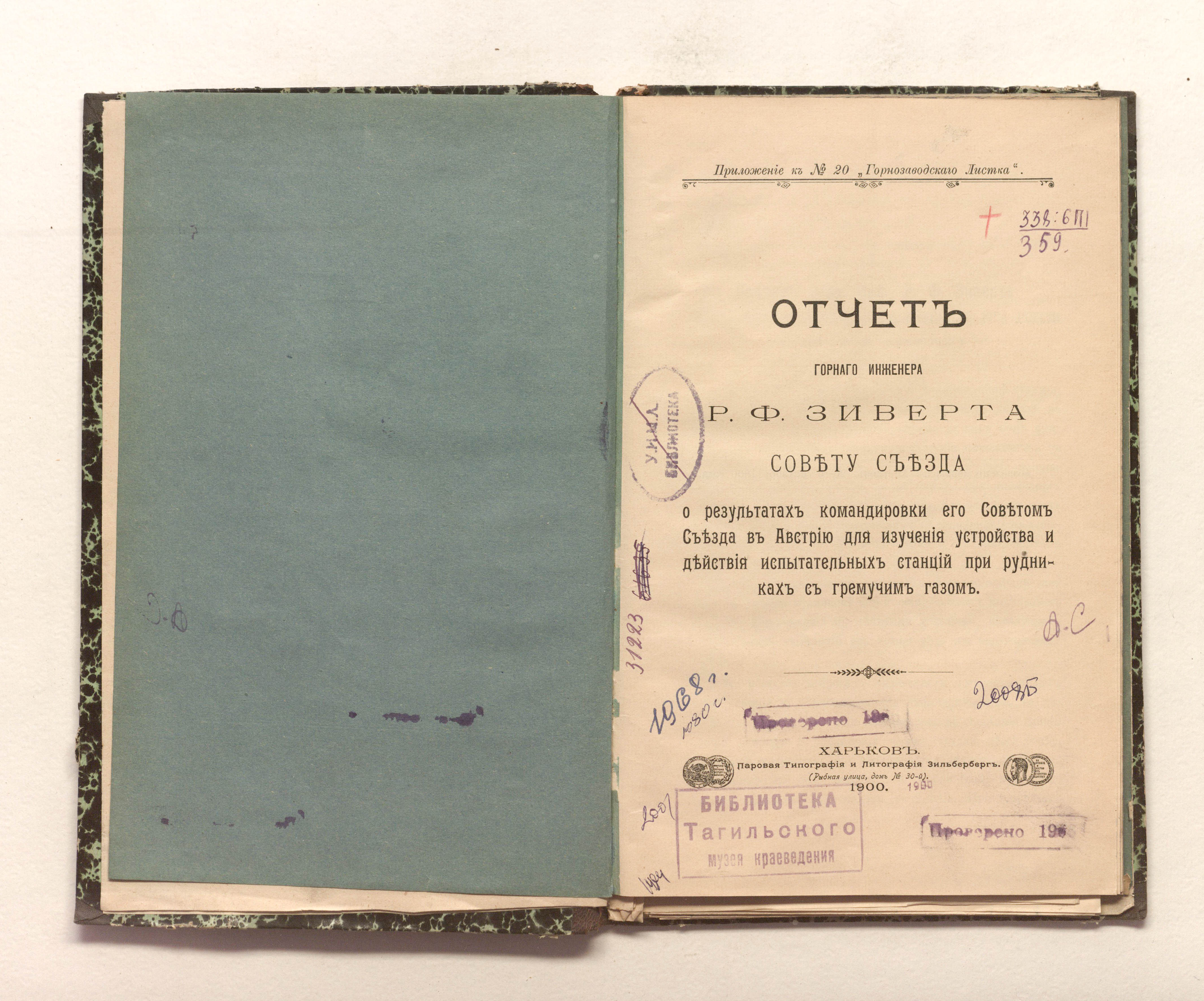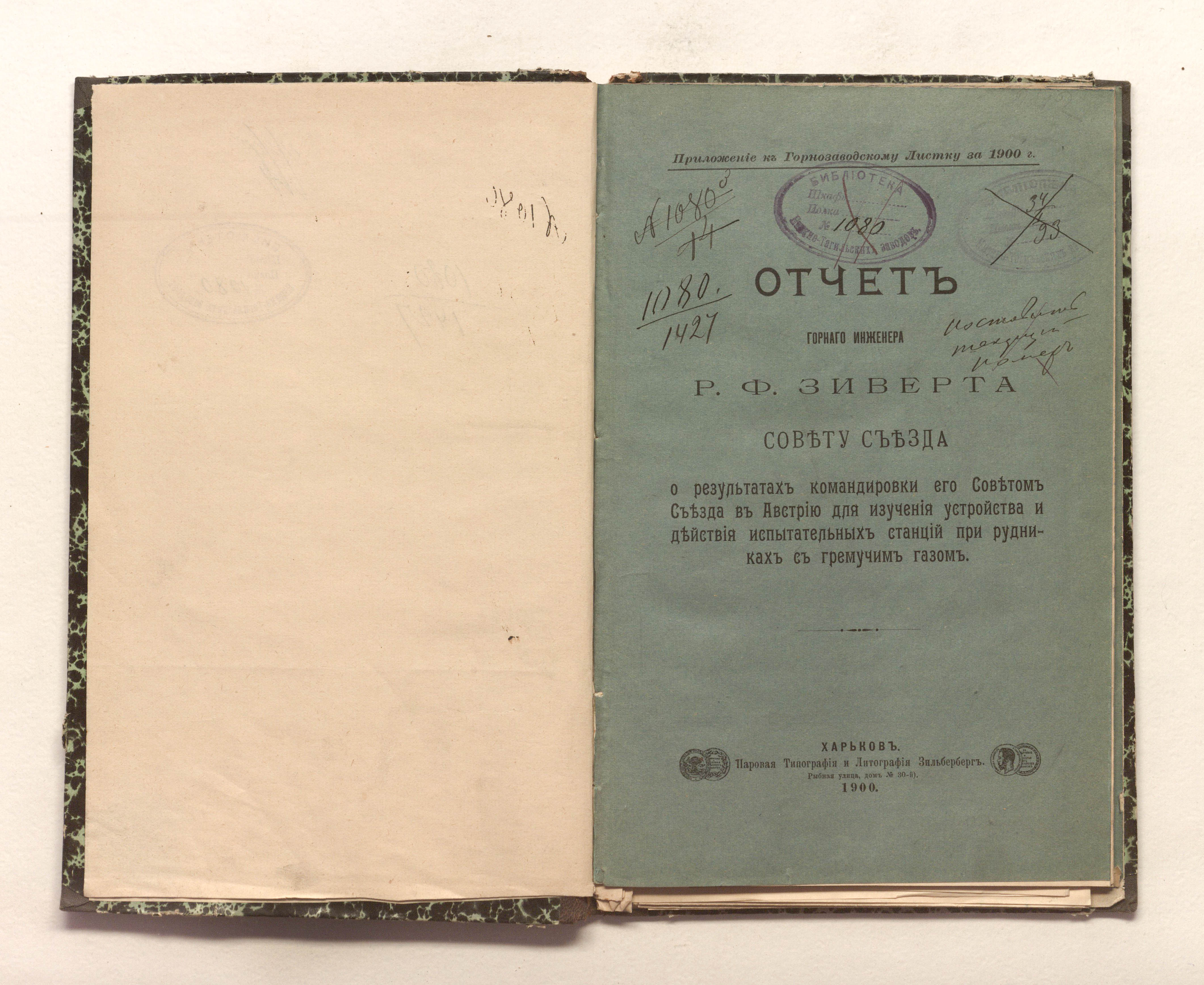Отчет горного инженера Р.Ф. Зиверта Совету Съезда о результатах командировки его Советом Съезда в Австрию для изучения устройства и действия испытательных станций при рудниках с гремучим газом / Р. Ф. Зиверт. — Харьков : паровая тип. и лит. Зильберберг, 1900. — 37 с., 8 л. табл. ; 24,5х15,5 см.