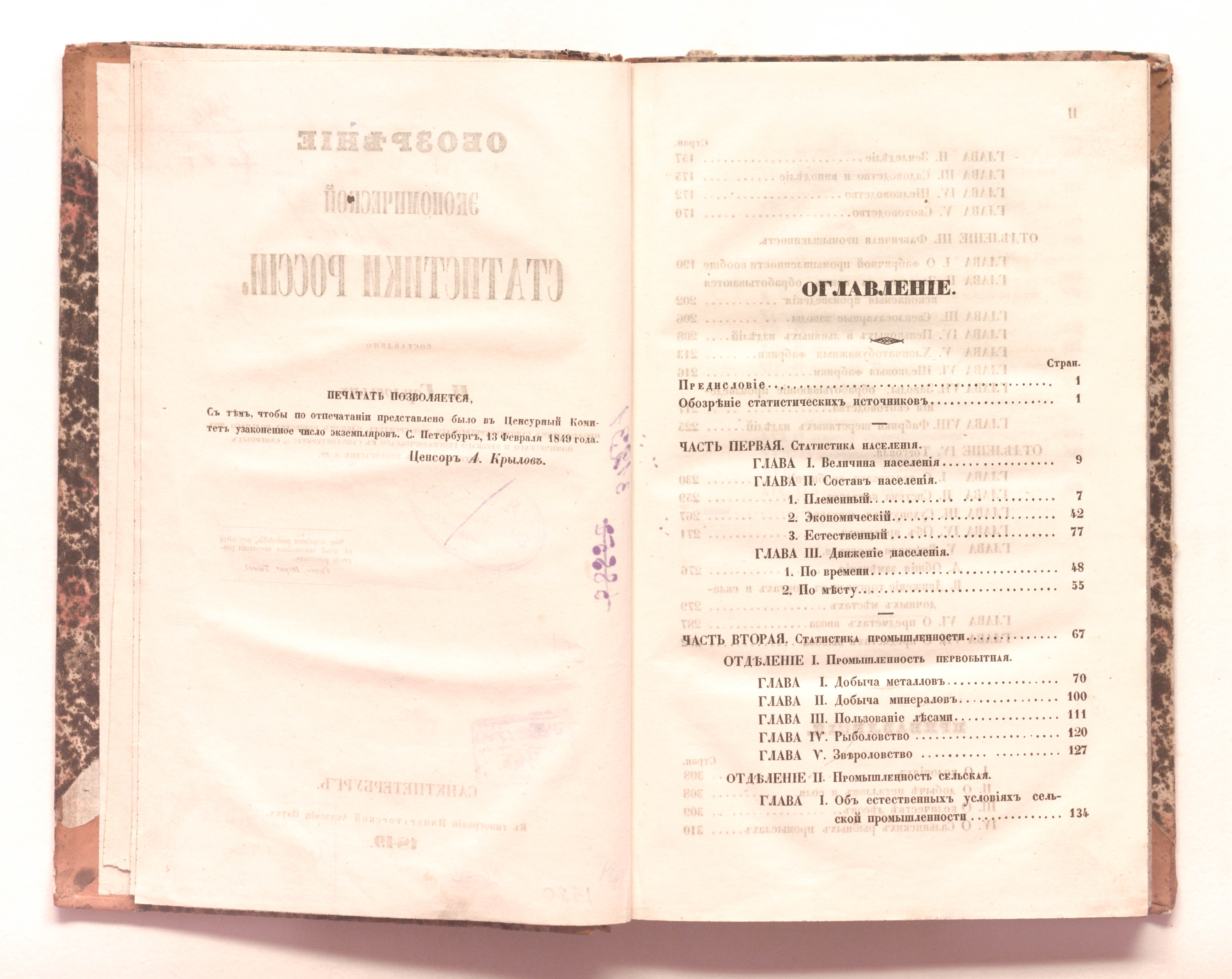 Обозрение экономической статистики России / сост. И. Горловым, проф. С.-Петерб. ун-та, чл. о-в Вольн. экон. и Рус. геогр. в С.Петербурге, Сев. антиквариев в Копенгагене и др. – Санктпетербург : в типографии Императорской академии наук, 1849. – IV, IV, 333, 4 л. табл. с. : ил. ; 23х15 см.