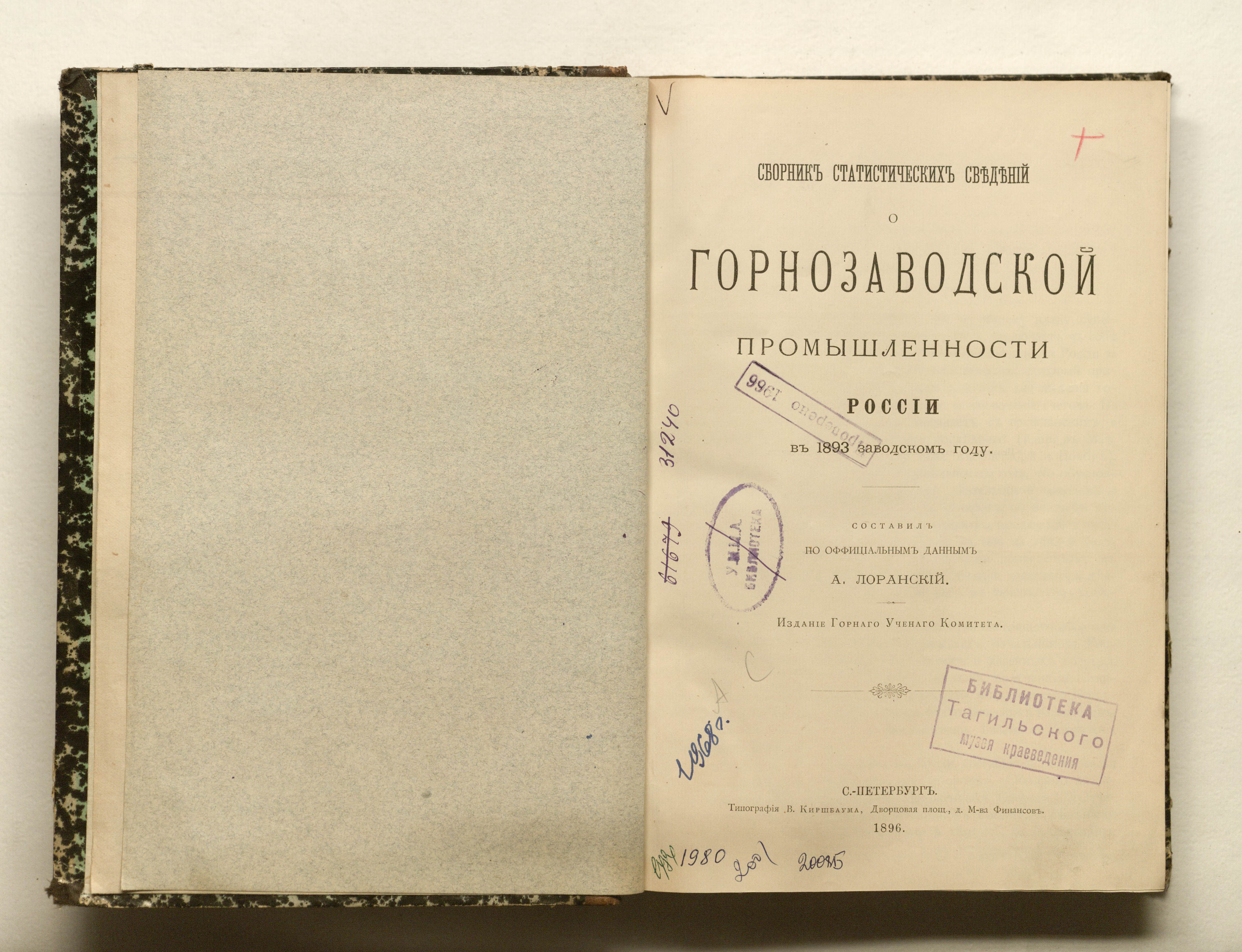 Сборник статистических сведений о горнозаводской промышленности России в 1893 году / сост. А. Лоранский. — Санкт-Петербург : тип. В. Киршбаума, 1896. — LXXXVI, 365 с. ; 25х18 см.