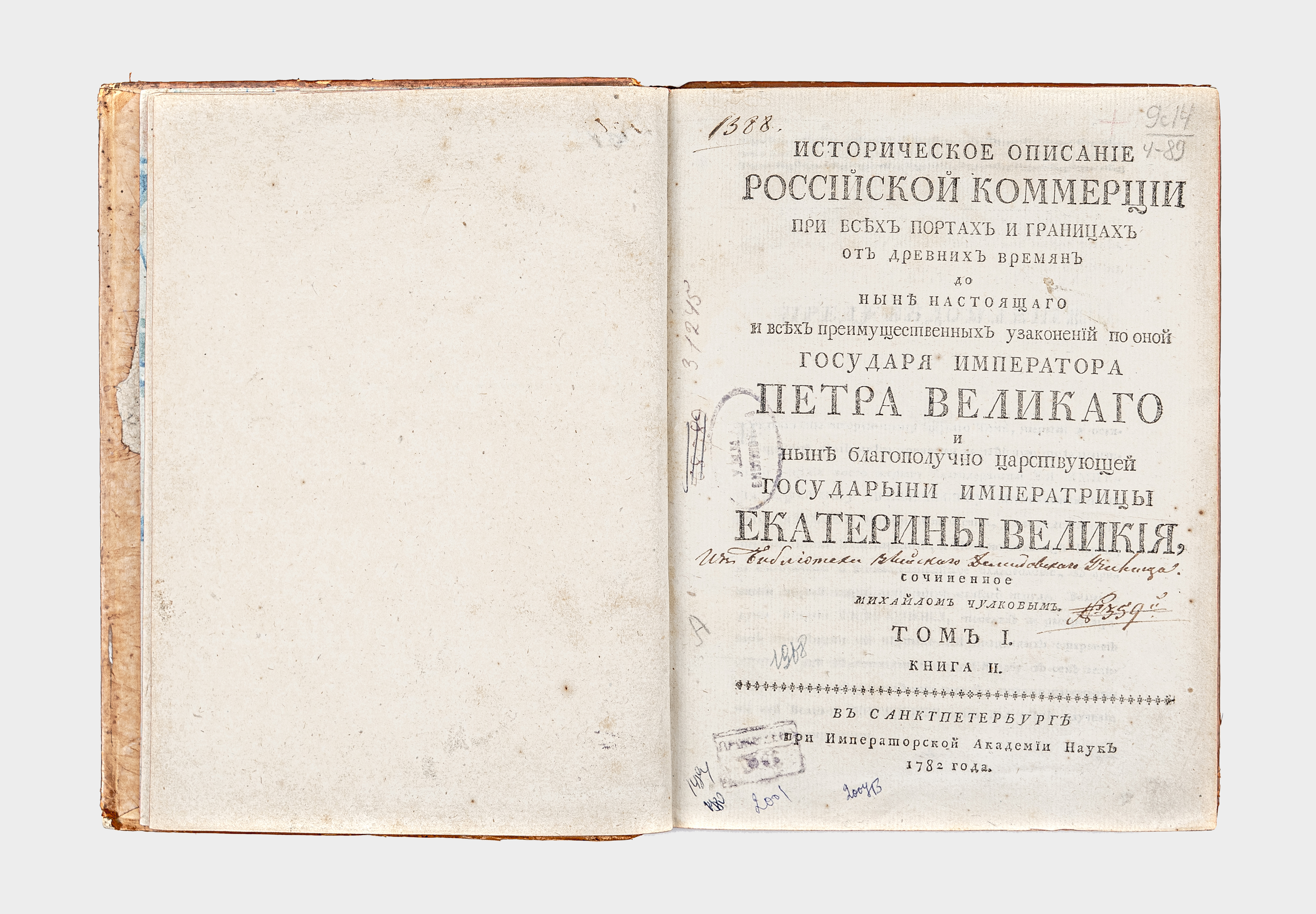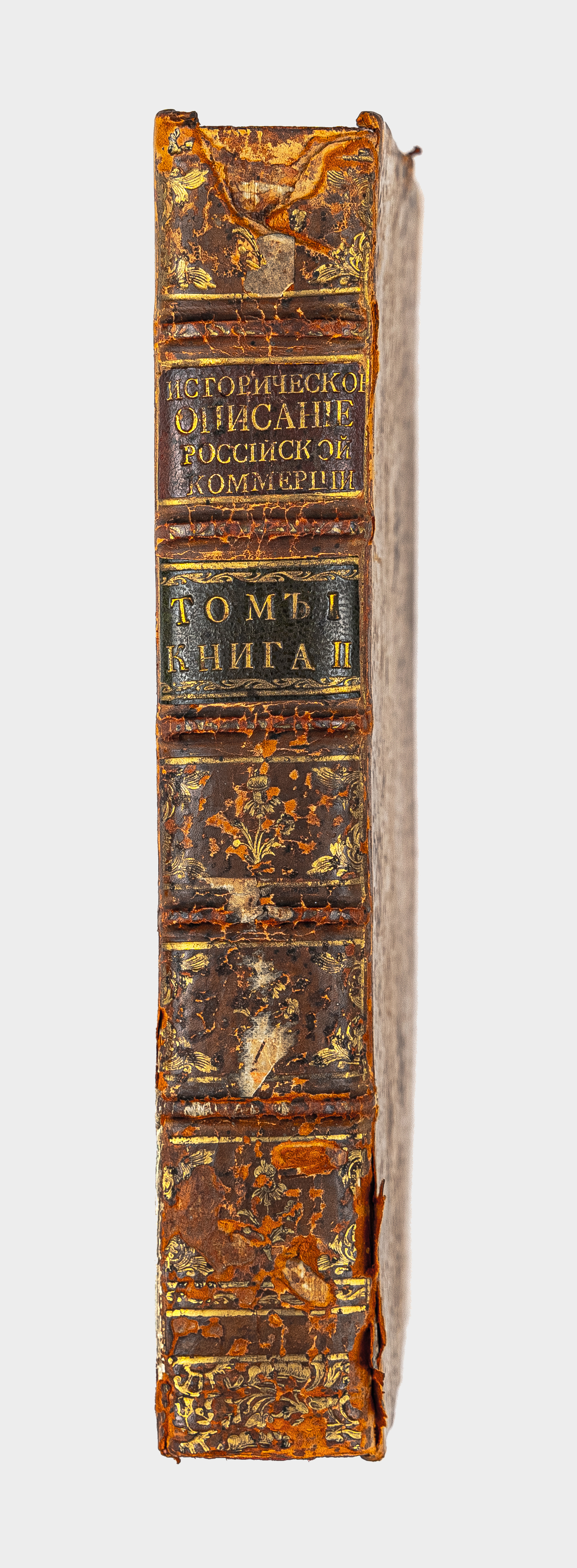 Золототисненое заглавие «Историческое описание российской коммерции. Том I, Книга II» (на корешке перепл.).