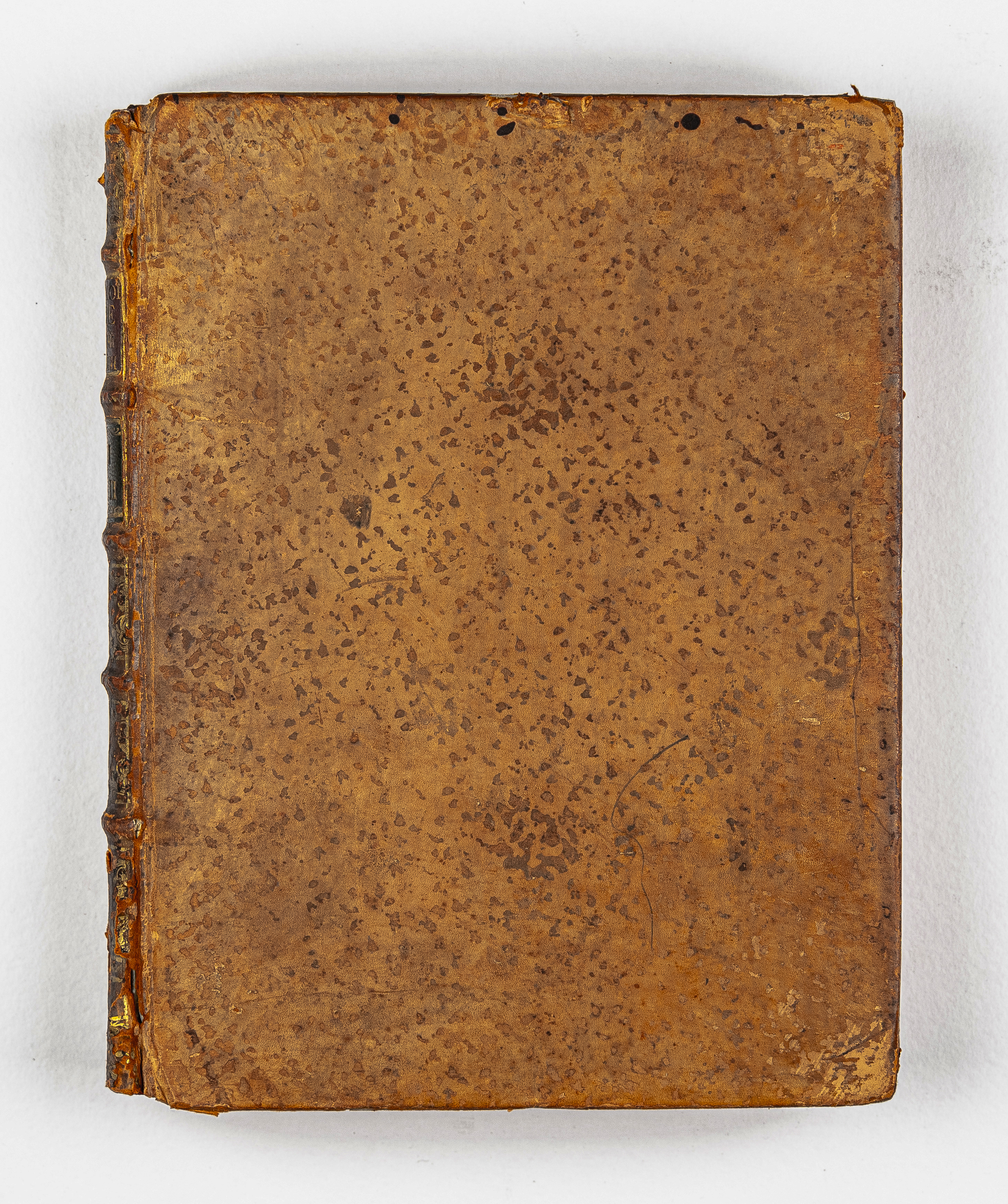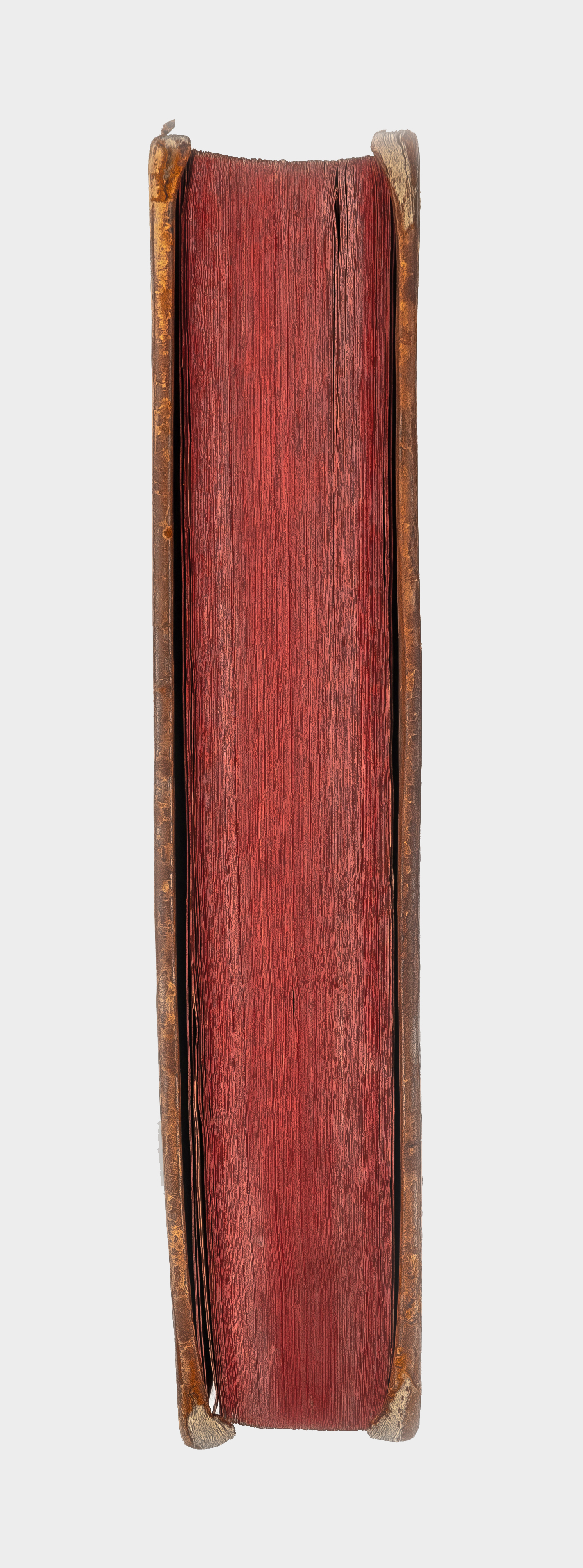 Книга в цельнокожаном владельческом переплете. Обрез тонированный. Бумага верже. Водяной знак (перепл. листы). Форзацы украшены бумагой с рисунком «павлинье перо».