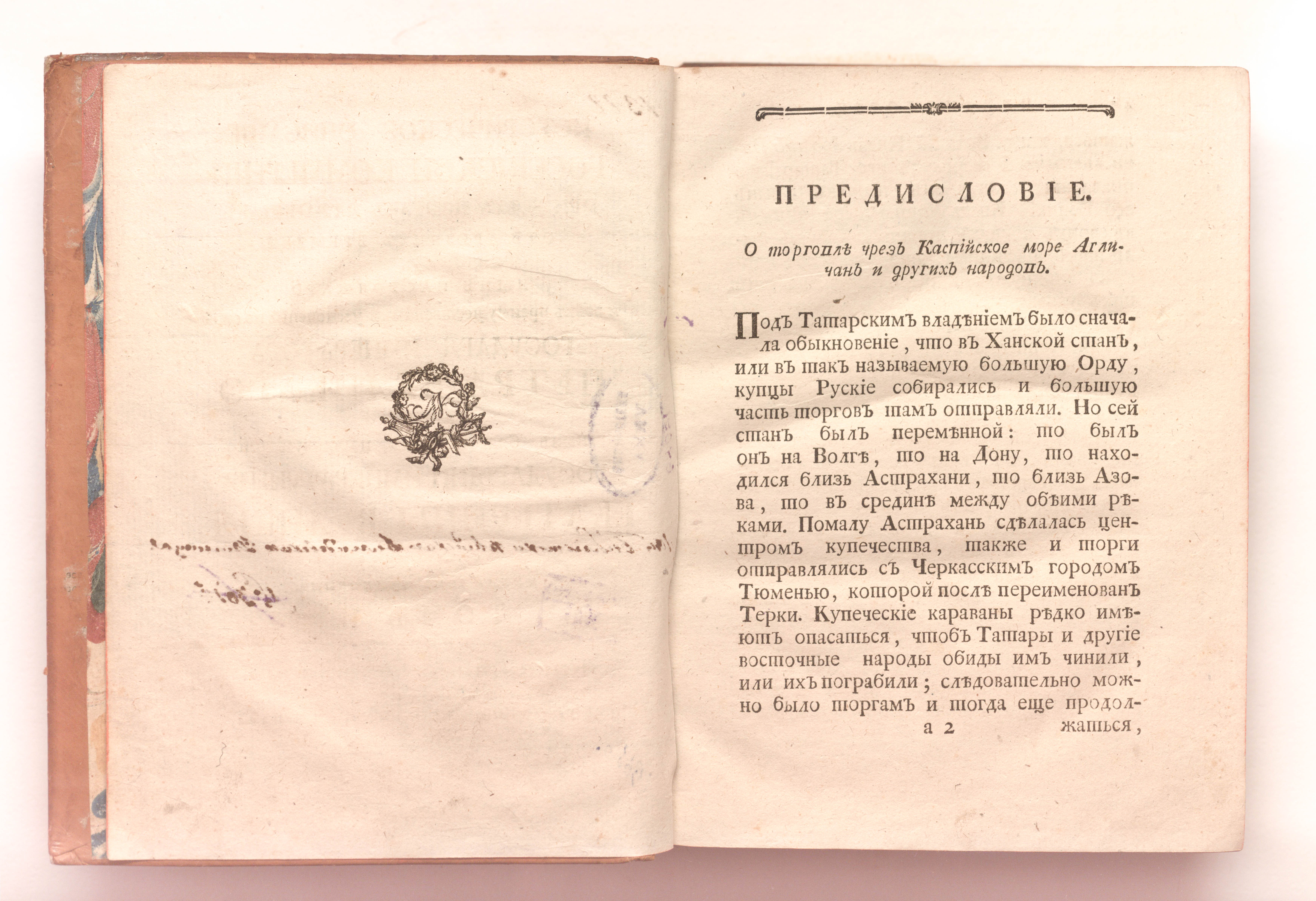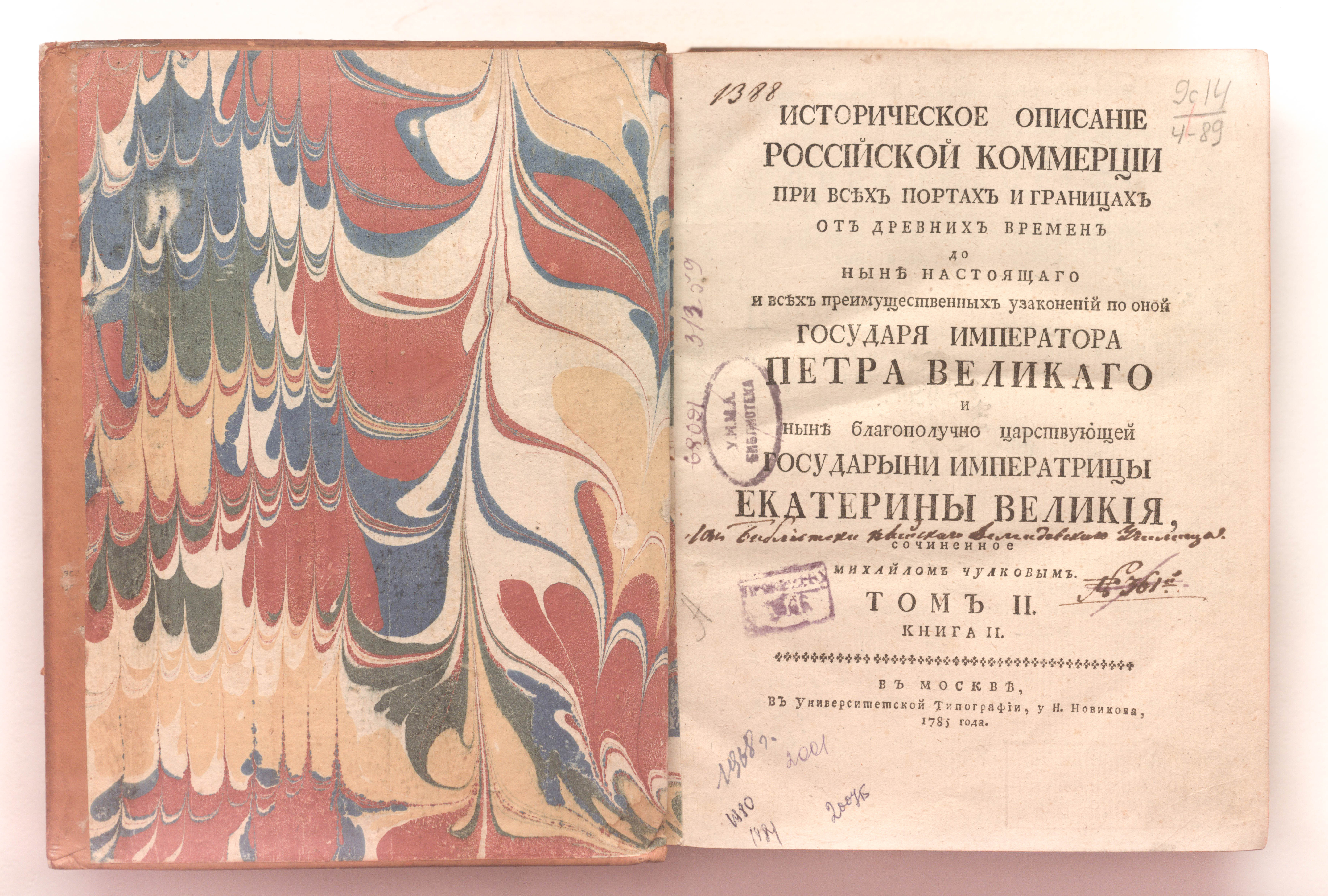 Золототисненое заглавие «Историческое описание российской коммерции. Том II, Книга II» (на корешке перепл.).