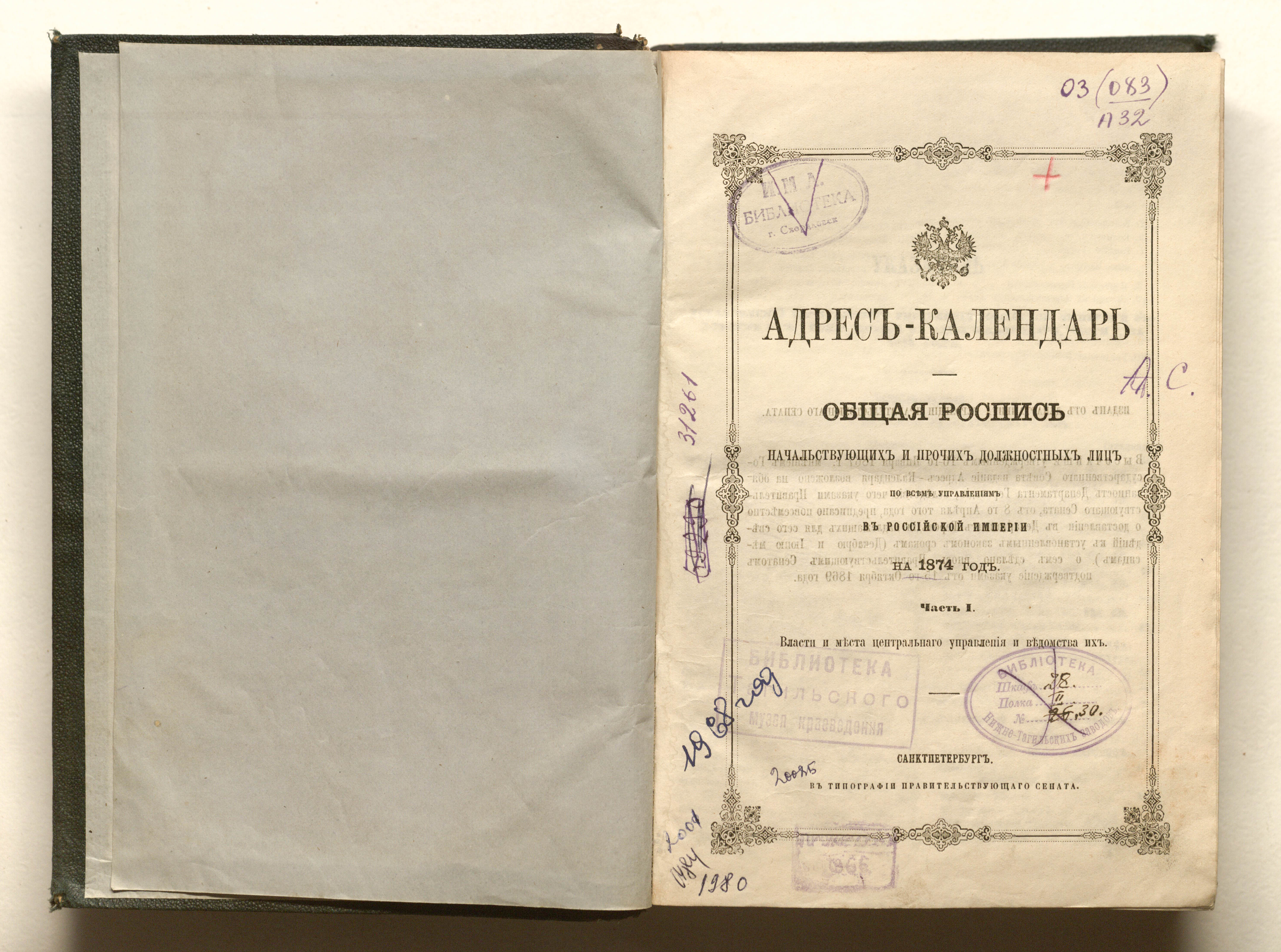 Адрес-календарь : общая роспись начальствующих и прочих должностных лиц по всем управлениям в Российской Империи на 1874 год. Ч. 1, 2. — Санкт-Петербург : в типографии Правительствующего Сената, 1874. — разд. пагинация ; 24,5х16,5 см.
