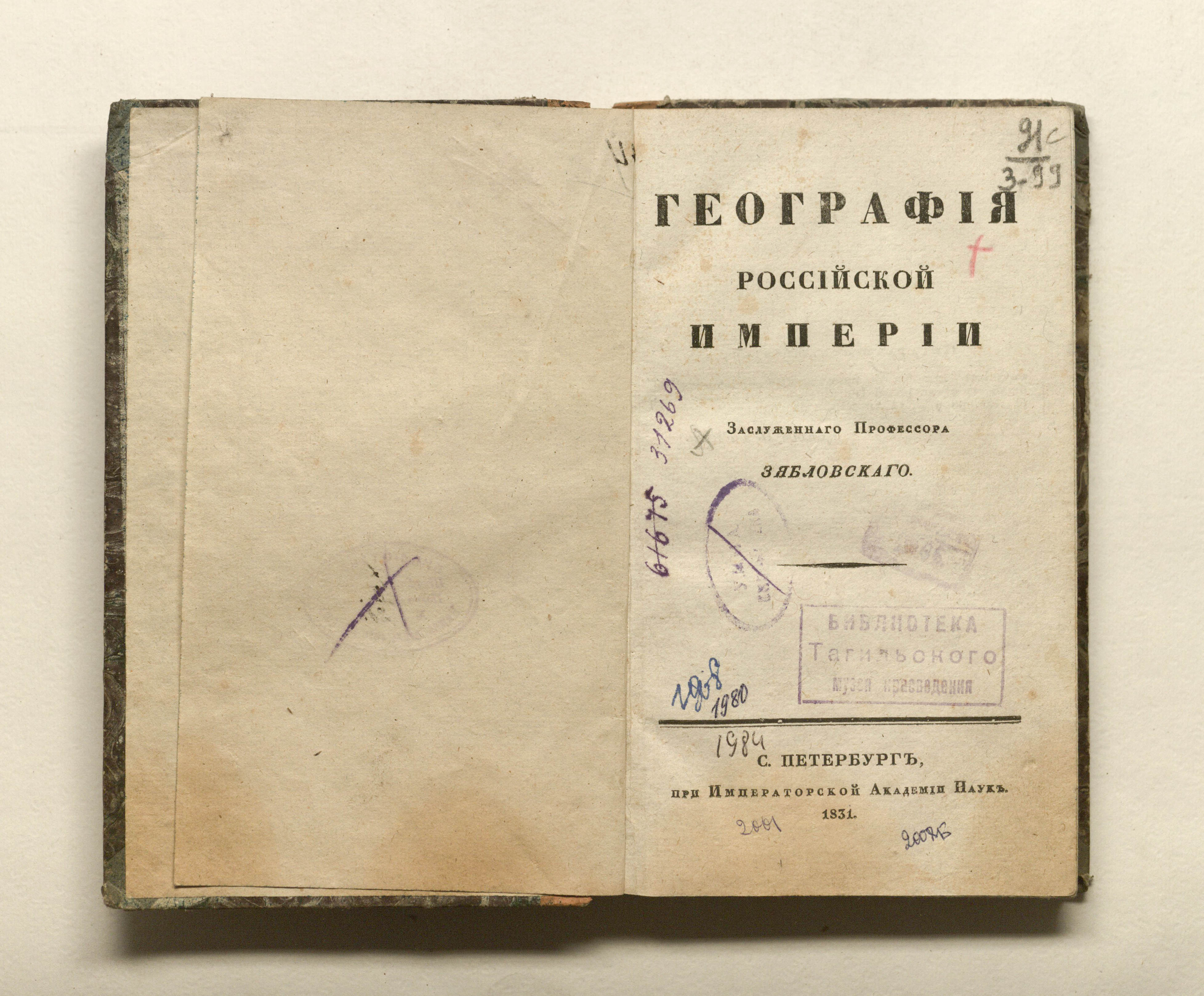 Зябловский, Евдоким Филиппович (1765 - 1846). География Российской империи / [Соч.] Заслуж. проф. Зябловского. — Санкт-Петербург : тип. Имп. Акад. наук, 1831. — [2], IV, 167 с. ; 21х13 см.